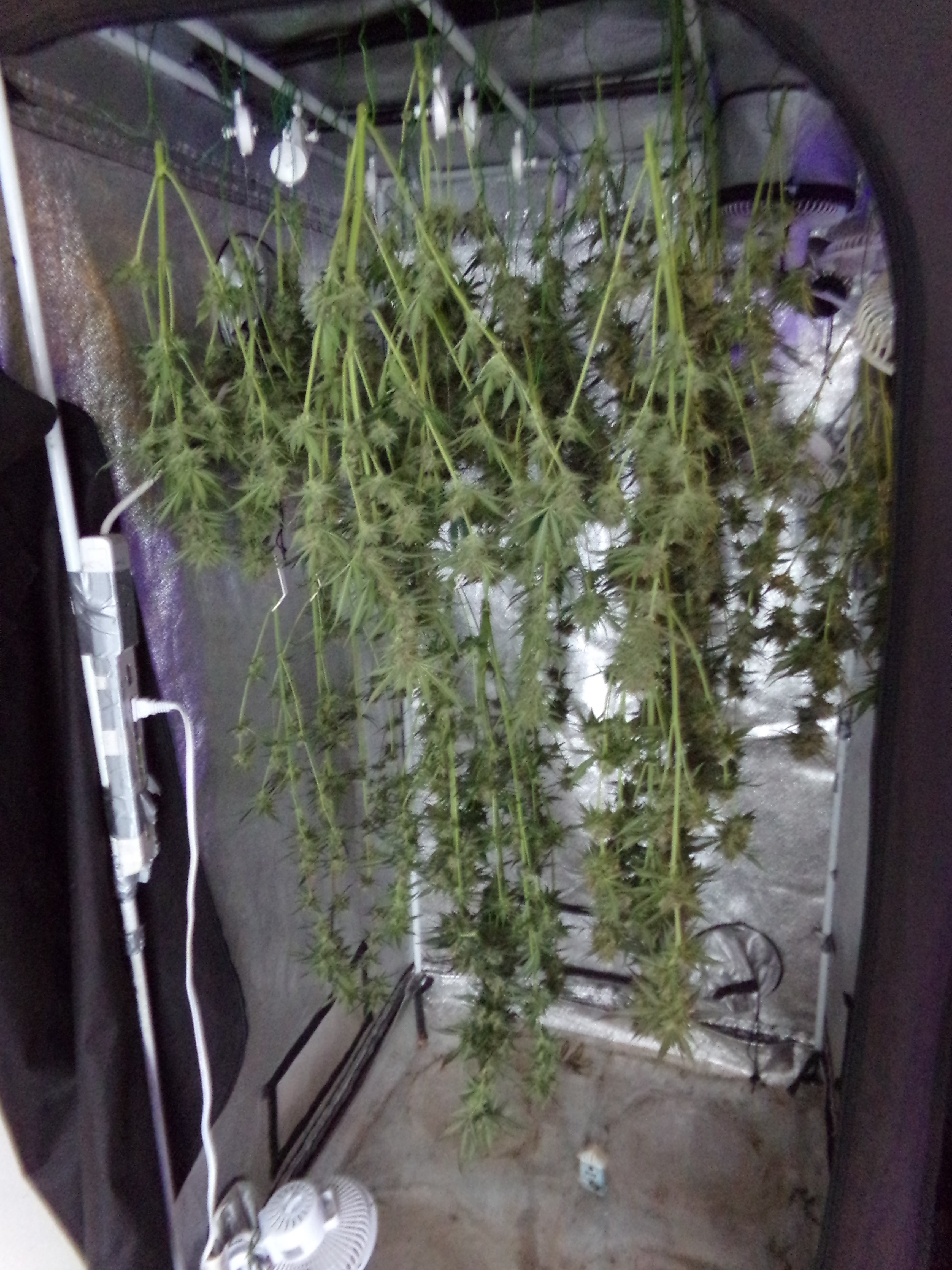 The cut-up. Risers removed. Cut and Jenga'd in the tent. Looks like the most biomass I've hung. Even had to add a few rafters.