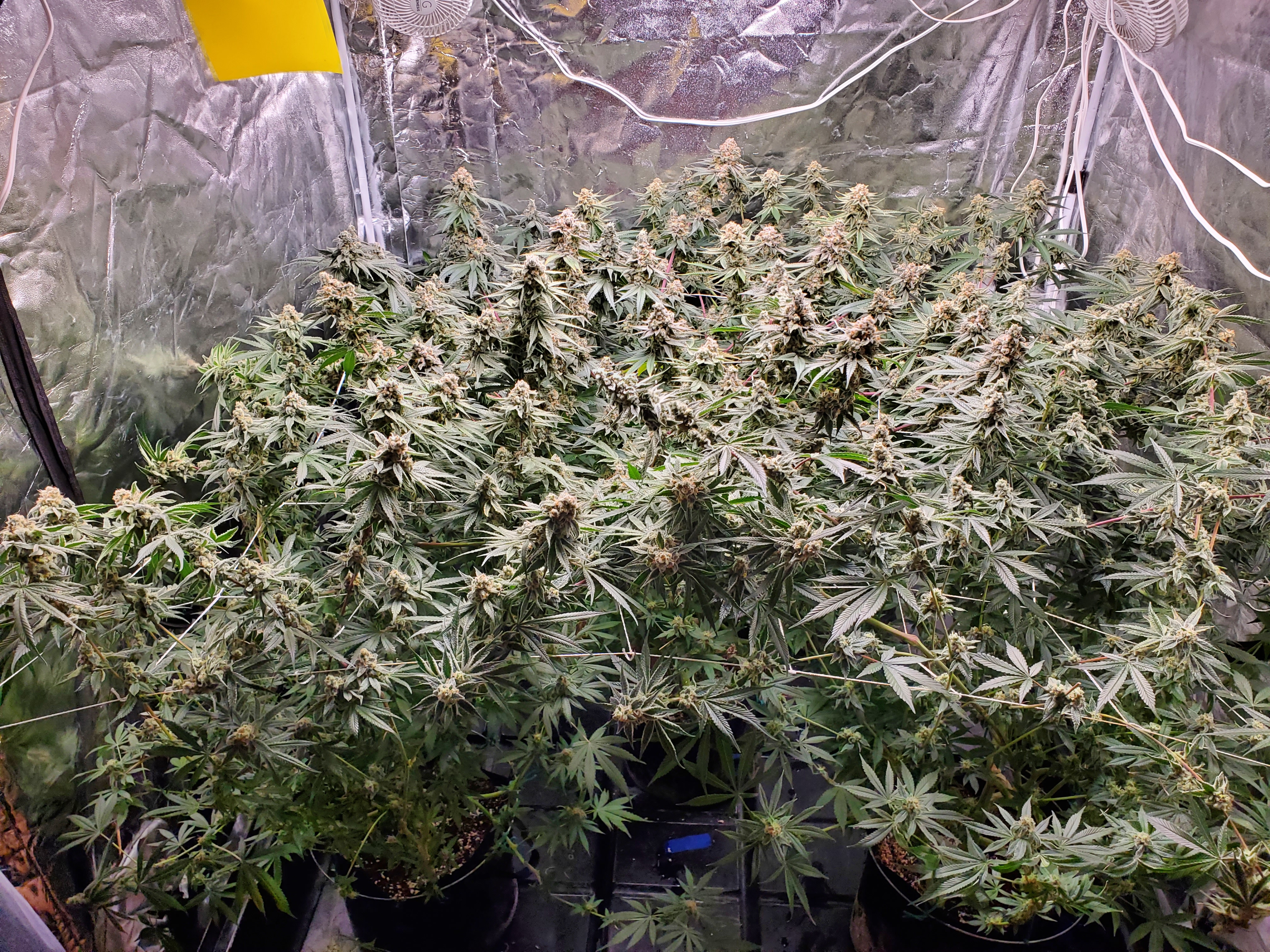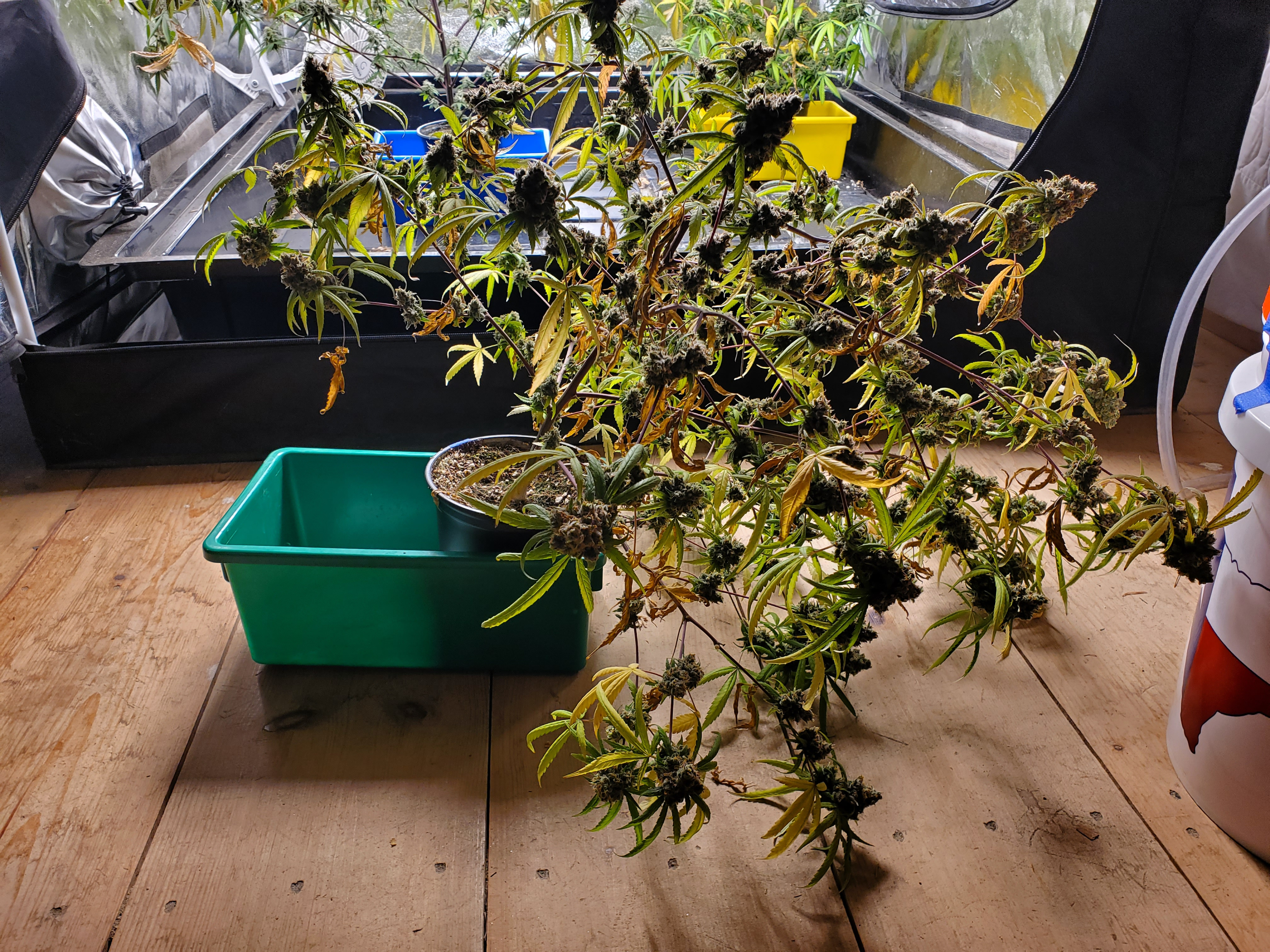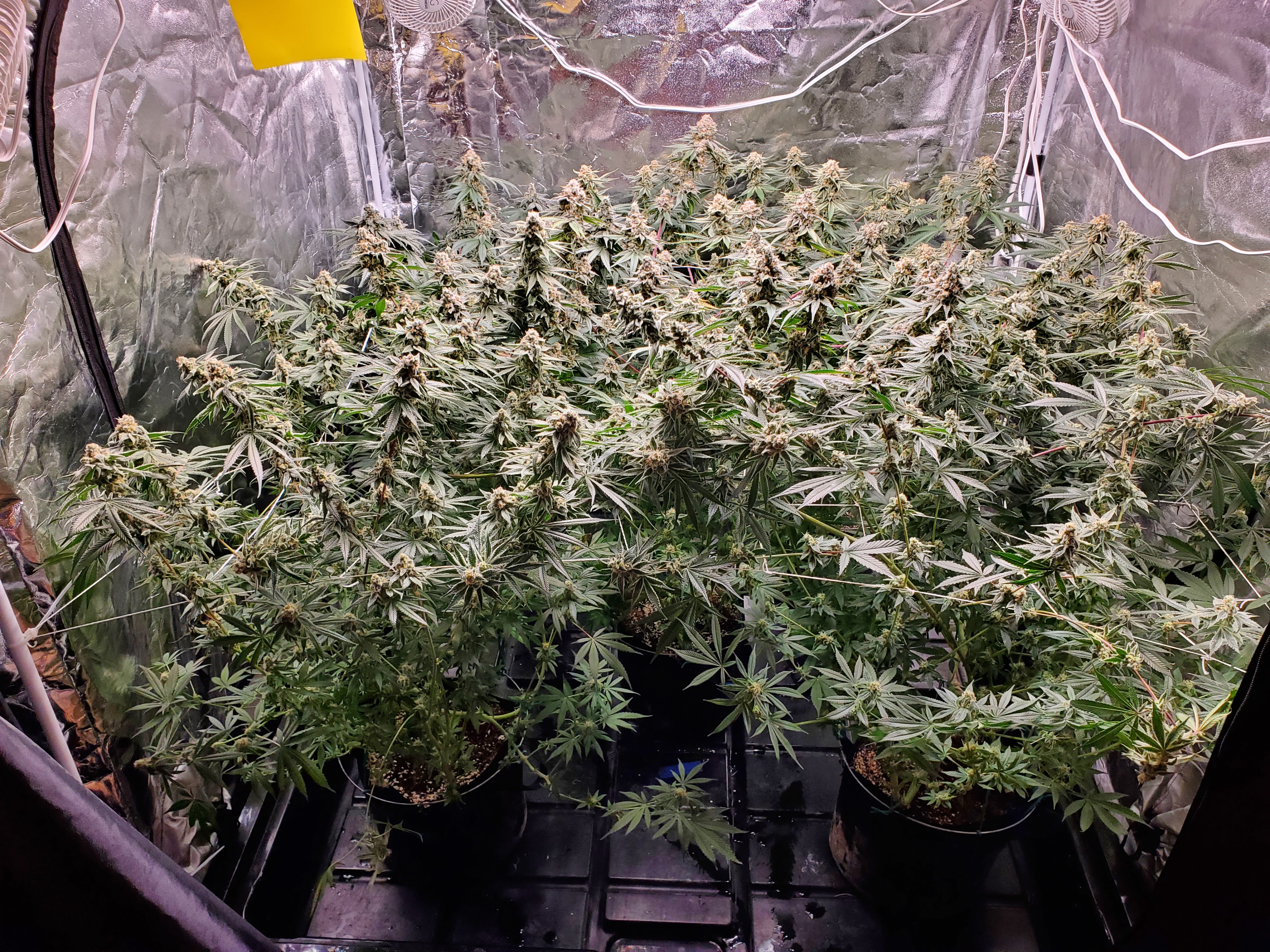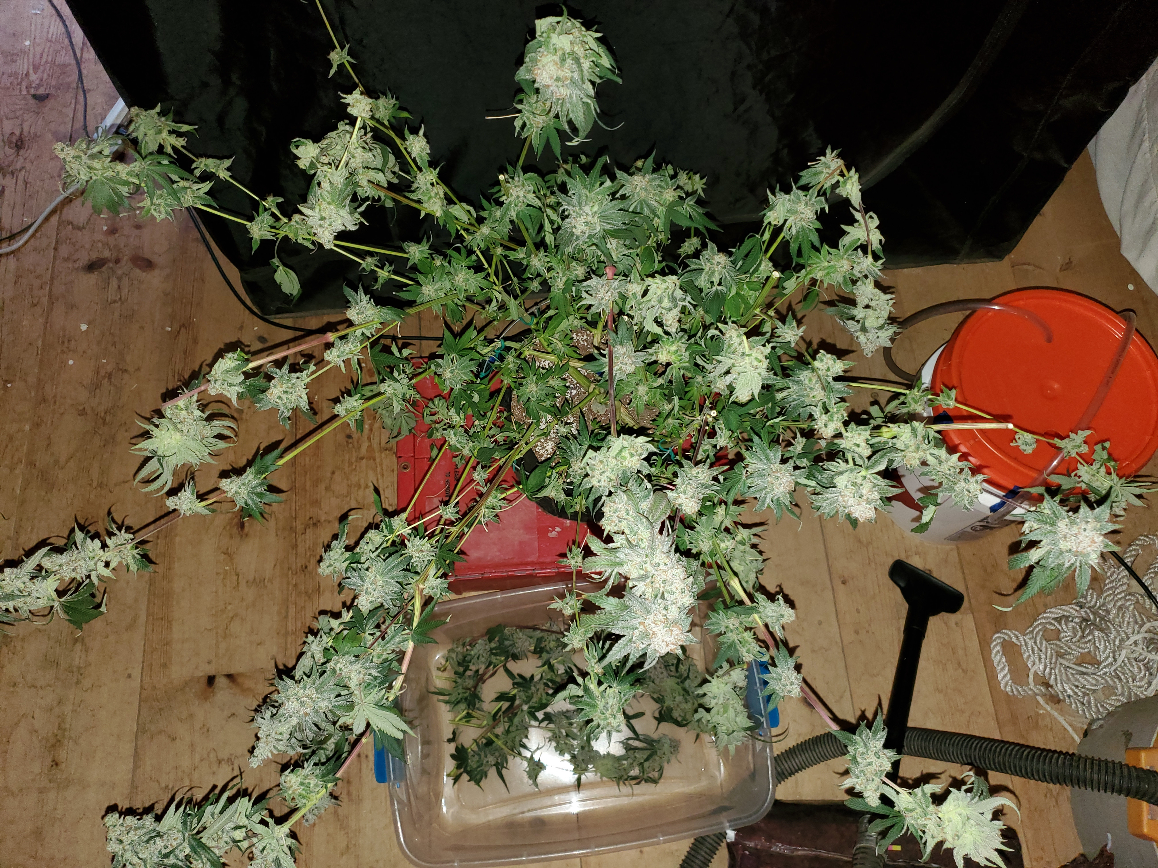 The chocolope has been cut and hung, the sluricaine is still marking time, maybe a week or two. The humidity is returning so the cut might be pushed up if there are issues. A few pots with larf buds are left behind and the seed makers have been moved into the big tent with them.