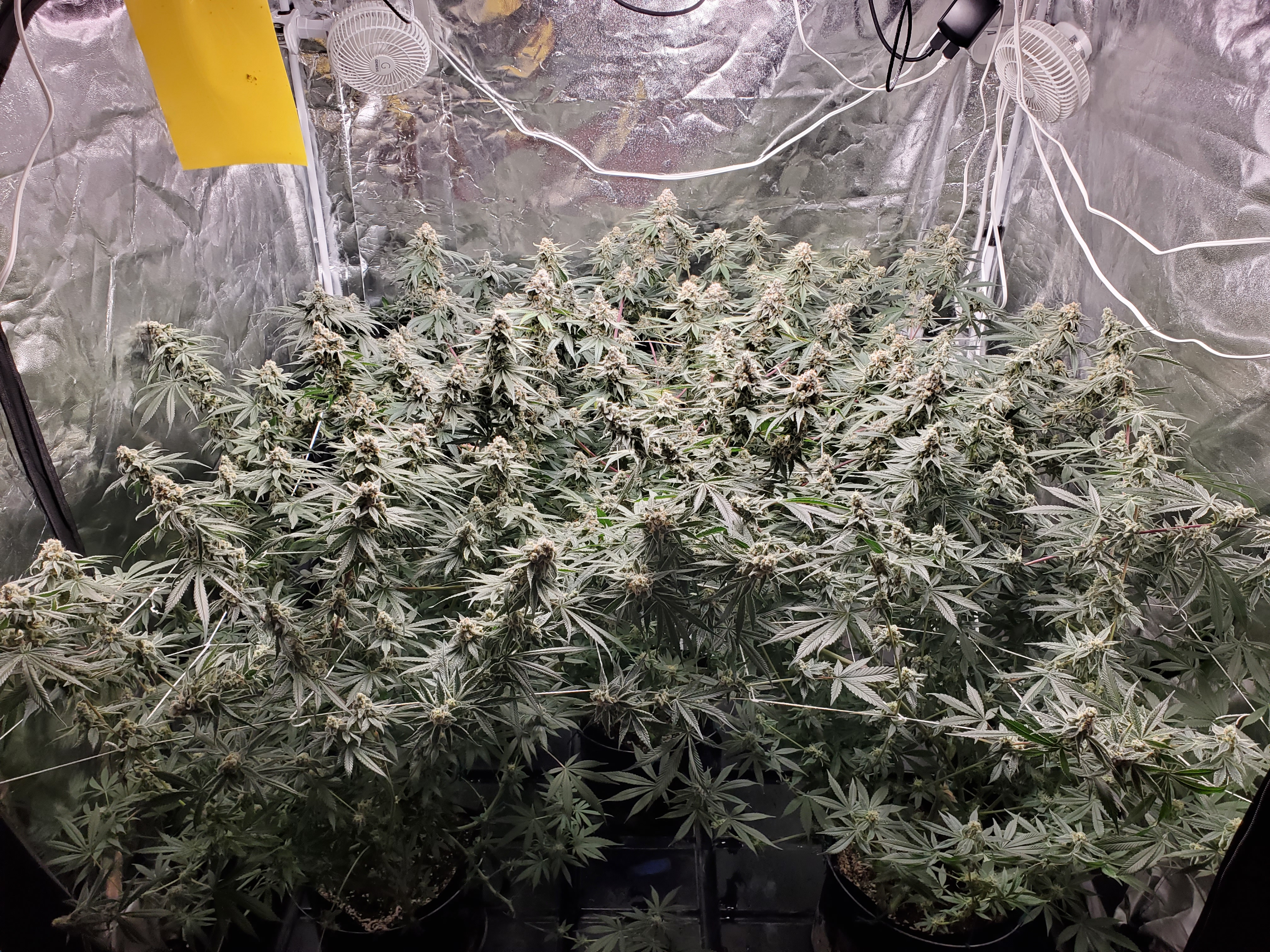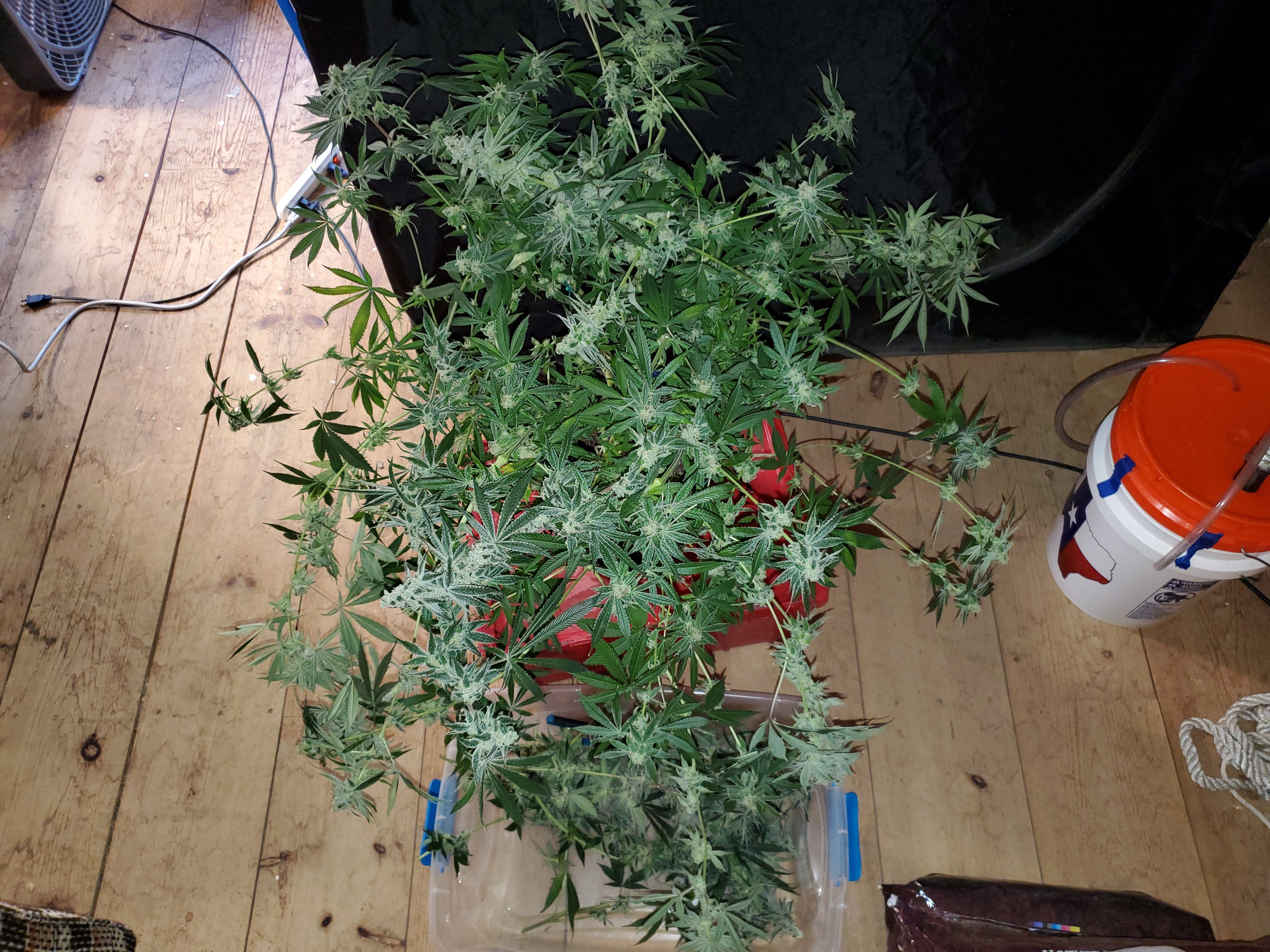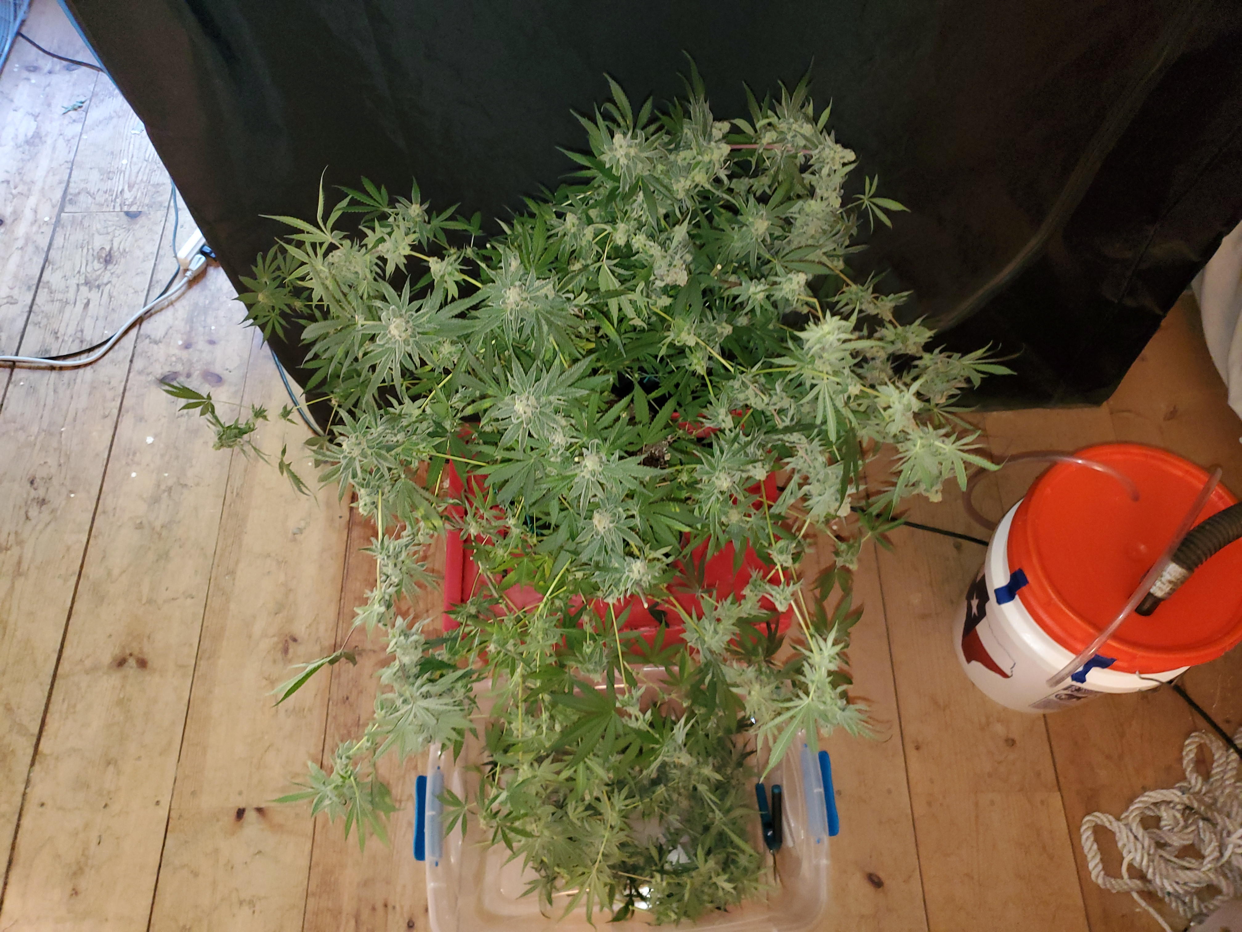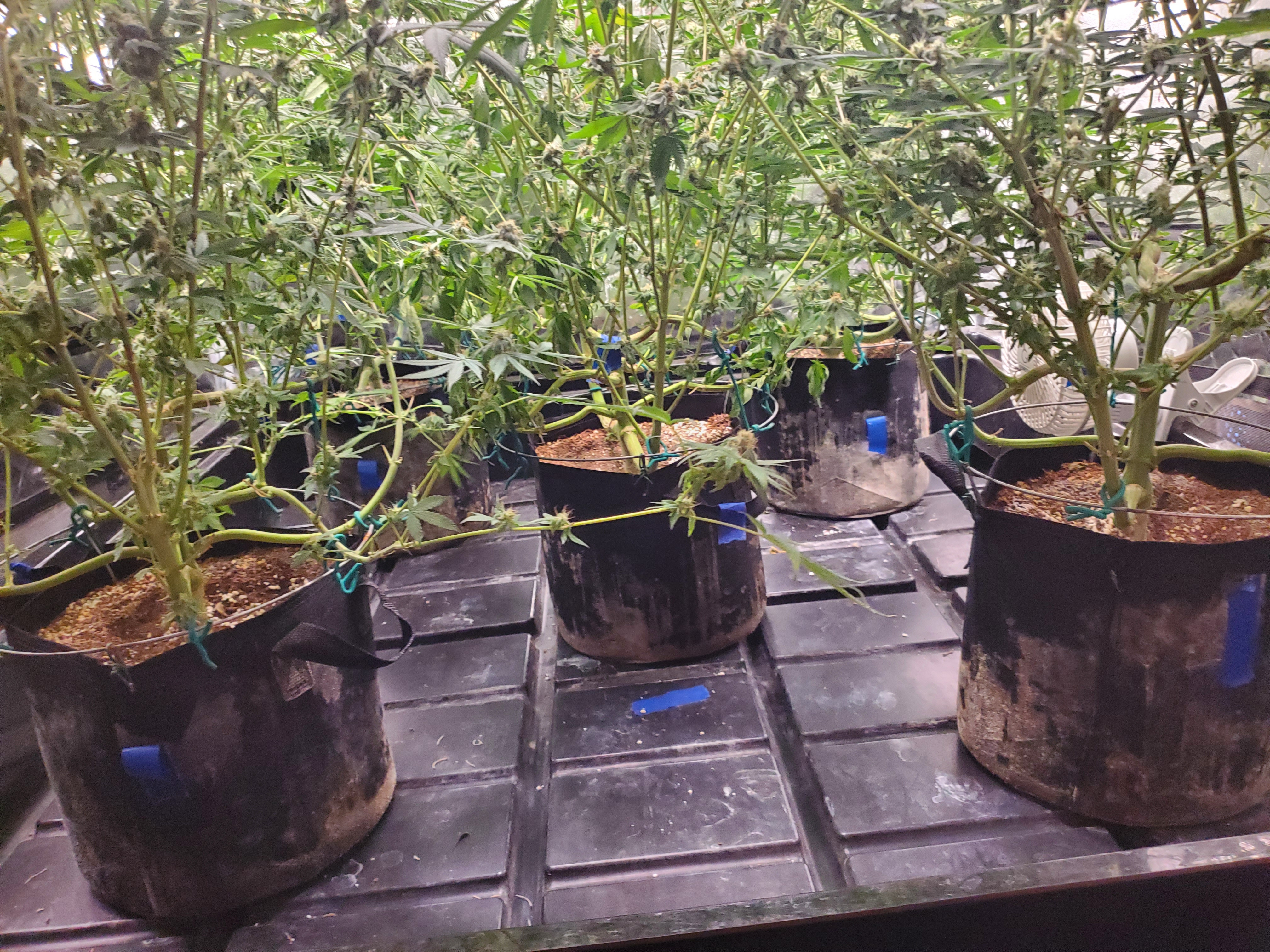 The chocolope has been cut and hung, the sluricaine is still marking time, maybe a week or two. The humidity is returning so the cut might be pushed up if there are issues. A few pots with larf buds are left behind and the seed makers have been moved into the big tent with them.