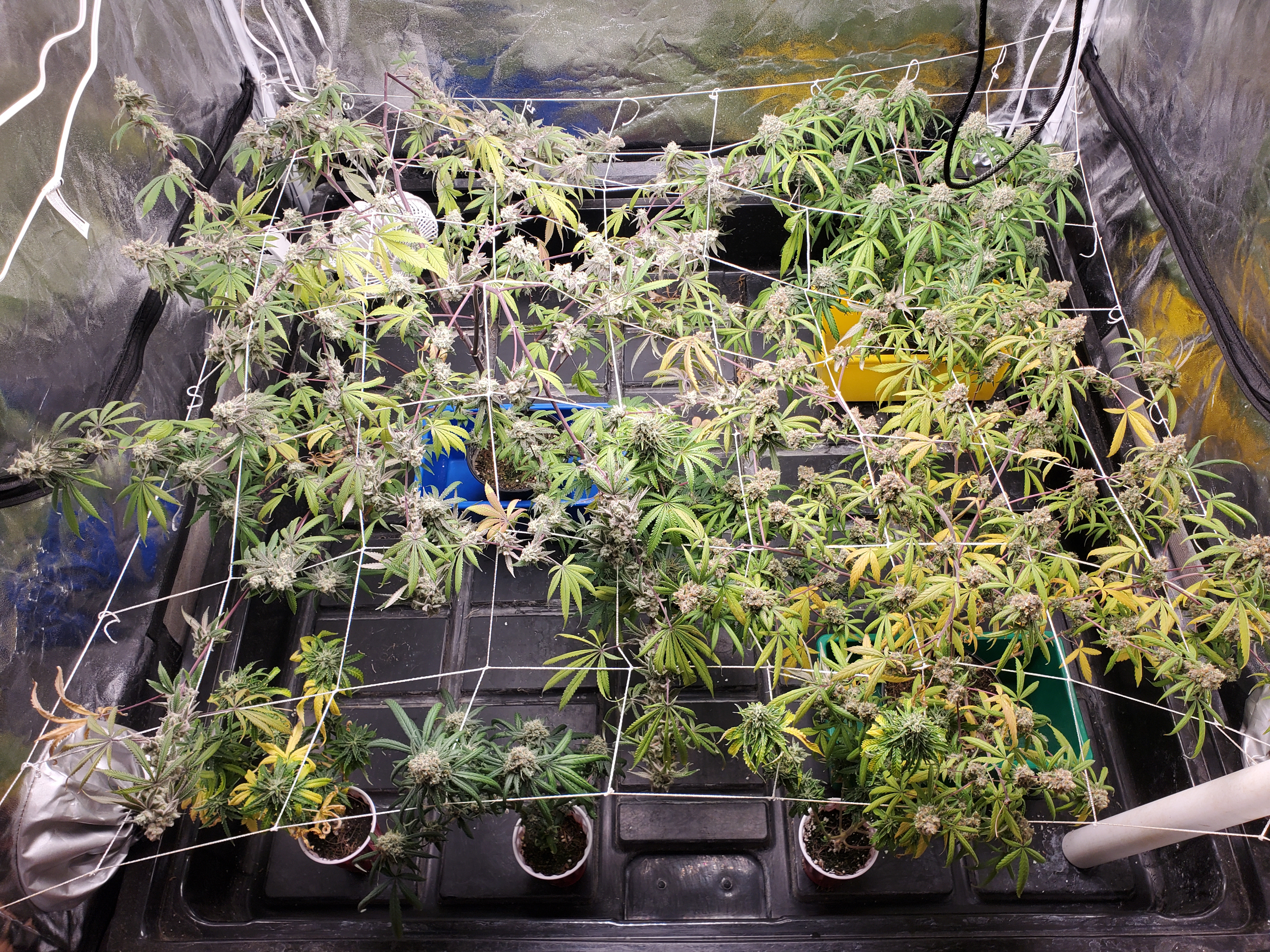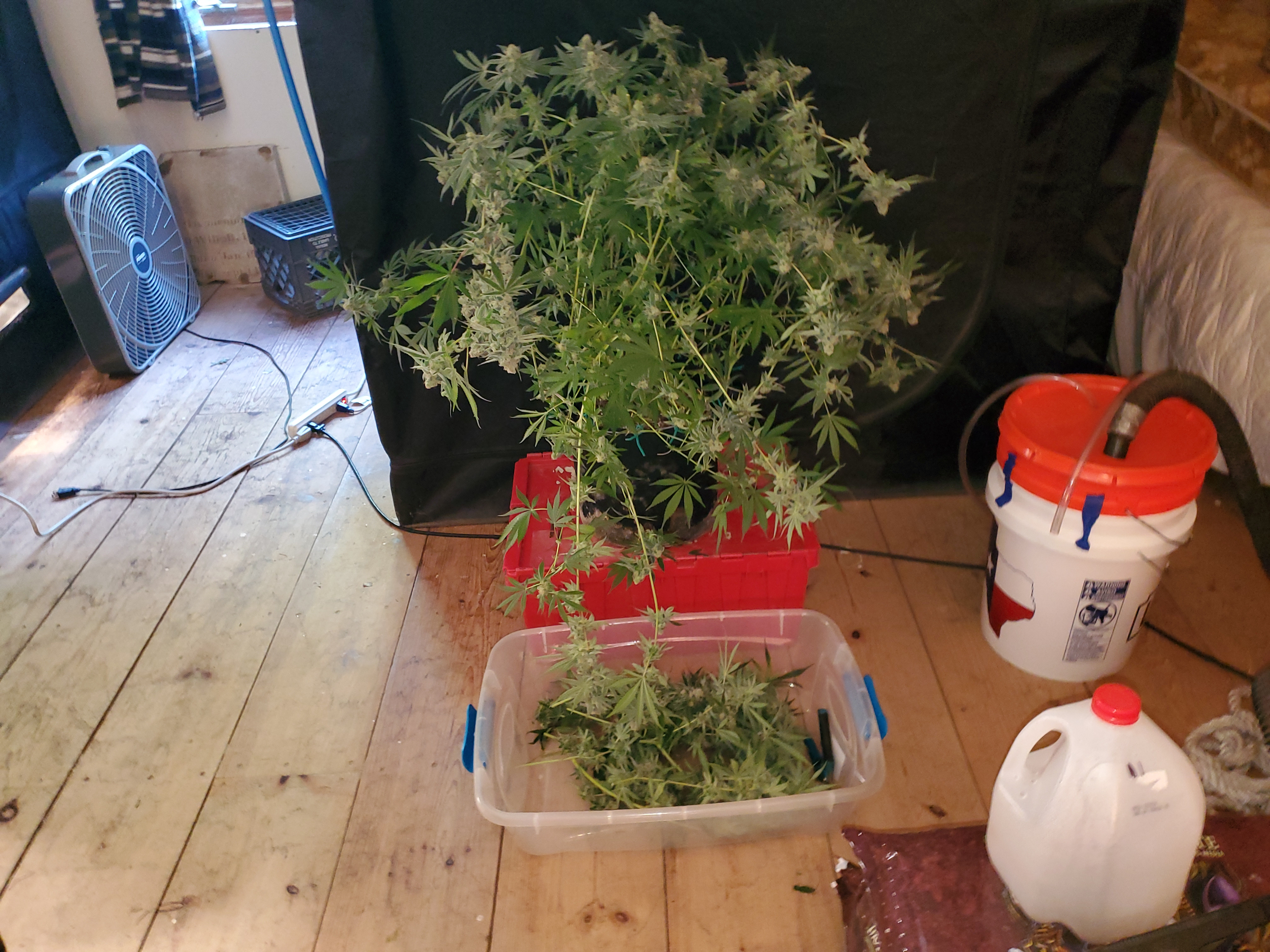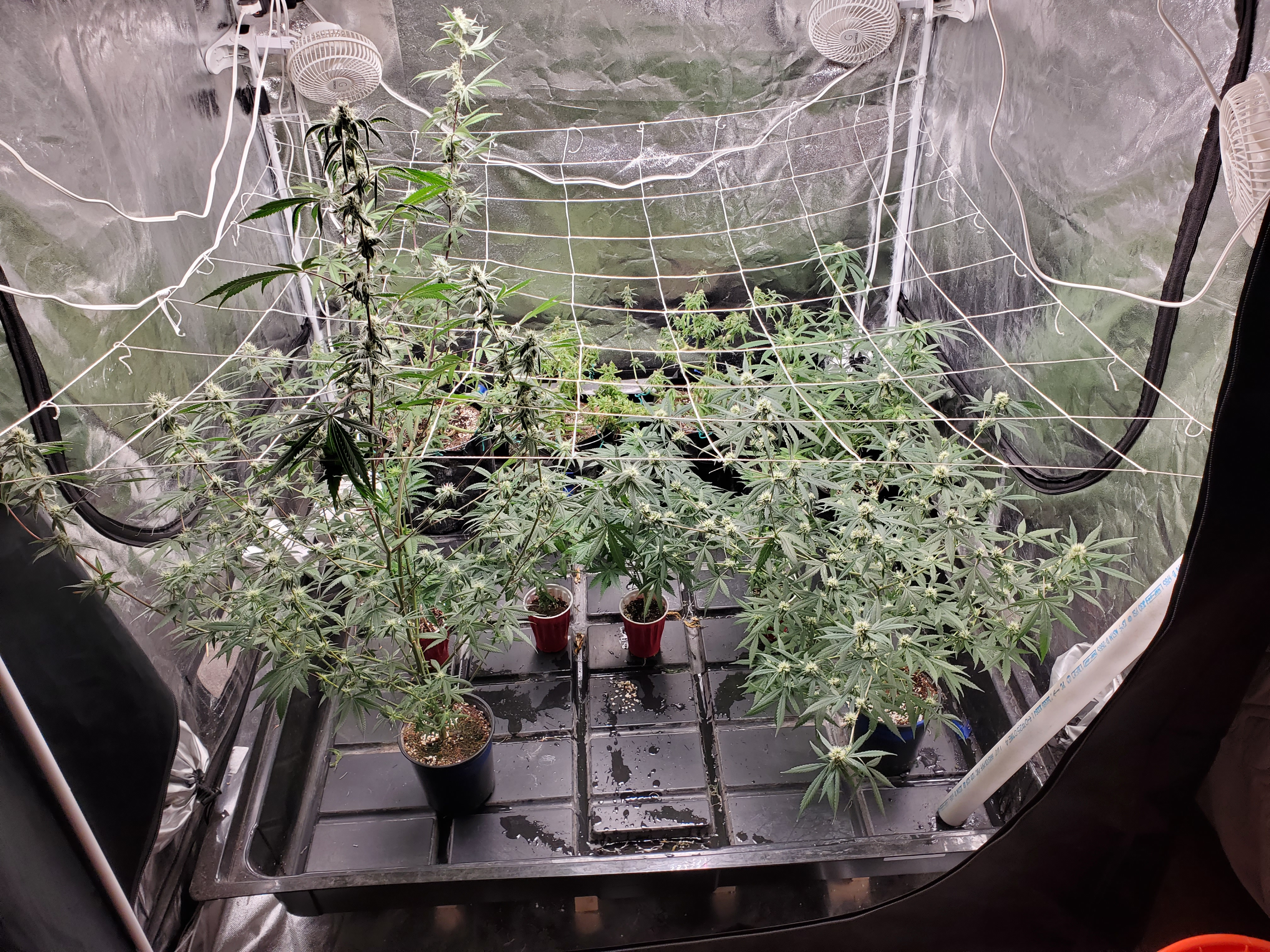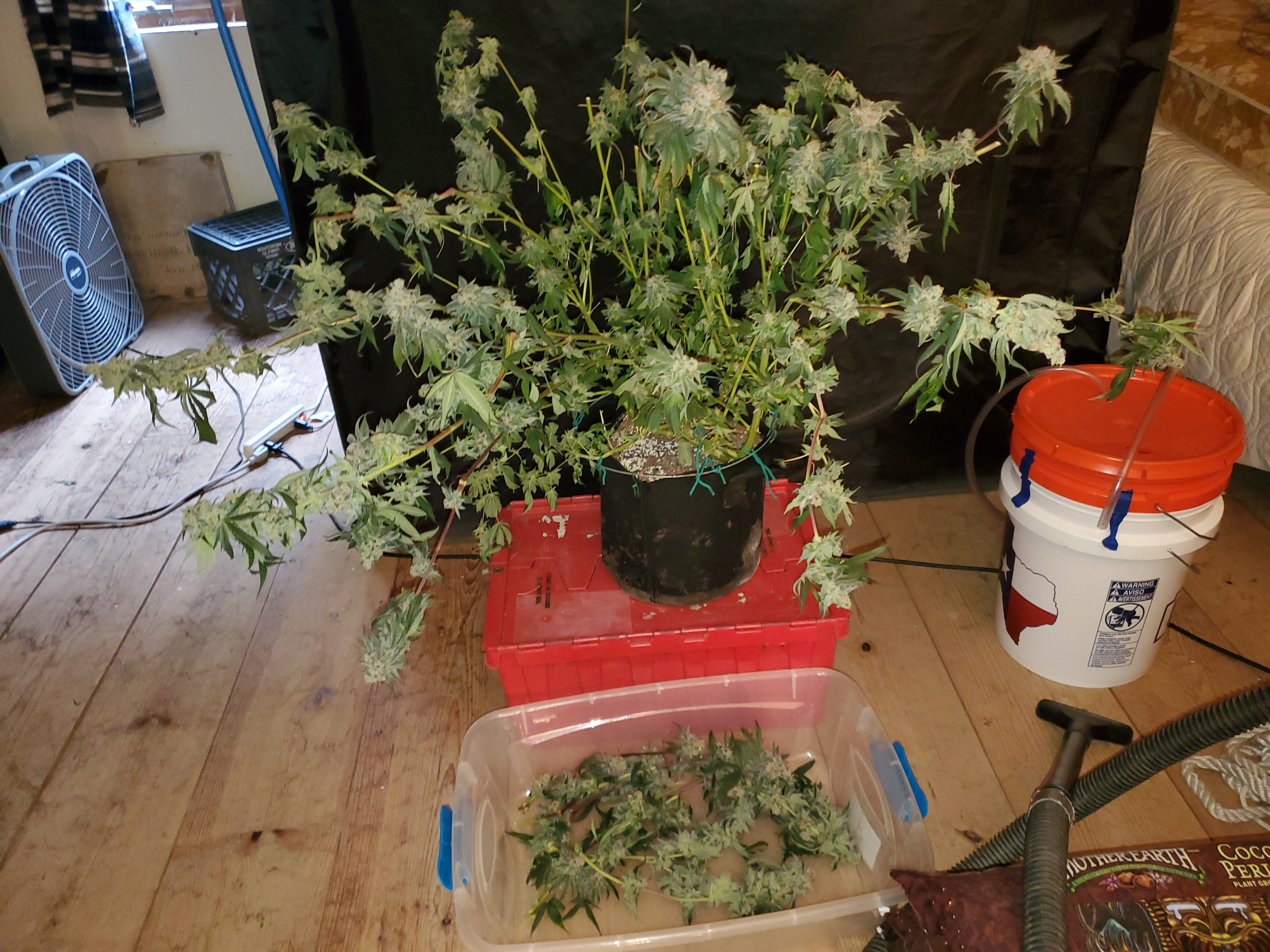 The chocolope has been cut and hung, the sluricaine is still marking time, maybe a week or two. The humidity is returning so the cut might be pushed up if there are issues. A few pots with larf buds are left behind and the seed makers have been moved into the big tent with them.