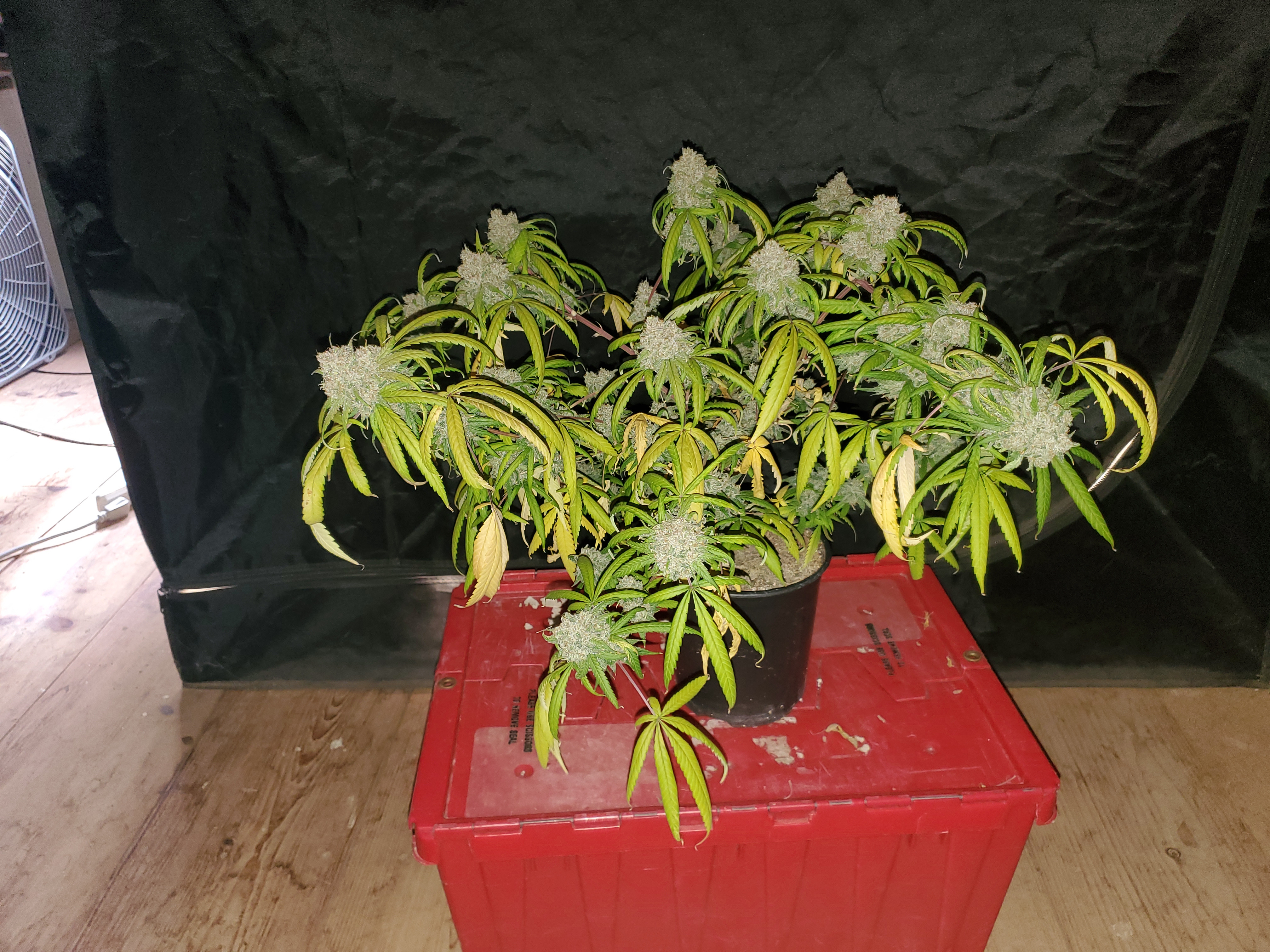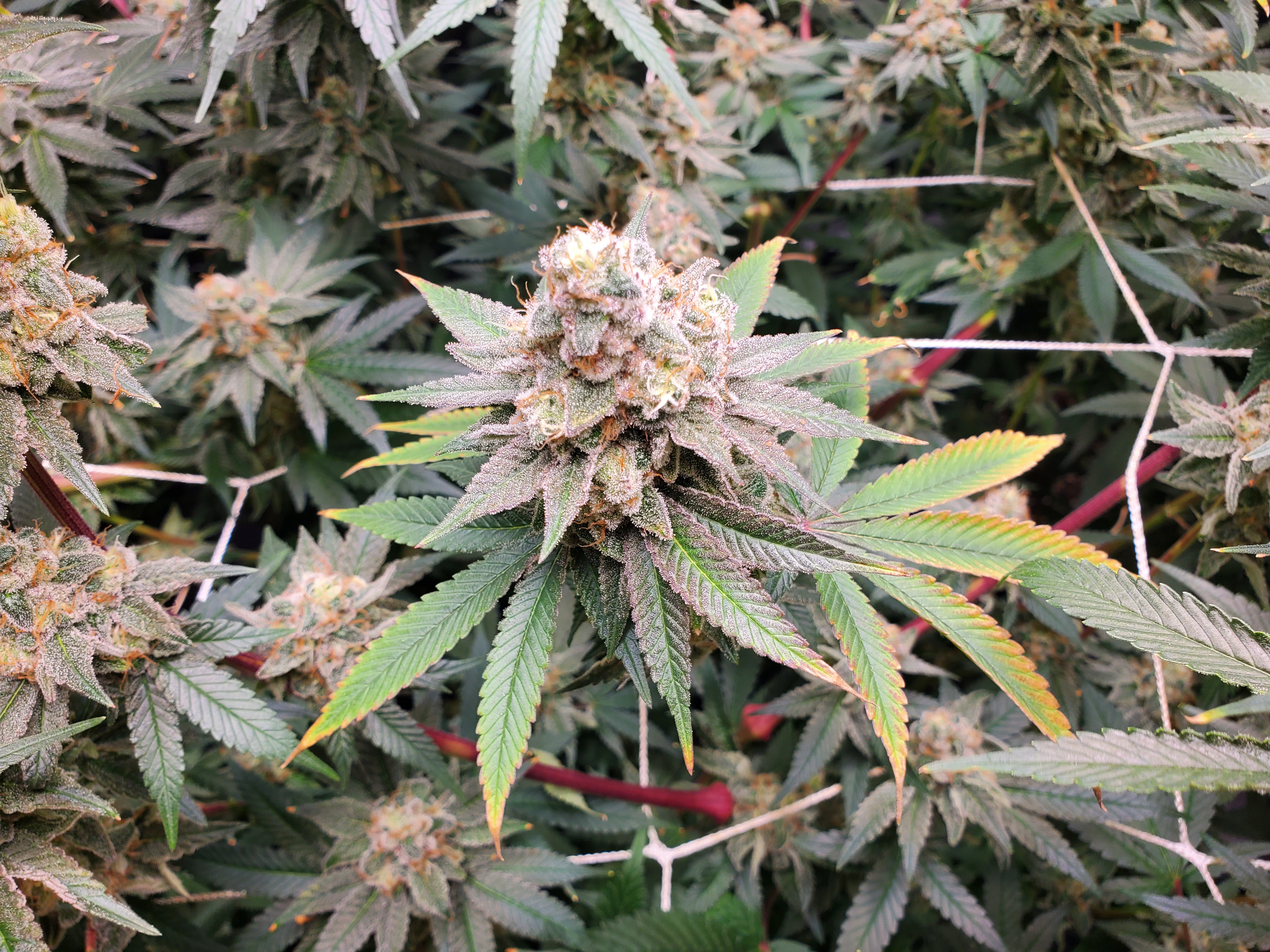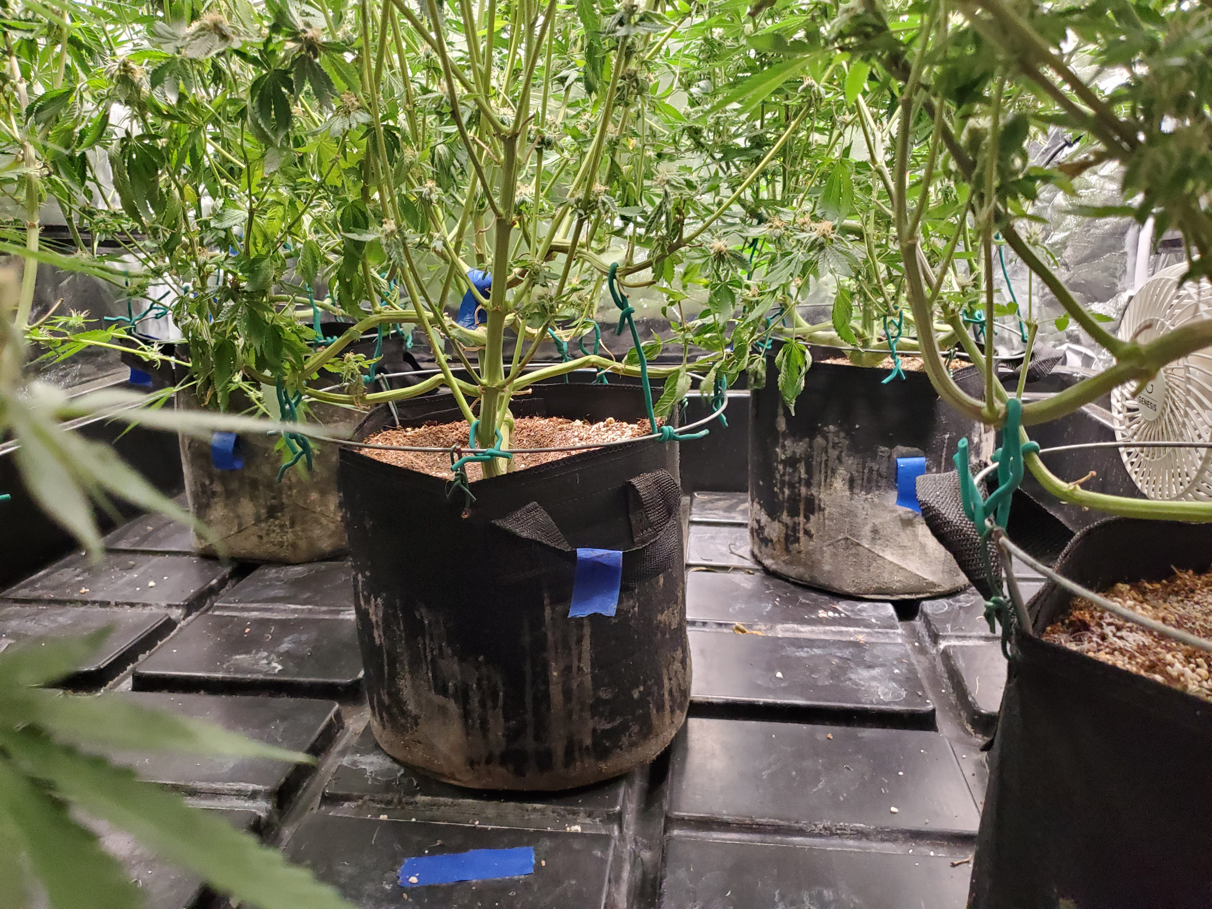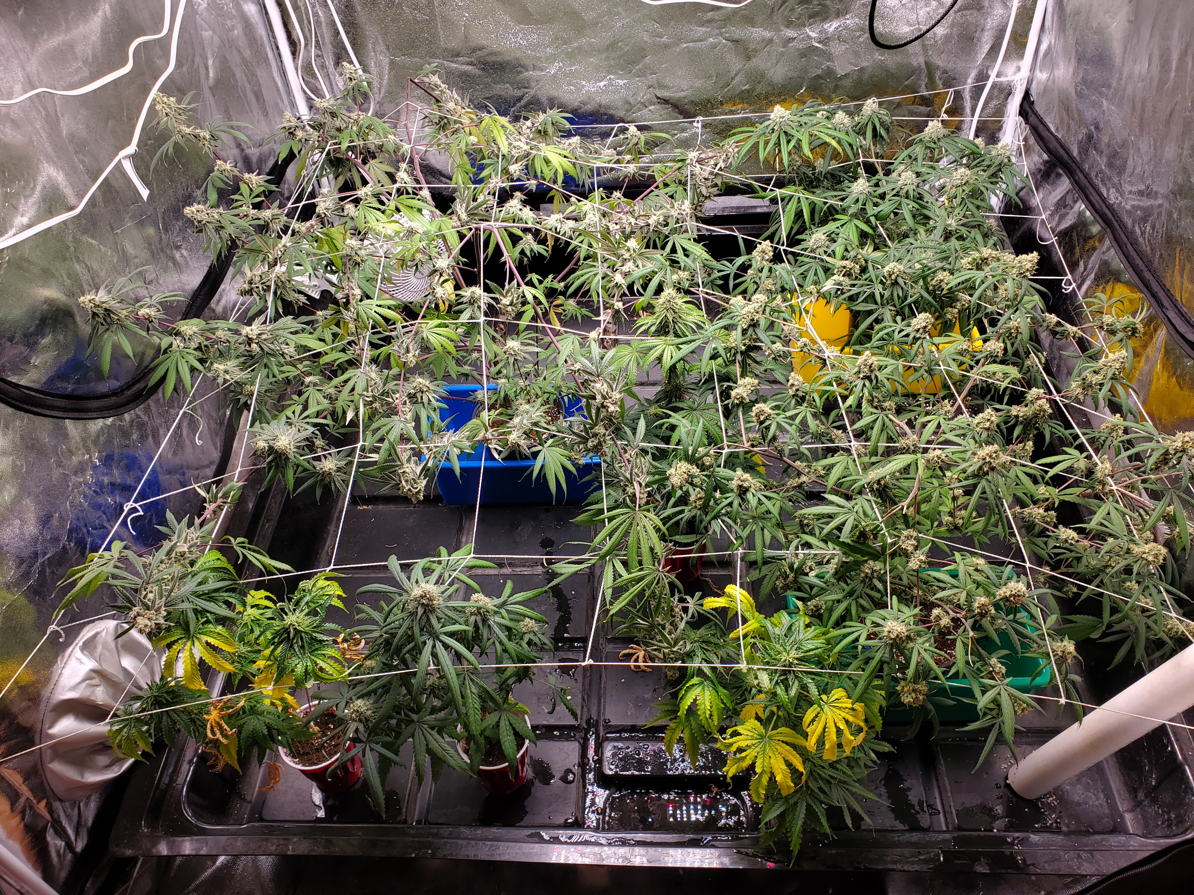 The chocolope has been cut and hung, the sluricaine is still marking time, maybe a week or two. The humidity is returning so the cut might be pushed up if there are issues. A few pots with larf buds are left behind and the seed makers have been moved into the big tent with them.