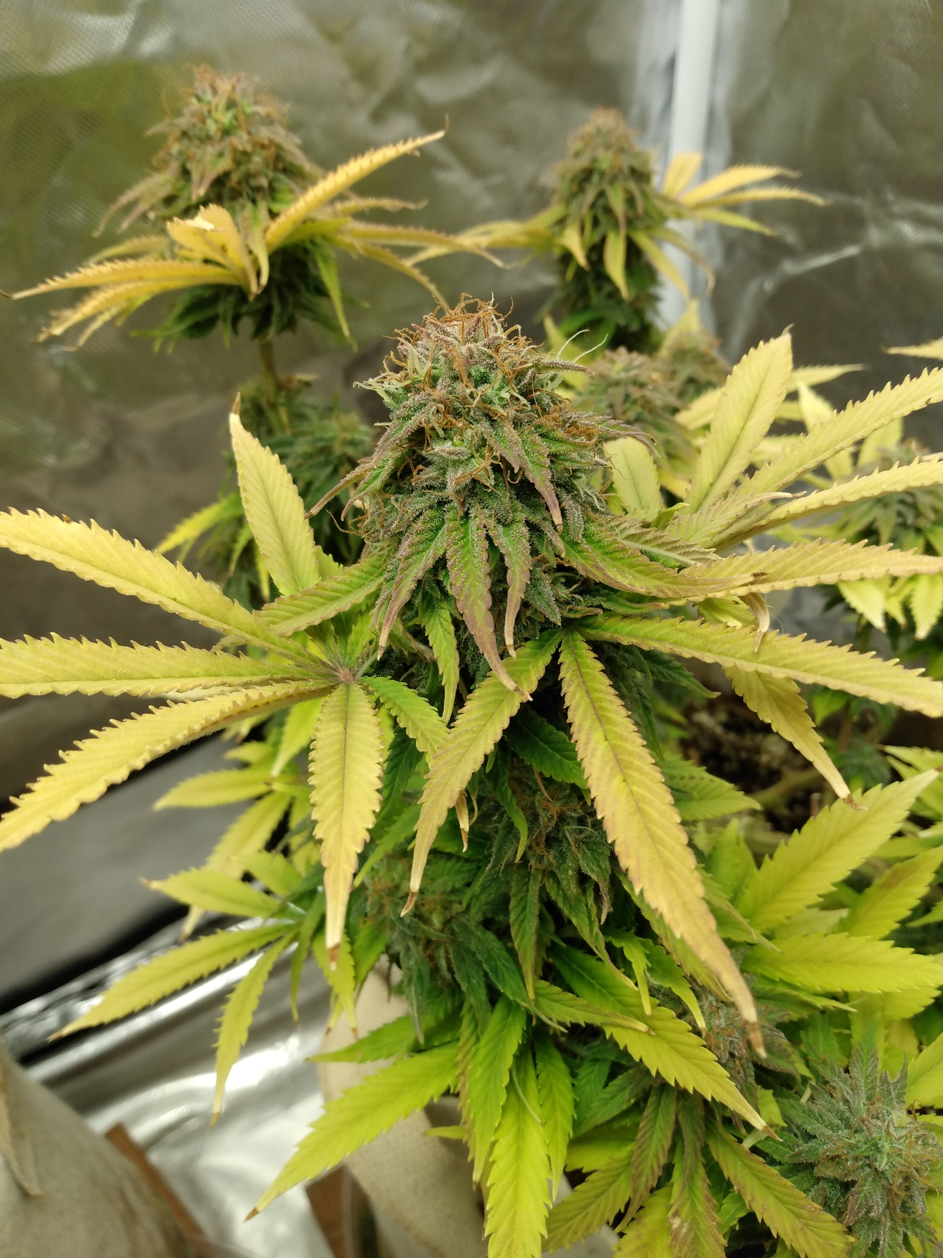 Hi. Asking opinions on whether to chop one plant now or wait a bit. I am sorry for the shitty photos. I have my spring grow getting near finished. Six plants in two tent, all fairly much sativas. 10 weeks from 12 12 . All except one have done great and two are soo close with fully cloudy trichomes awaiting more amber. However, one "Congolese sativa" (the most sativa looking) started showing issues a month ago despite being treated the same as the others. Seemed to be showing maybe some nutrient lockout, over feeding and/or light damage. She is apparently a lot more sensitive than the others. I did some remedial attempts but only half heatertedly . she is really fading every day now, while still producing new pistils. Today she is really faded a lot, and trichomes are maybe 80% cloudy. I am not sure how to get best out of her now - either chop or wait. If I chop she wont get any flush, but has been on reduced nuts for the last week anyway. there are still lots of tiny green leaves, but most of any size are yellowing more each day. Would you suggest chopping her, or wait more? I am leaning towards harvesting before too much more yellowing occurs. Cheers all. Happy late 420!