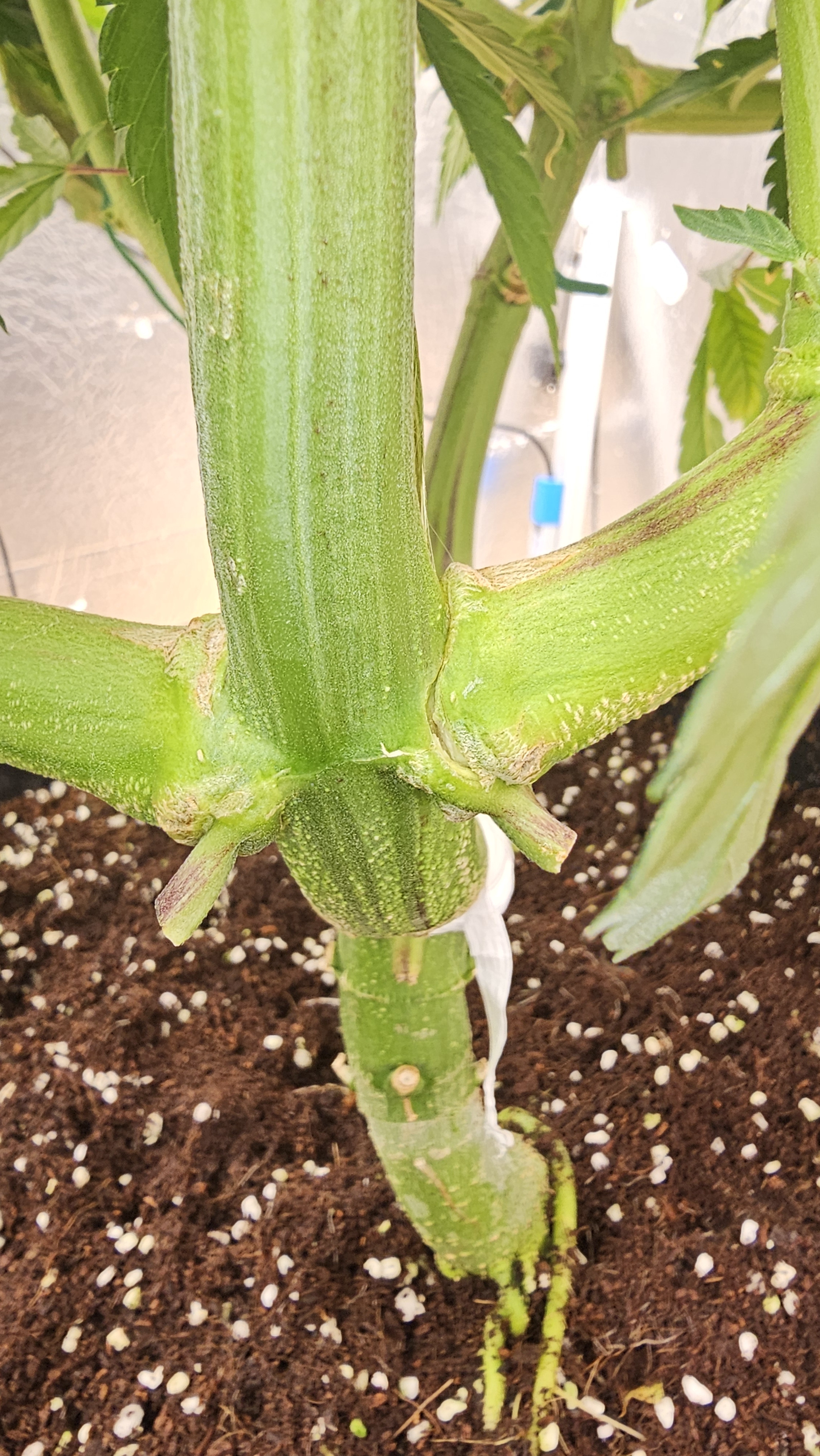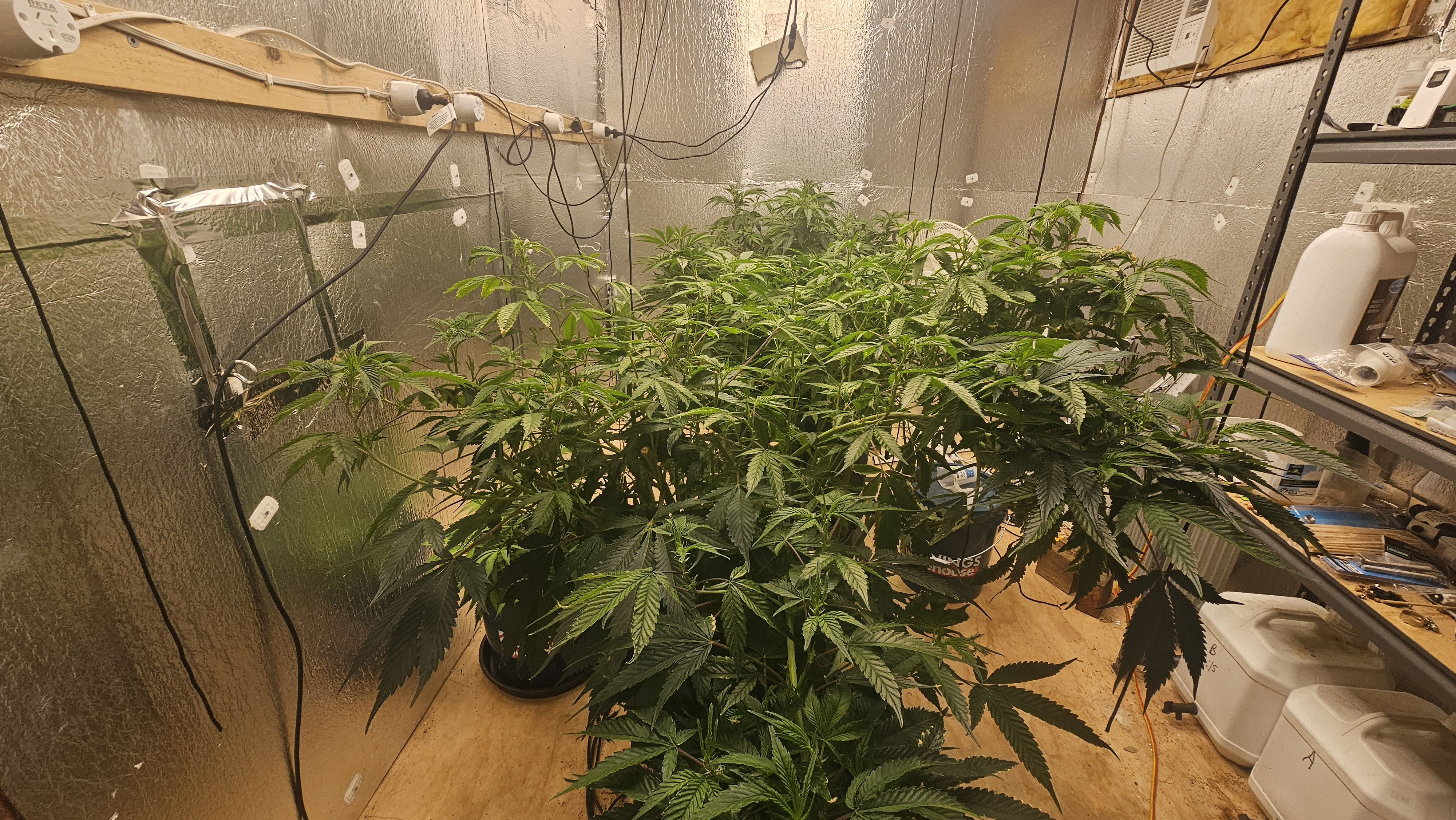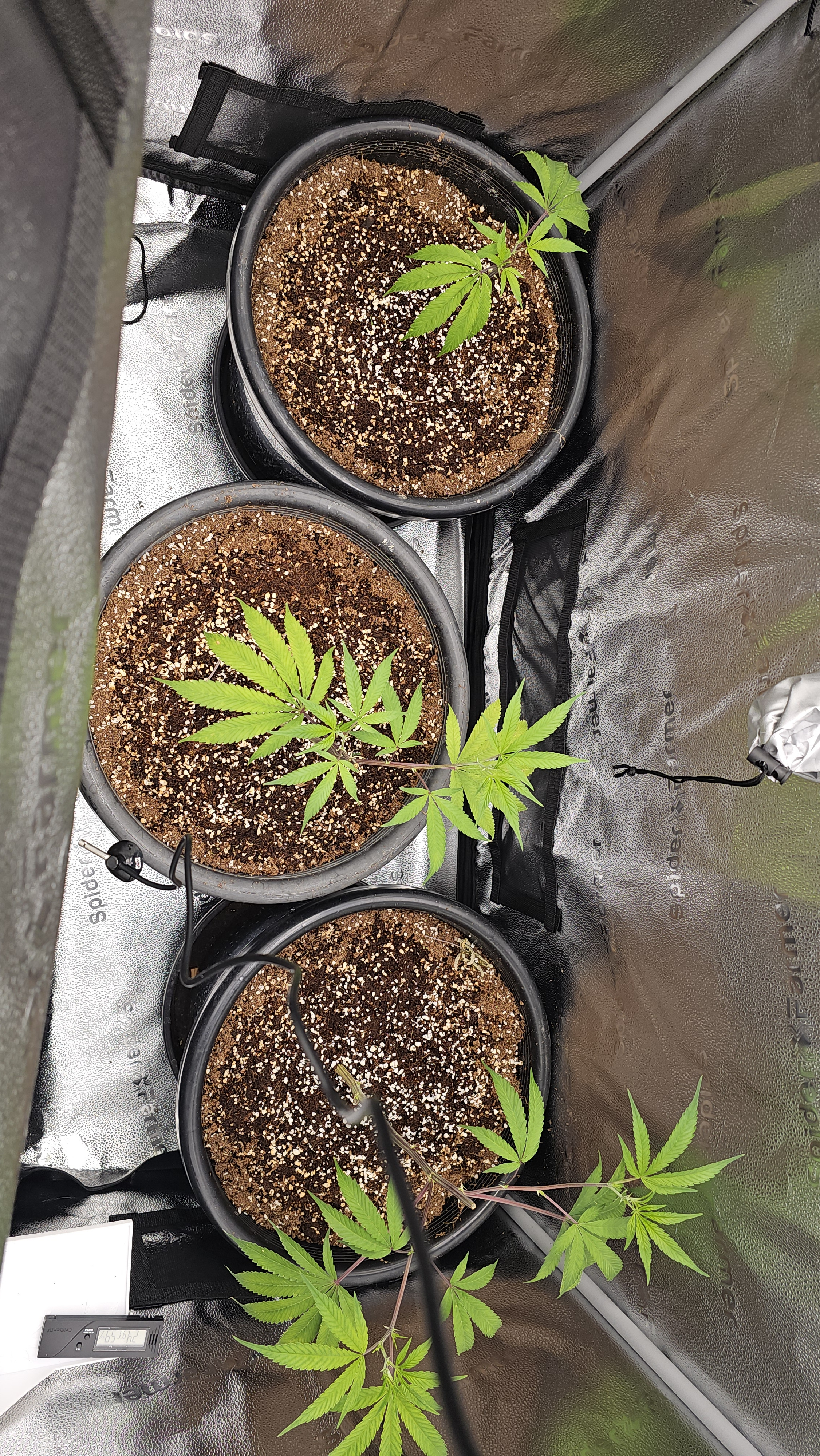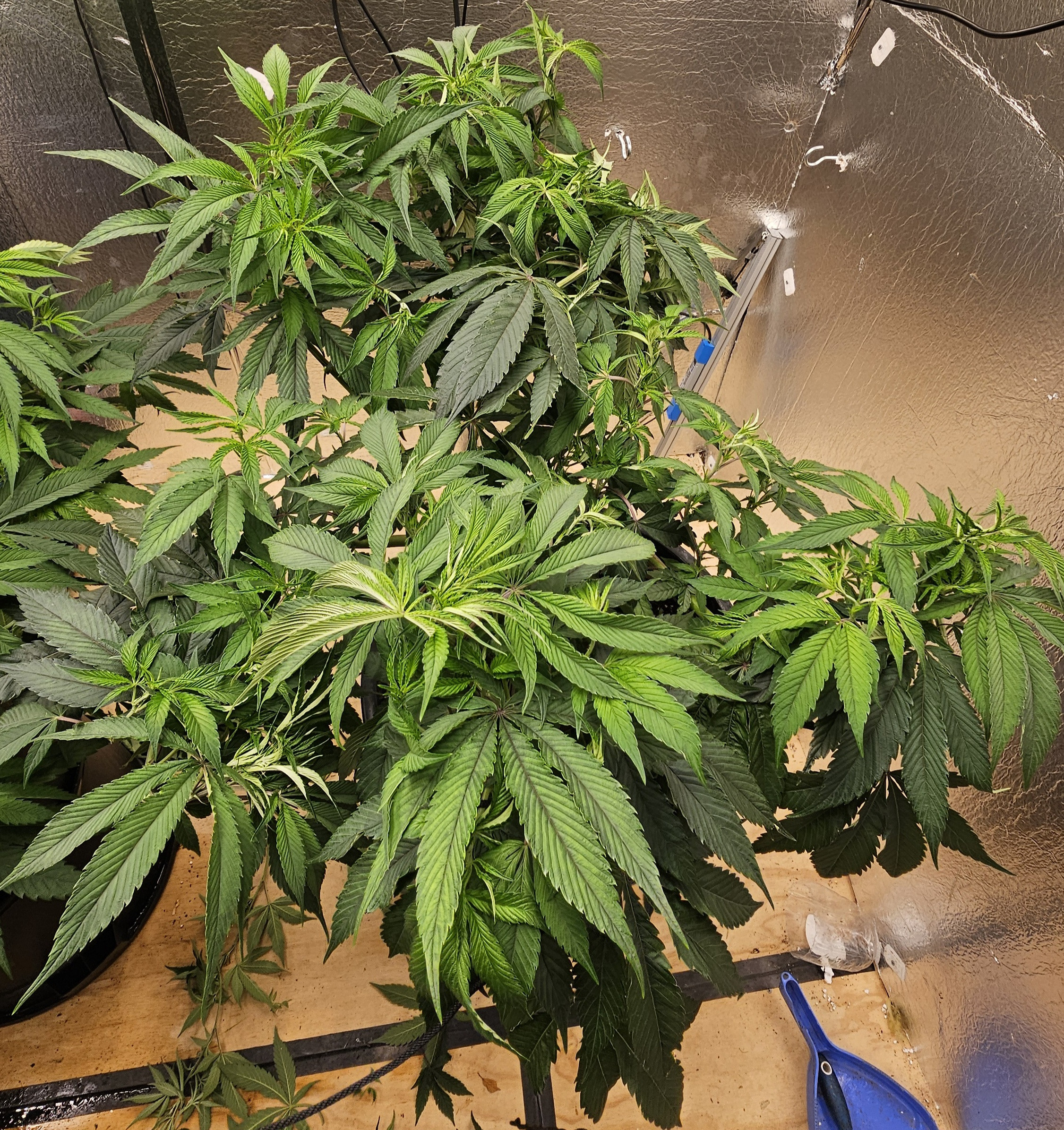 I've cleaned up the mother OZ x SD somewhat, halfway there. She was 6ft tall and almost 5ft wide that I took clones from. She is healthy but root bound in a 7.5gal pot. EC 1.3 40% Flower nutes 60% Veg nutes pH 6.2 on all three. She is double the height of the other two, needs more thinning and completion of loolipopping before flip. Minor nute burn on little leaves hidden deep in the canopy once I exposed the growth in the middle by cutting the top 3 feet off of her. She is way too big still.