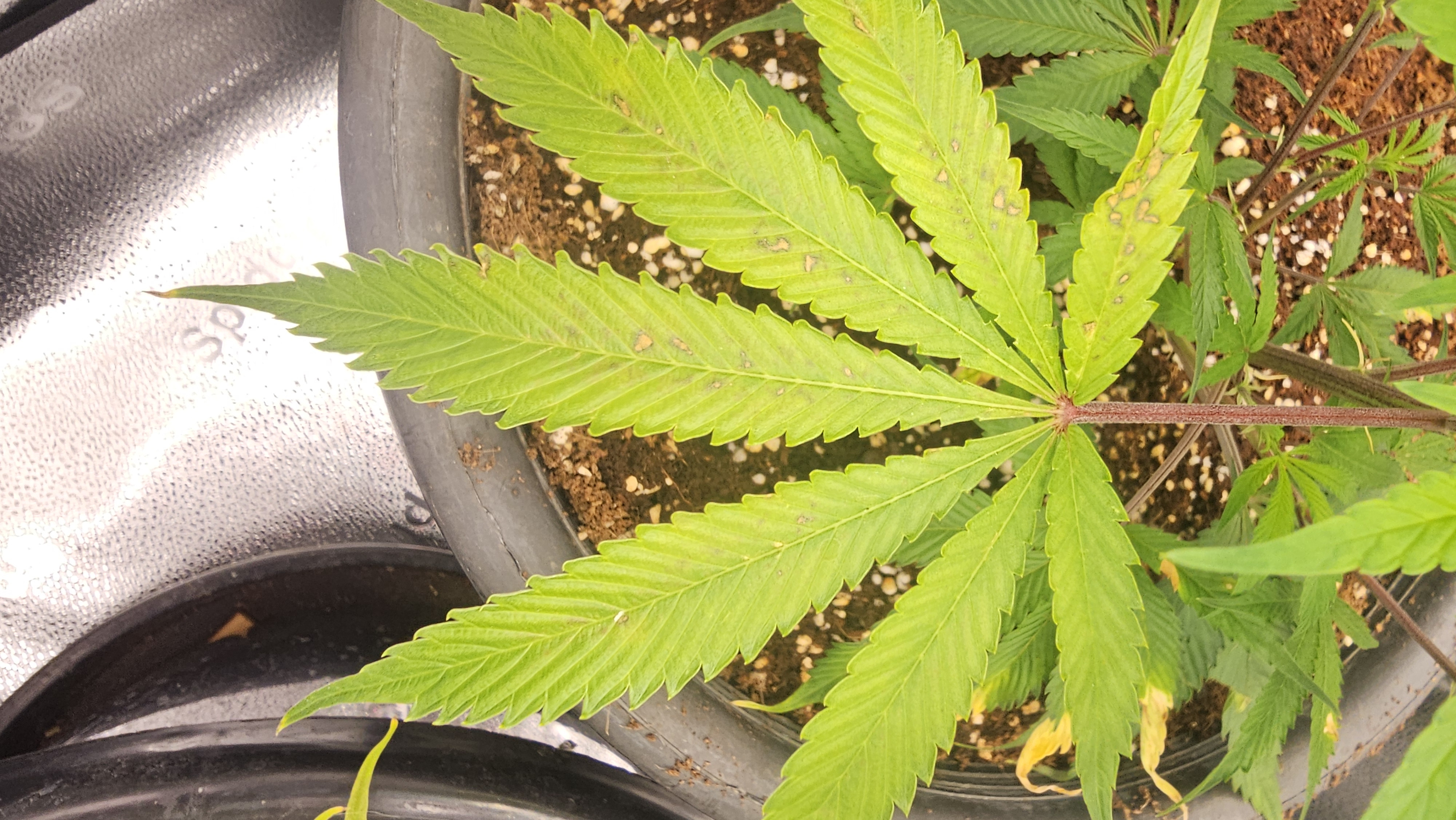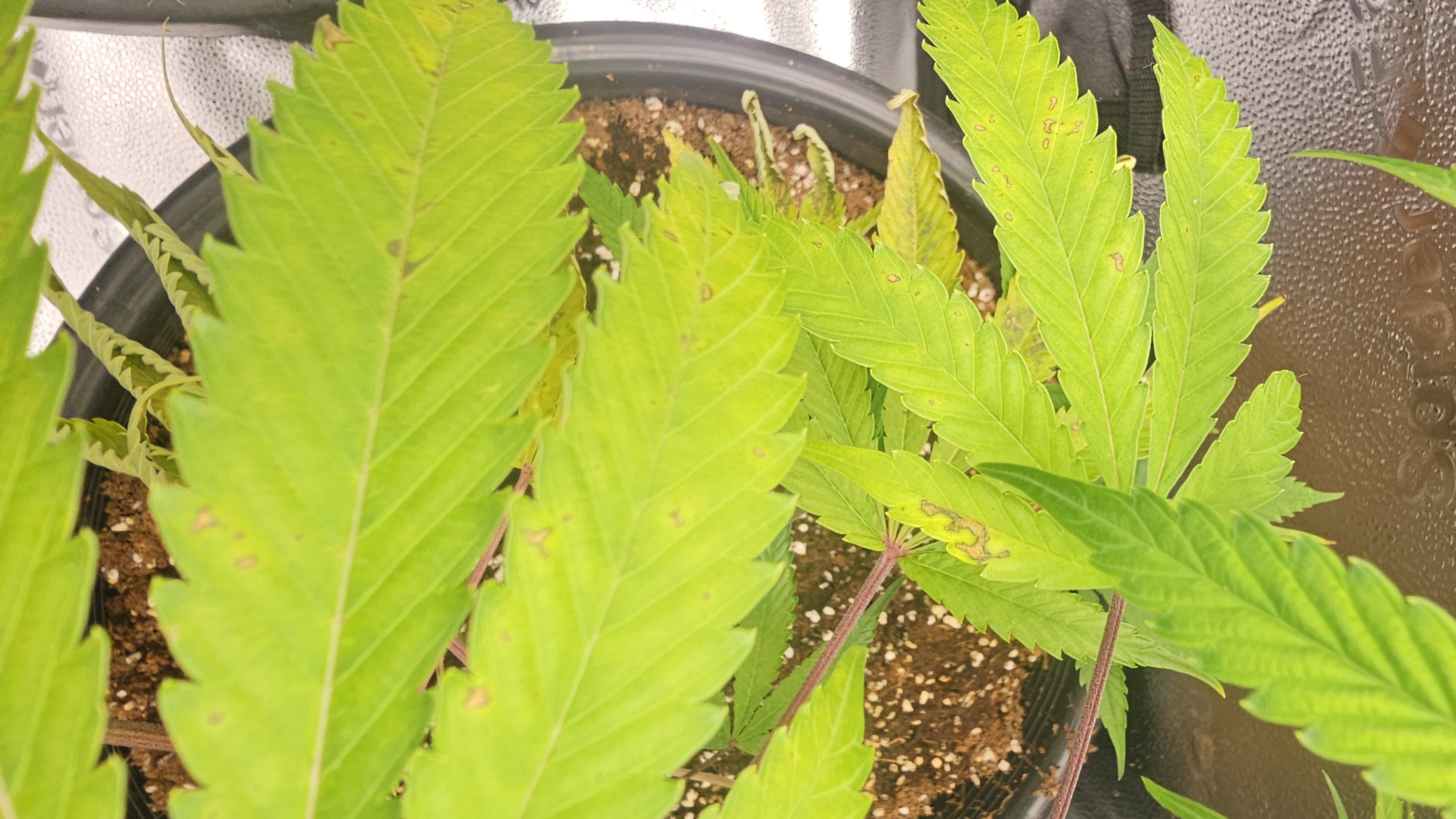 and the WW x SD. This one I split the first top by over tensioning on the training and repaired with teflon so she is a foot taller than the sativa unfortunately but a bit more developed from an earlier start. Ive also broken off one main cola and damaged two others. She is wide. Showing first signs of N toxicity, all three are actually, so hence the early flower nute mix and cut off calmag at this stage. Will be a good producer.