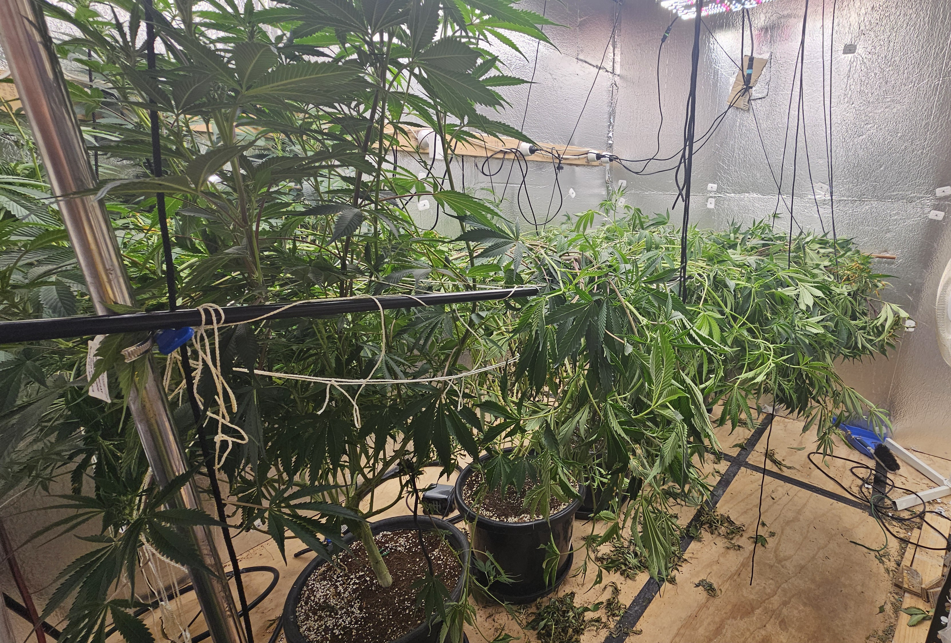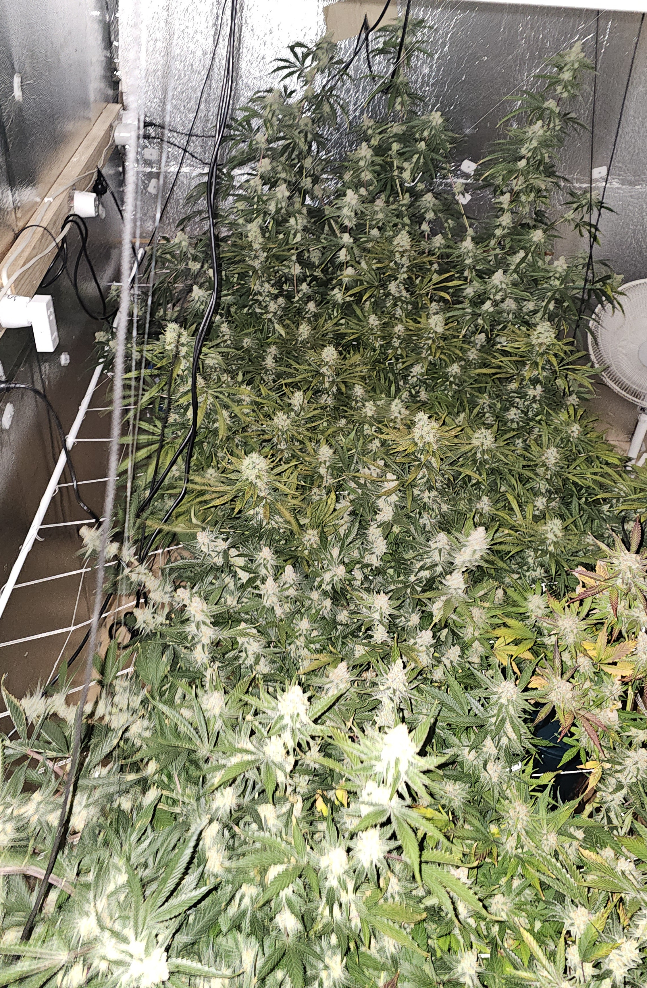 Flower Room: 11' x 7' x 7.5'H, 480w AC, 13gal/day dehumidifier, 1.5gal ultrasonic humidifier, 60gal (27gal usable) nute tank, 16" pedestal fan & 18" wall fan. Lighting and climate automated. Hand watering.