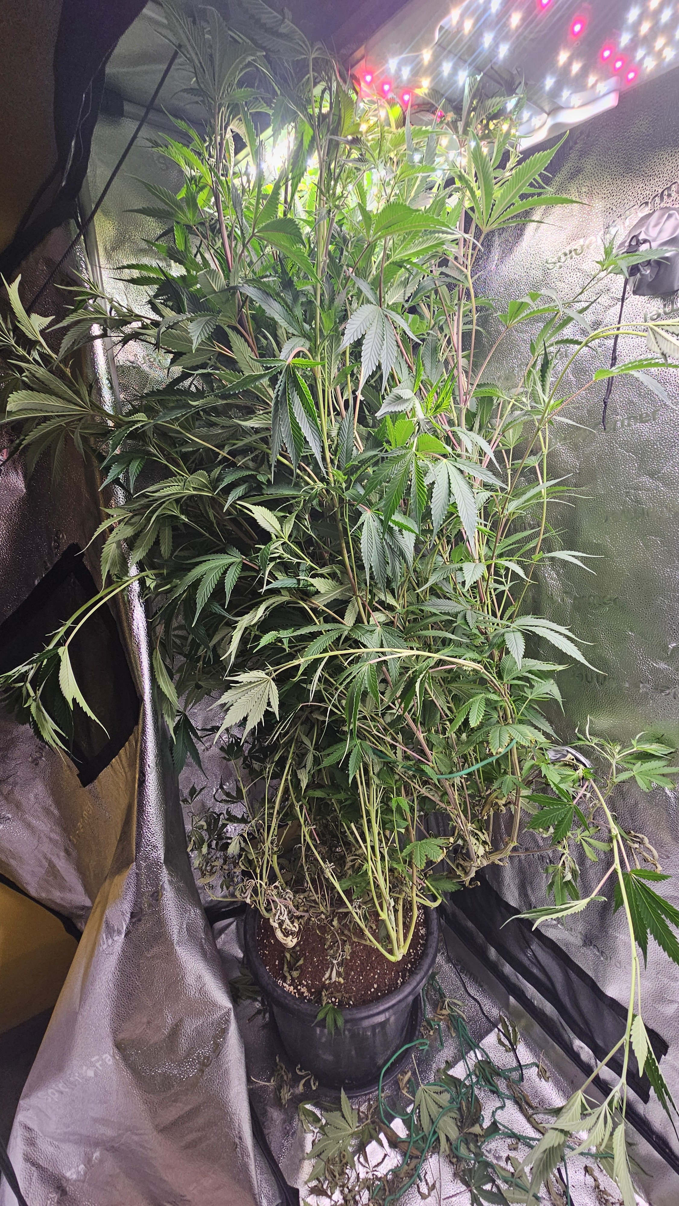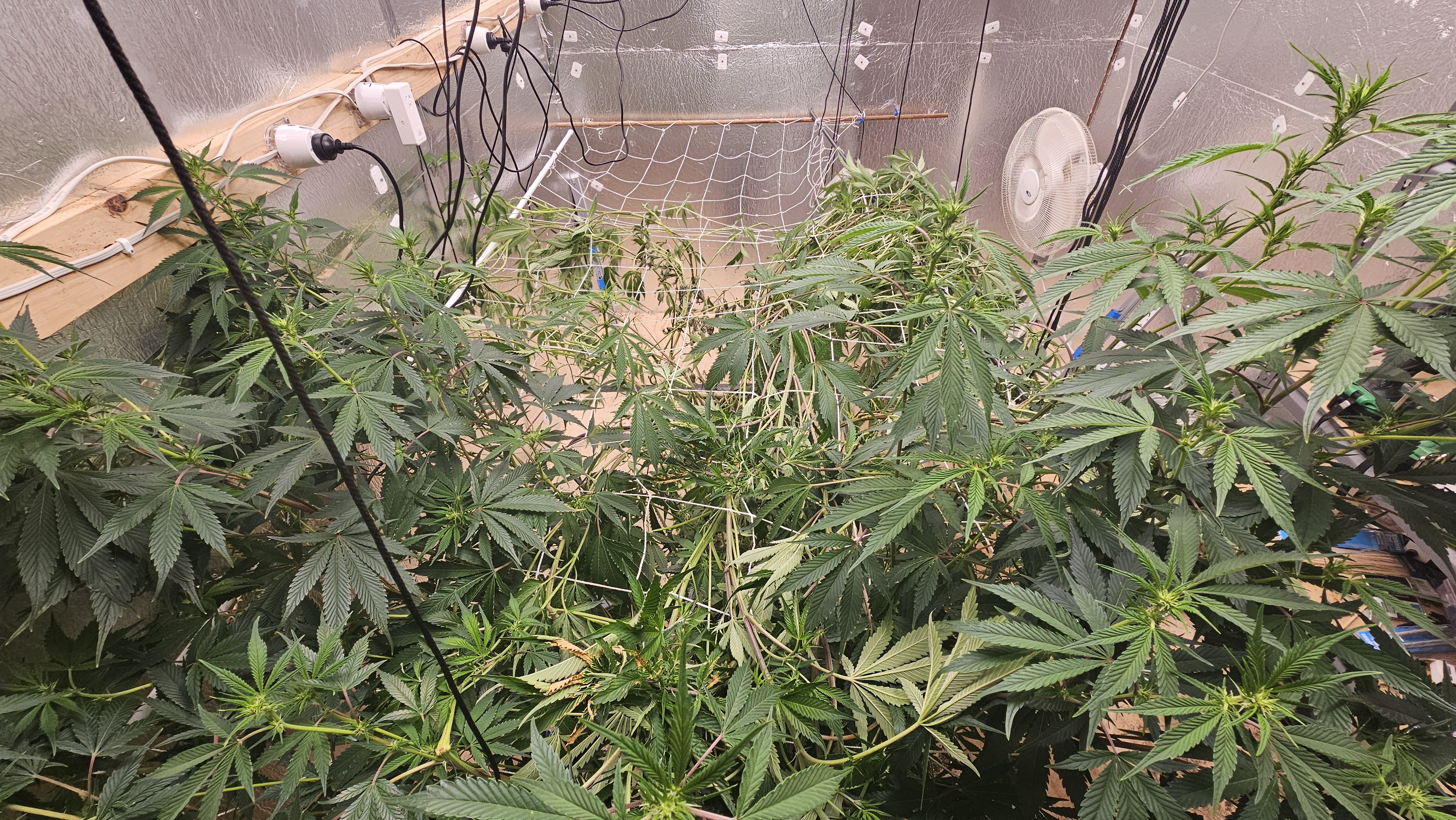 As you can see I tried to SCROG these but ended up flogging them. Canopy is around 8 to 9 ft wide.