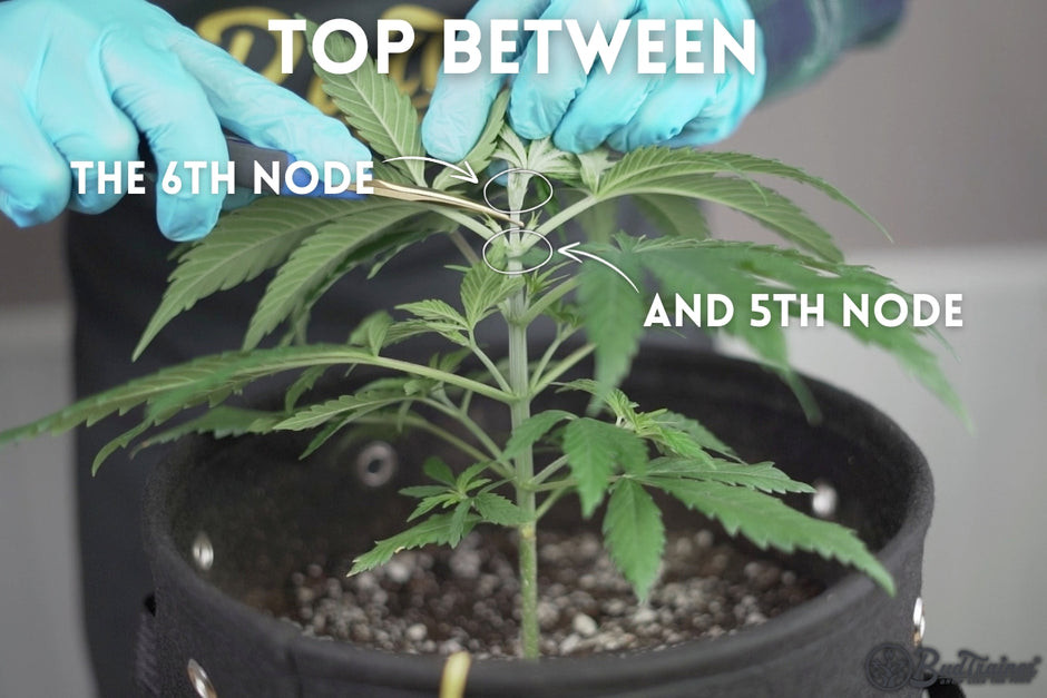 Because i love supper flat canopy and having all branches even, i don't leave anything that can shade 4th pair of auxiliary buds and their conjunction leaves so i don't allow leaves of 6th node and upper to grow and shade it. Then if don't need clone i cut the plant right above 5th node as soon as possible when there is a some millimetres above 5th node. But if i need a clone i take leaves of nodes above 5th node before they shade 4th. When the time is right i allow the must upper leaves to grow a bit and then i cut the plant above 5th node as a clone as it is the best of the best that can be taken as a clone.