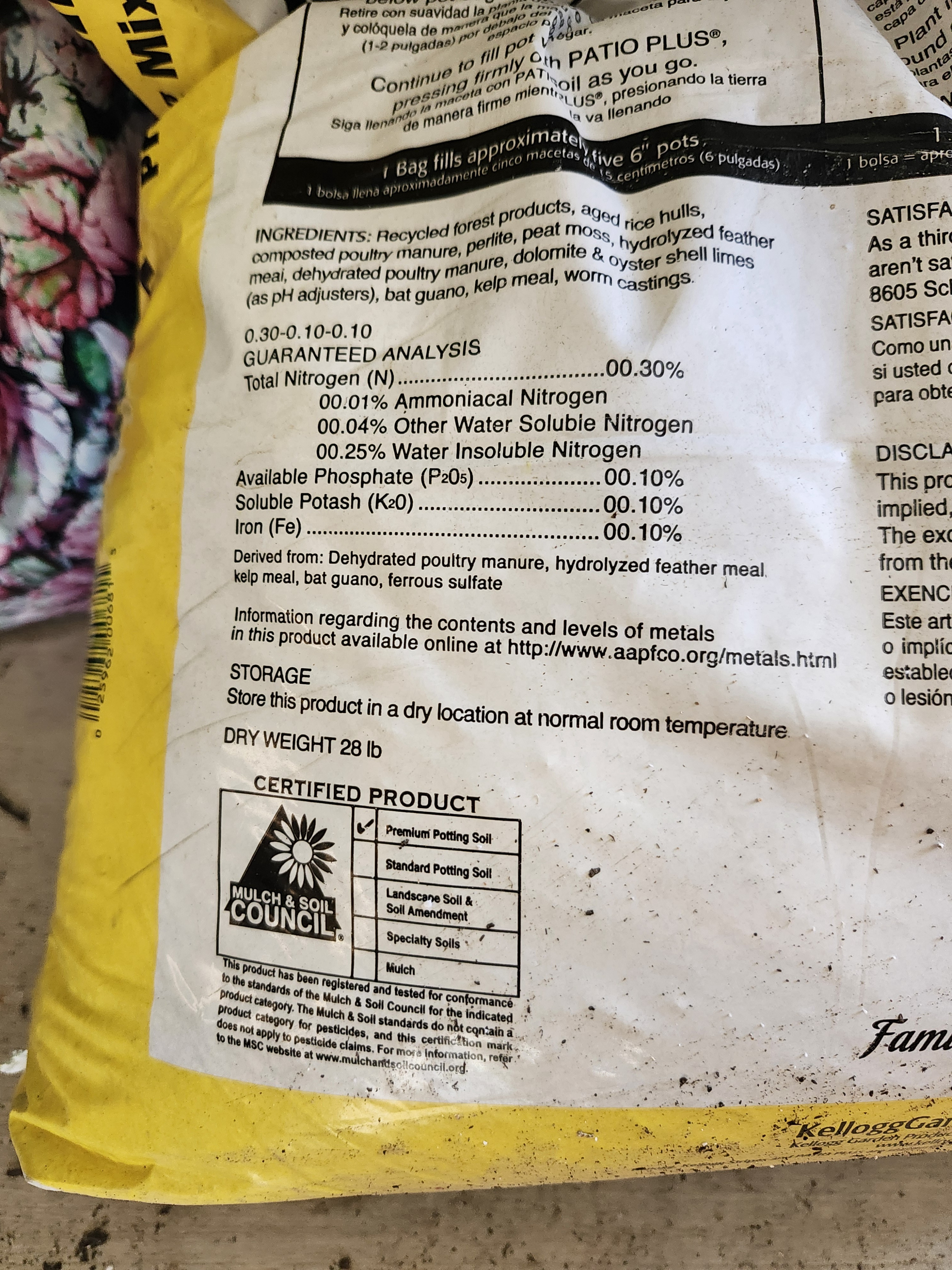 I'm also going to run this without using a cannabis specific soil. I want to see if someone with basic grow skills using the same stuff a newb would most likely buy can get to harvest. I'm using Kellog's Patio Plus which has wood chips. I'm guessing the wood chips are their "version" of perlite because there is almost zero perlite in the mix even though the analysis lists it high up on the ingredients list. I went ahead and amended the soil with around 30% Perlite. Everything I'm using is available at your local hardware store.