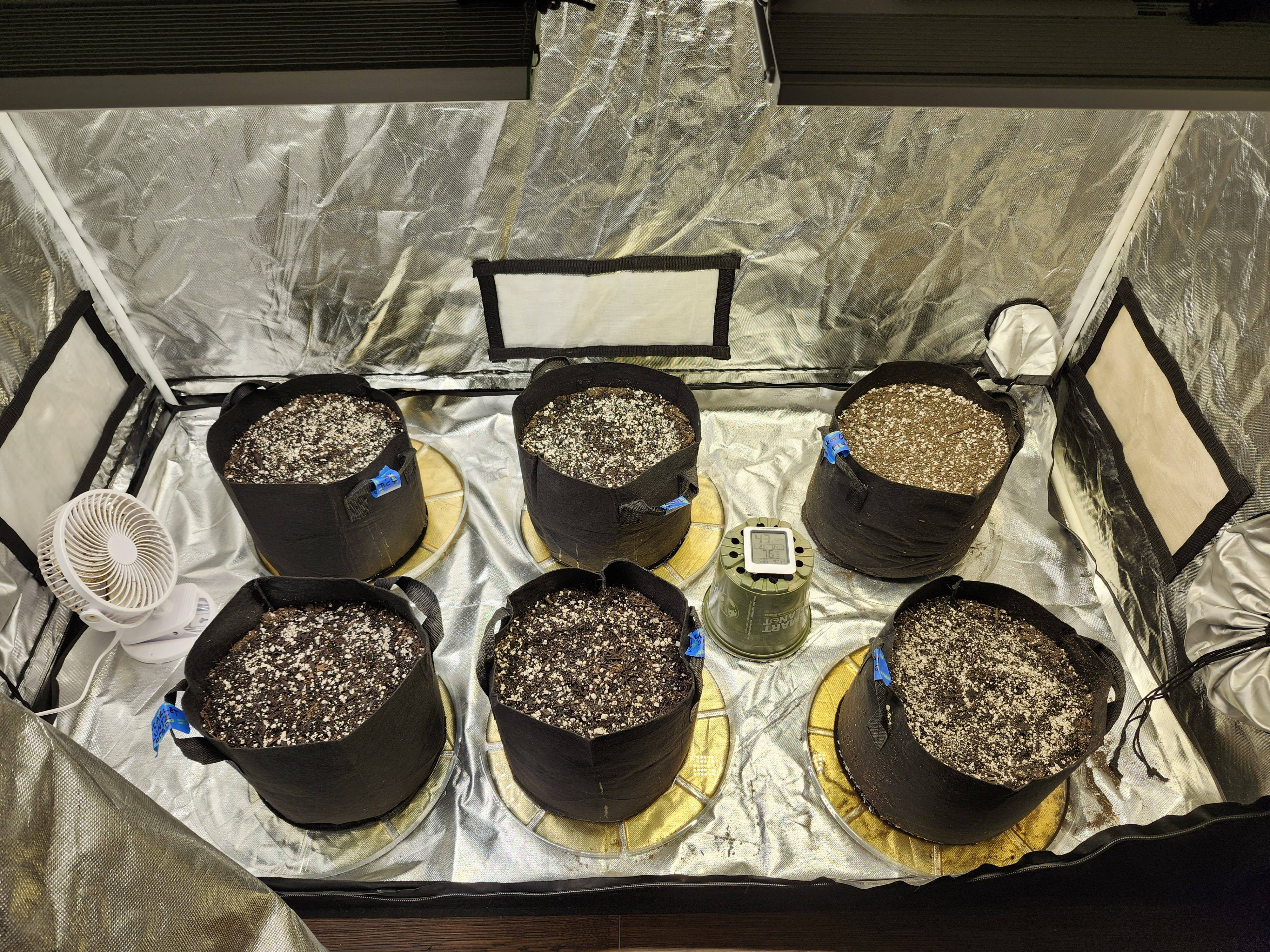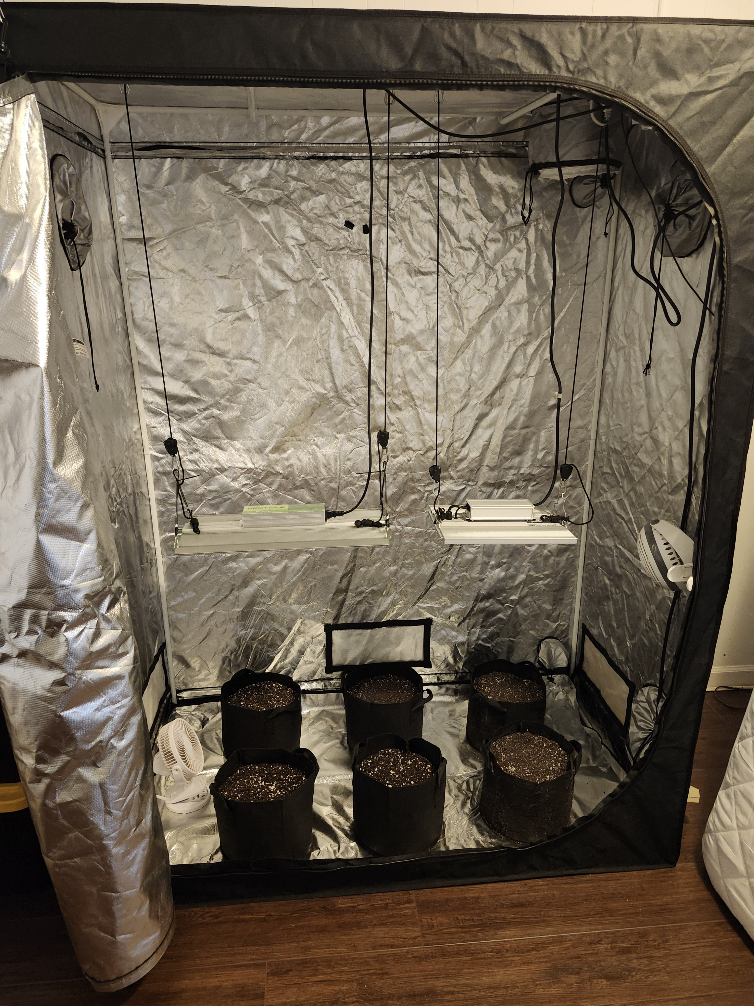 Setup waiting for the seeds to be ready for their final home. Still need to get some runoff plates and plant stands to get them up off the floor but otherwise we're ready to rock!