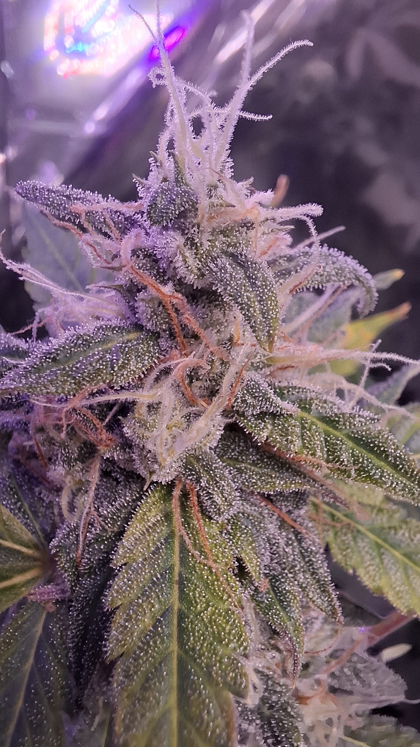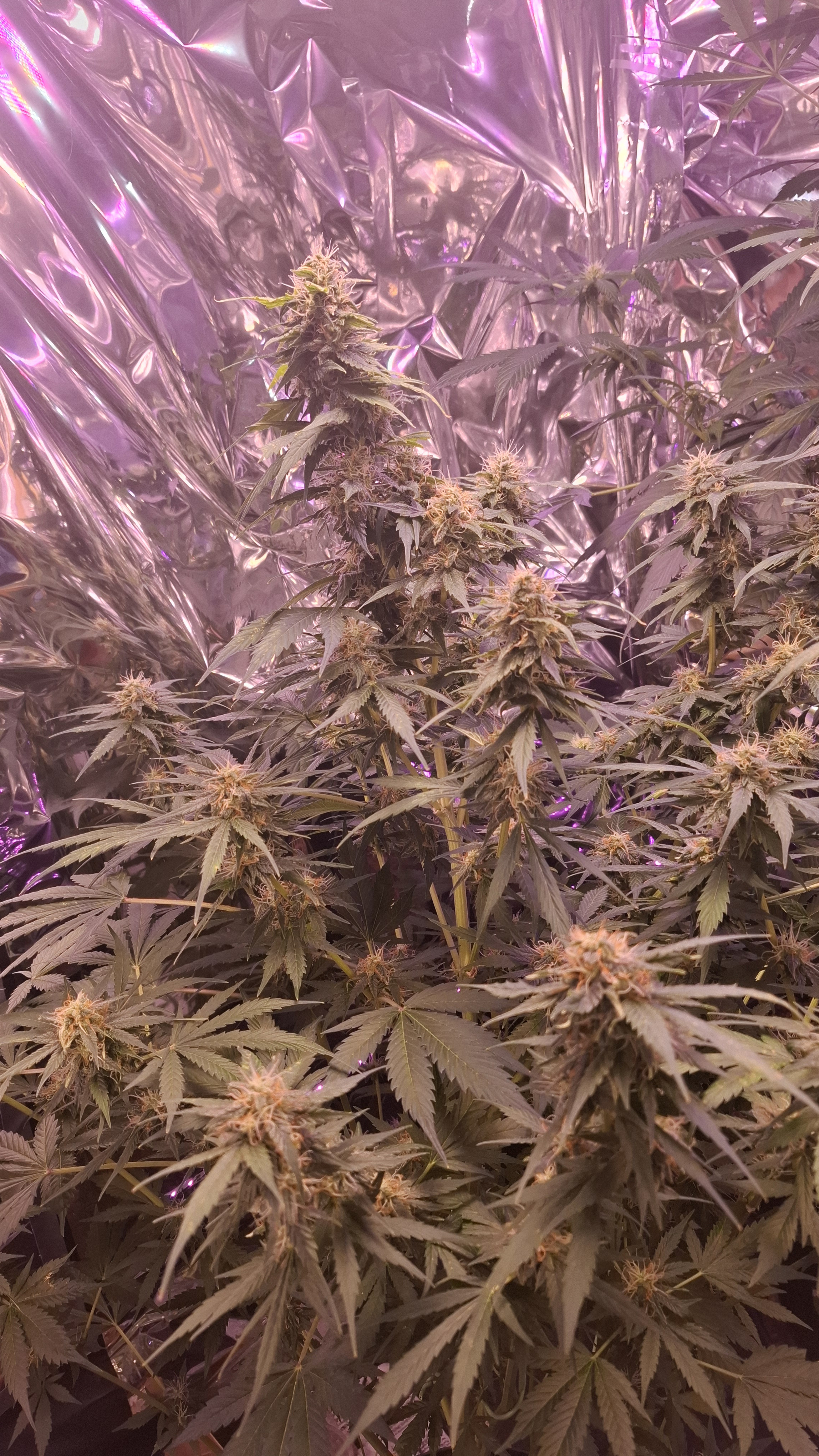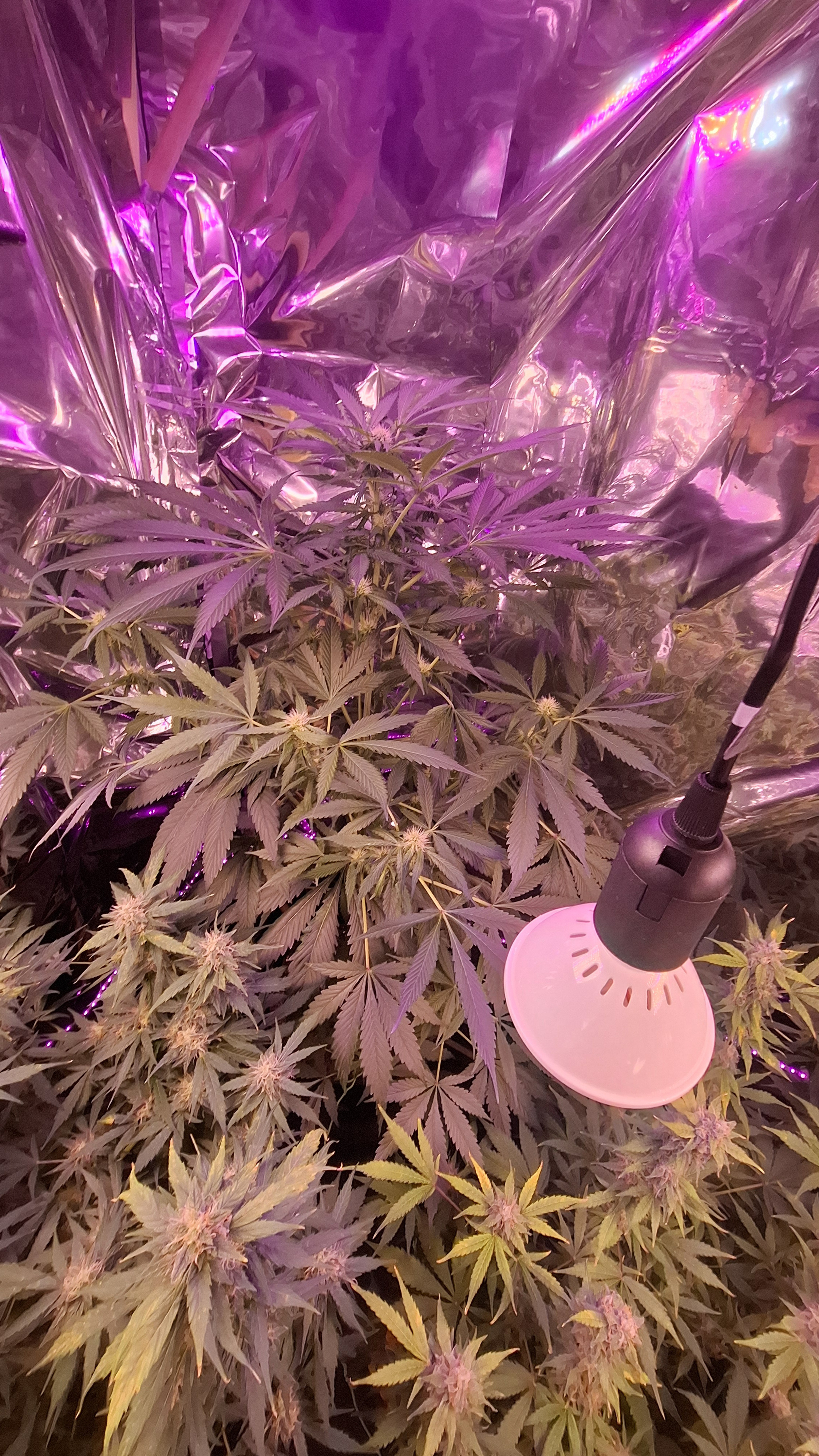 Temp between 22 and 25, humidity between 50 and 60, but slowly dropping between 45 and 55%. Ph water between 6.6 and 6.8. In the beginning i had the light 24h on, changed it to 20/4 , should be ok because autoflowers. Had to up the K when in ful flower, giving water only from now on, the left should get 1 or 2 more loads but the right one, water only. My cookies gelato auto is allready 4,5 ft high, almost impossible to get the light higher, searching for a solution here 🤭😅🤪