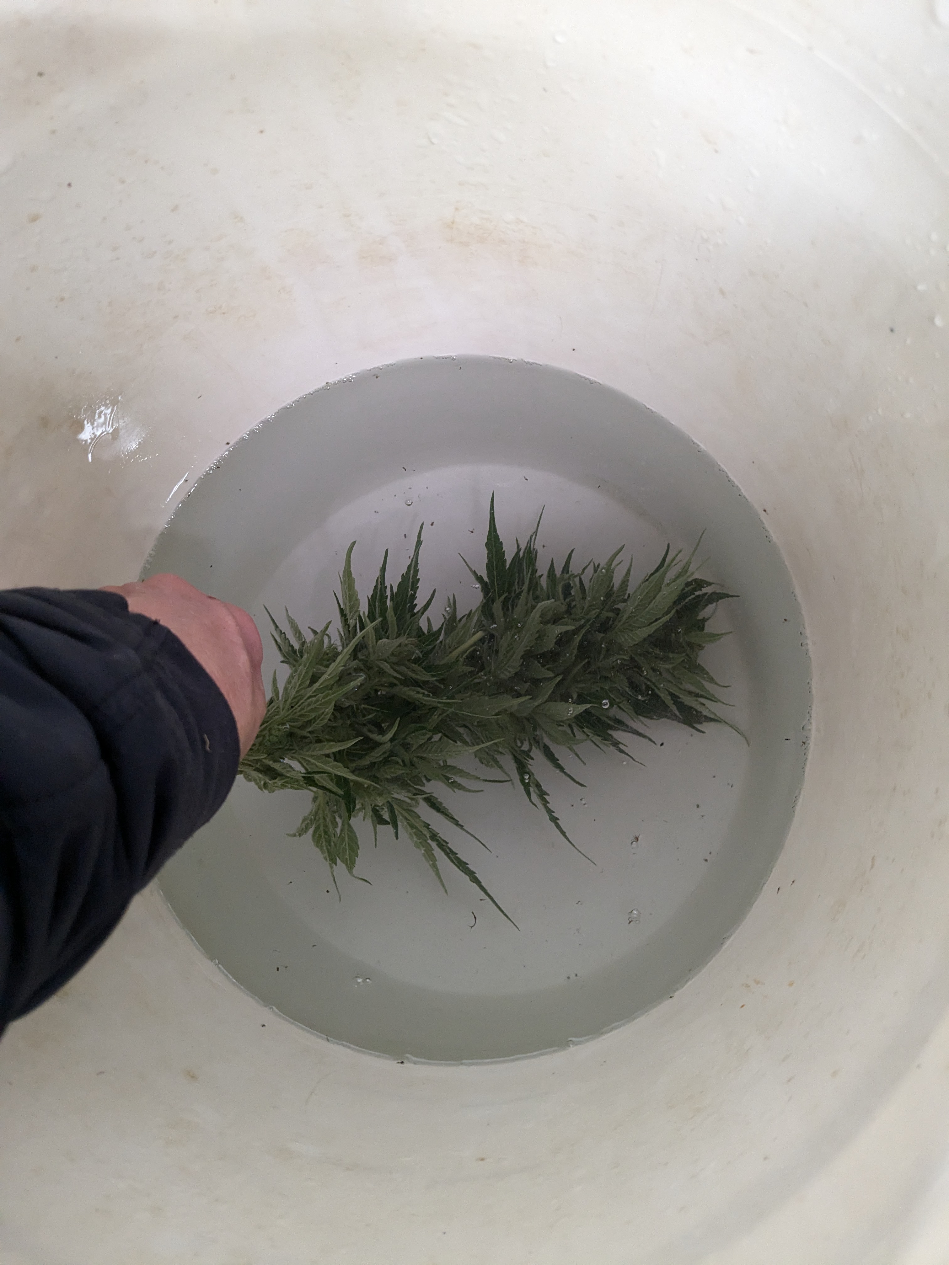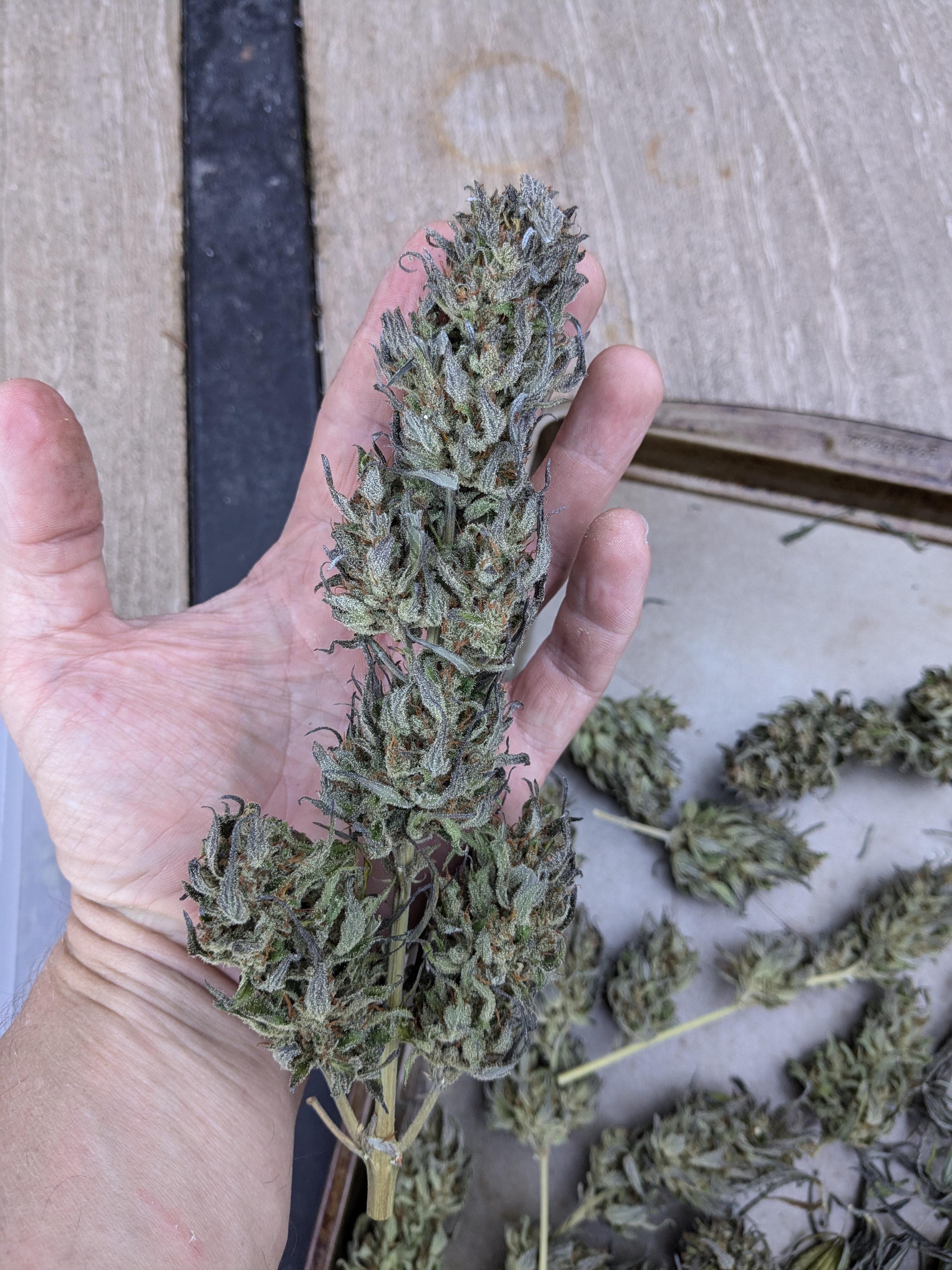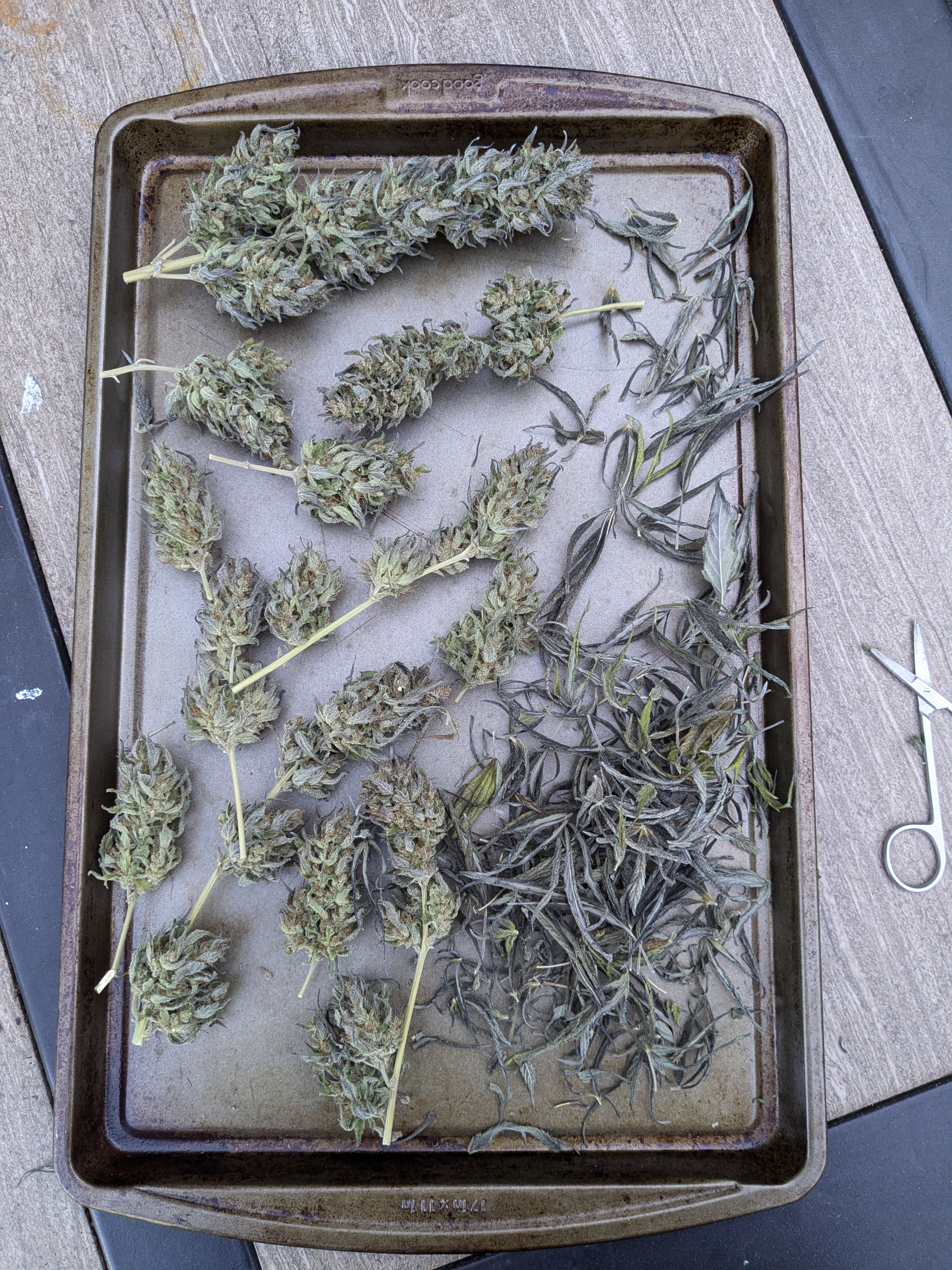 Well boys, the summer ended quickly, we've had cool weather and rainy days over the last week and a half and well, you know what that means. Mr. Rot. I really thought I could squeeze two sets of auto grows in this summer but I had a suspicion I didn't start early enough and was hoping for that Indian Summer we sometimes get. Win some, lose some. Inspecting the plants today revealed that tell tale color on bud after bud. I probably cut out about a quarter of what would have been the harvest. I don't usually use a bud wash for for the stuff that didn't appear to have rot on it I gave it a bath in .5 cup of 3% hydrogen peroxide plus 2.5 gallons of water, hoping to stop any rot that remains while I try to dry and cure these plants. I left one branch of the Honey Peach (the one I had pollinated and is growing seeds)--found some rotting buds on this so it's probably a fools errand but doesn't really hurt anything to leave it. The Devil's Food Cake I also left, as it's a couple of weeks behind and had no rot on it at all (the buds are not as thick), though I did trim out some inner branches with bud just to improve airflow. I suspect that is going to be a lost cause unless things get warmer and drier quick, but that's not on the forecast. Oh well, it was still fun to grow and I have plenty of other weed, so if this stuff turns out bunk I'll just make it into balm or something. I will say that the Pound Cake is quite nice, not as amazing as the Scarlet Grapes but definitely up there. The Honey Peach had an amazing aroma but was pretty leafy and the buds were thin. I guess that probably makes sense for a 1:1 CBD as it's half hemp and hasn't gone through the years of selection like THC heavy strains.