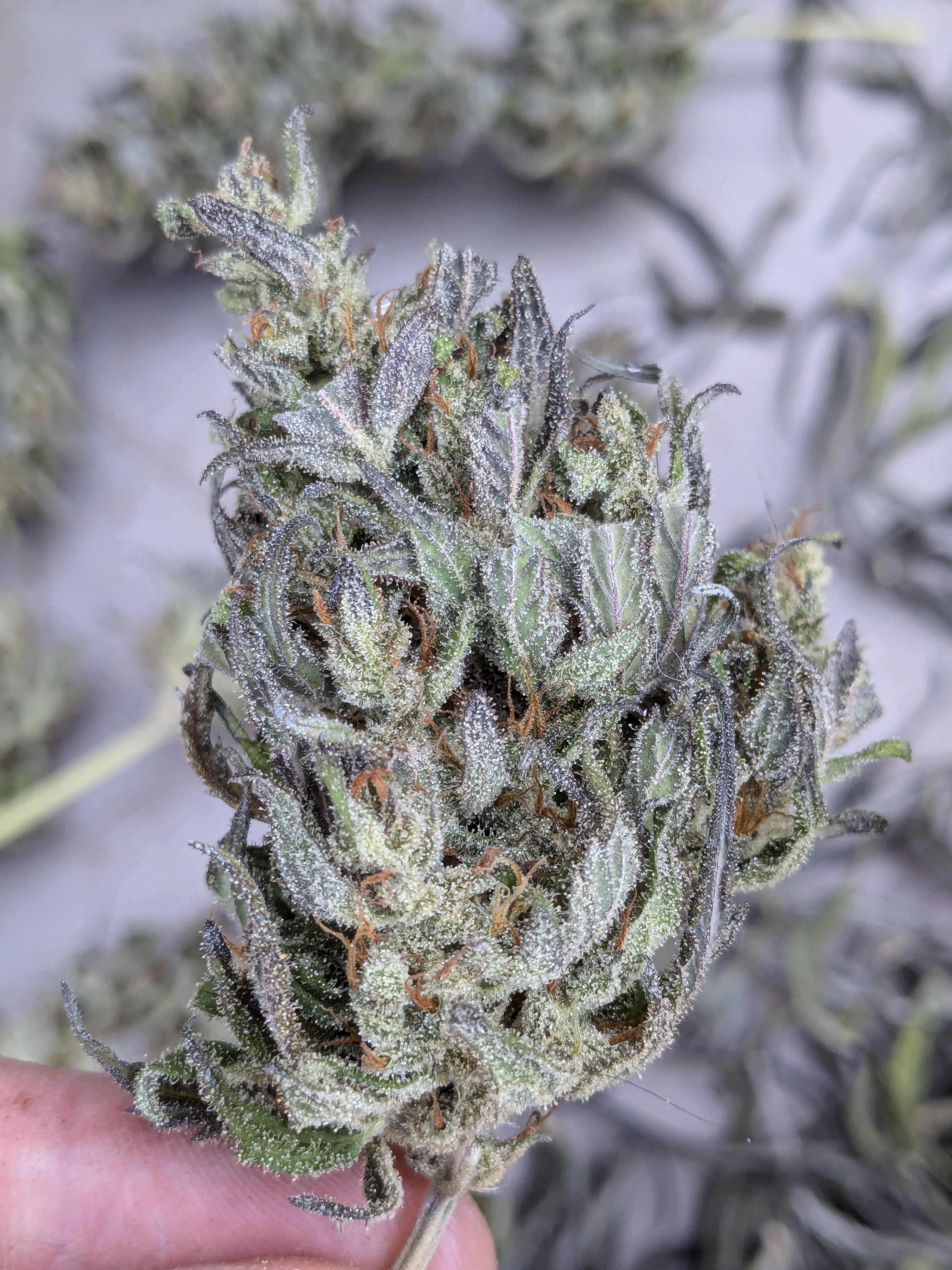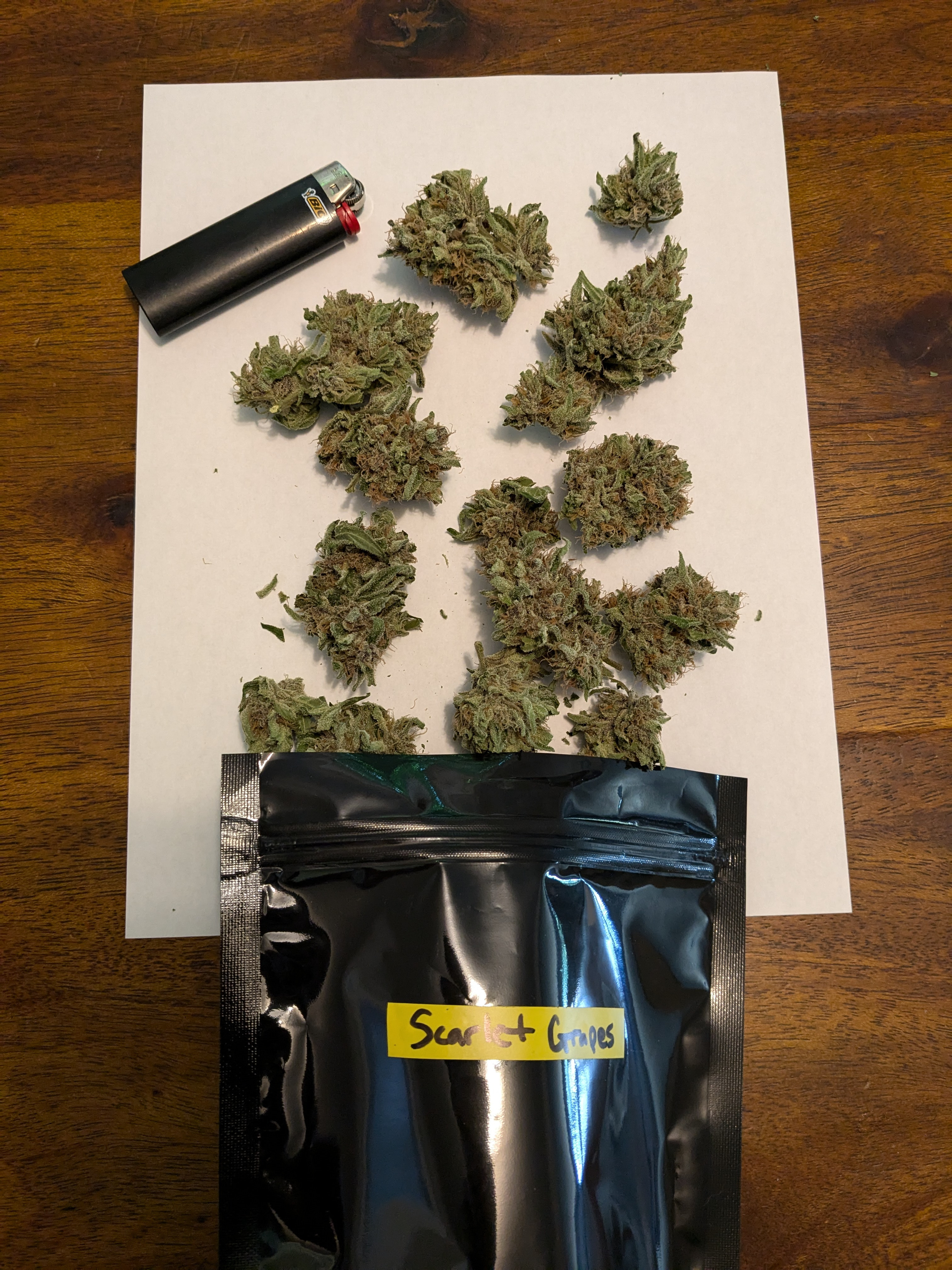 After dry/fast cure of Going2fast Scarlet Grapes I ended up with 2.25 oz of very high quality flower. Probably would have had 3 with the bus I had to destroy due to rot. Great haul. Unsmoked it smells like hoppy lemon/lime/pine. Vaping is phenomenal, very complex flavors, strong with a positive and clear high. Probably the best quality I've ever grown.
