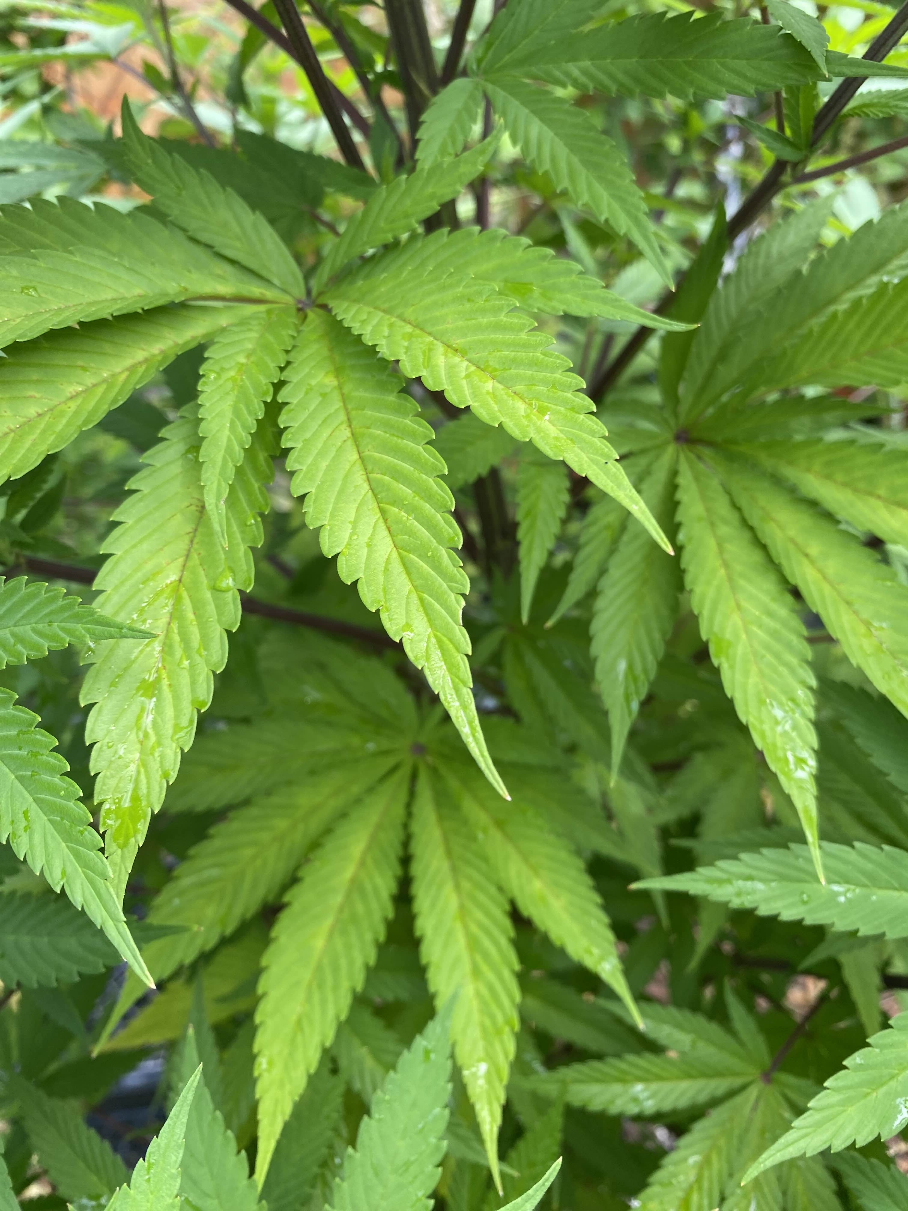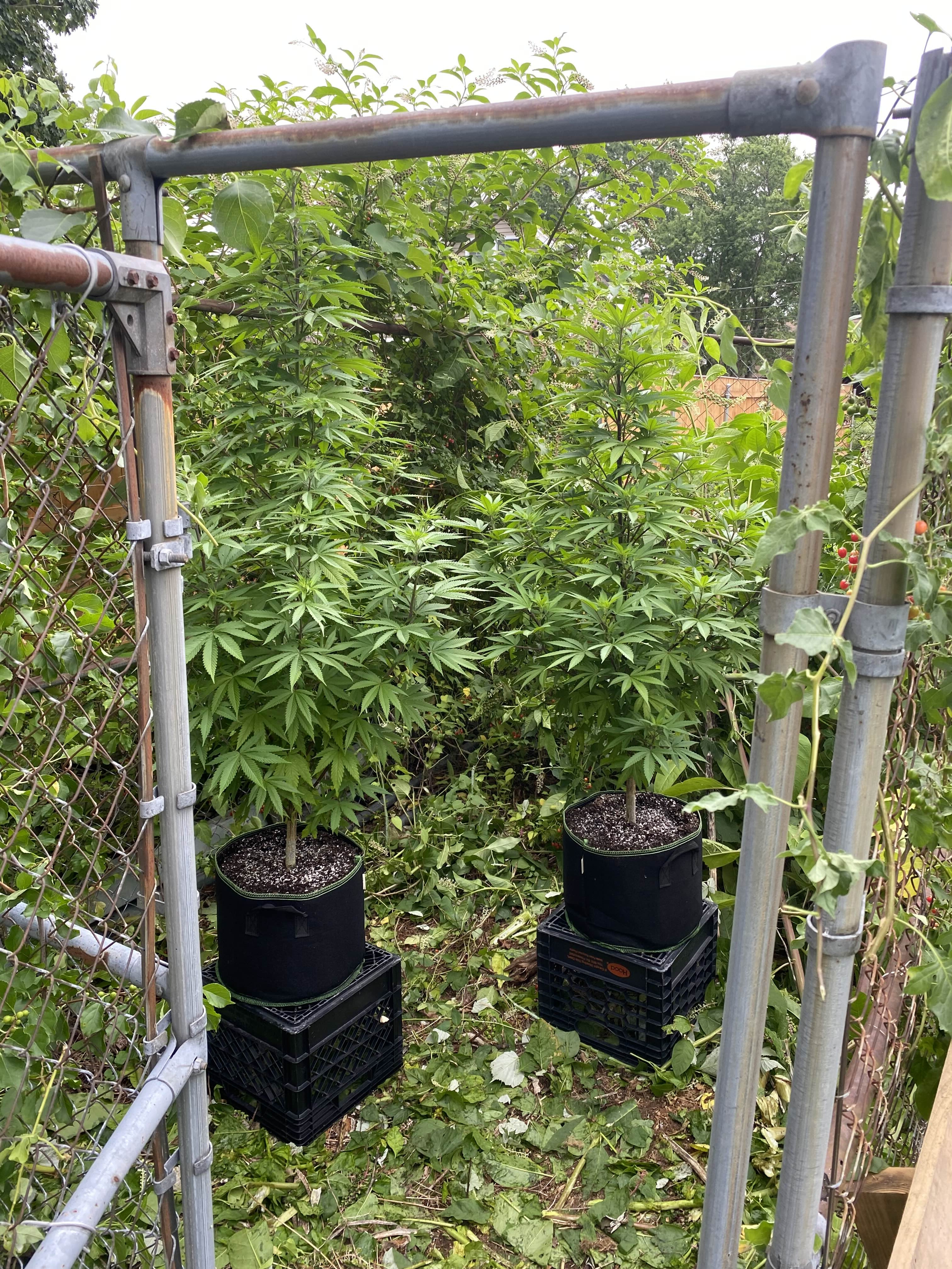 The three pictures show 2 close-ups of bottom leaves (more yellow) and middle leaves (just starting to yellow). The last older picture shows both the male (left) and female (right) in the Dank Cage.