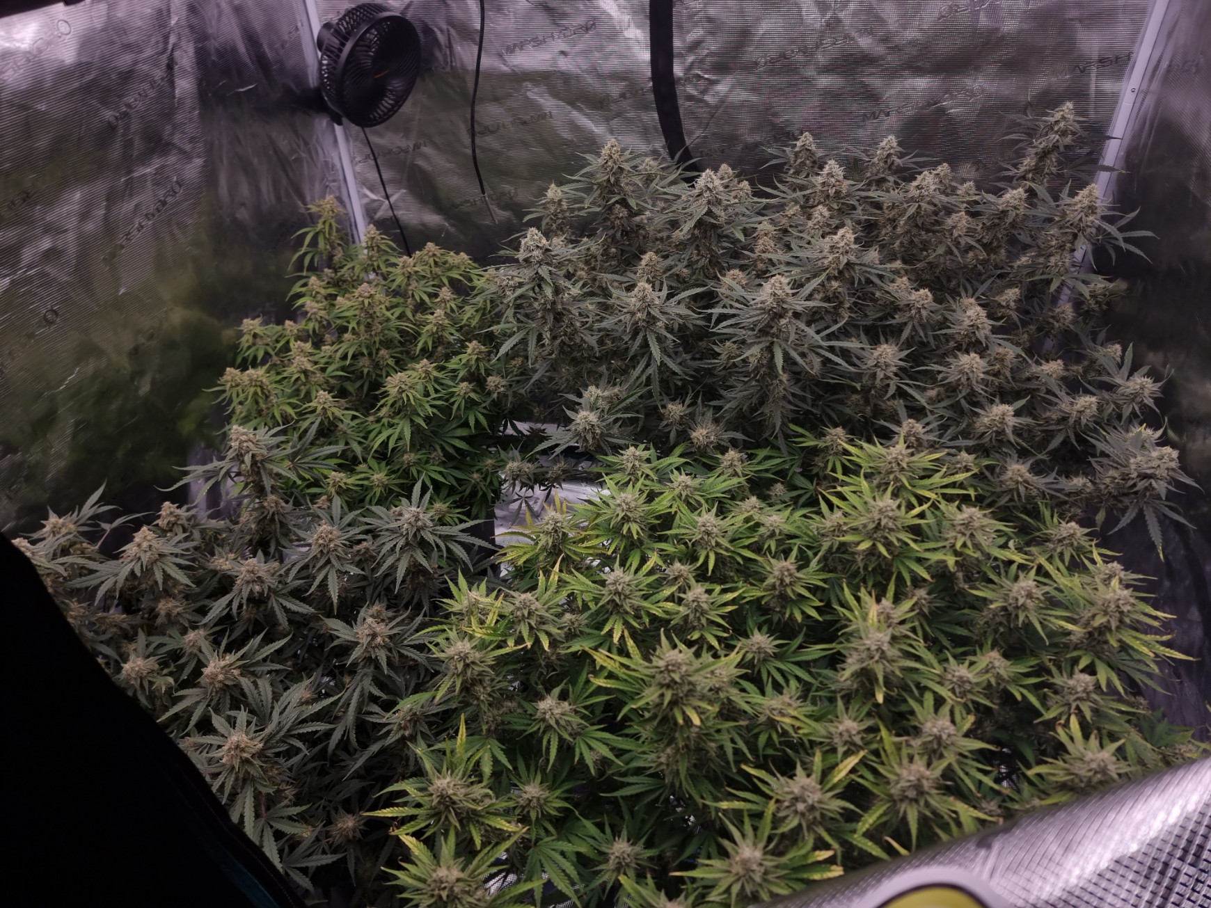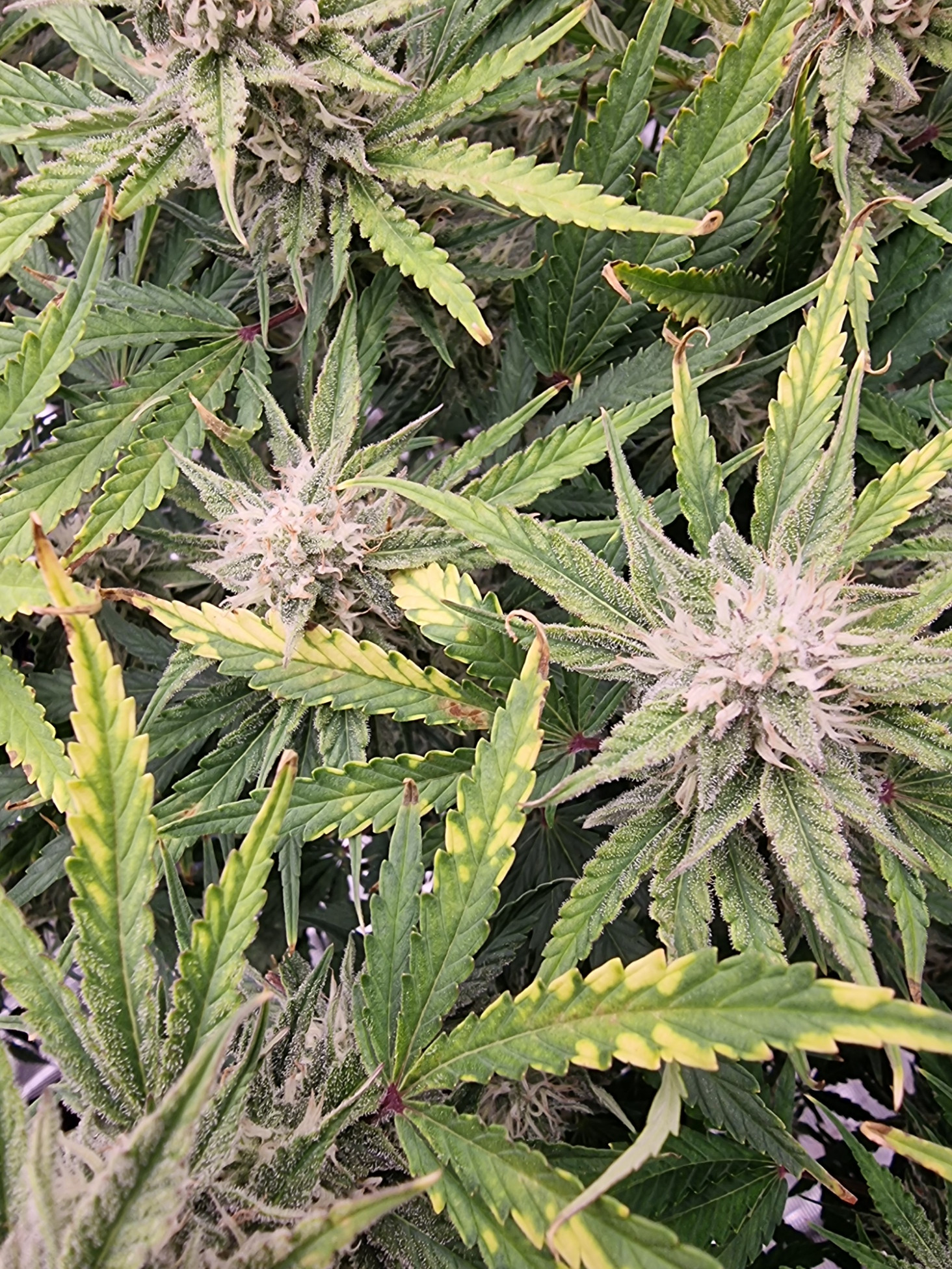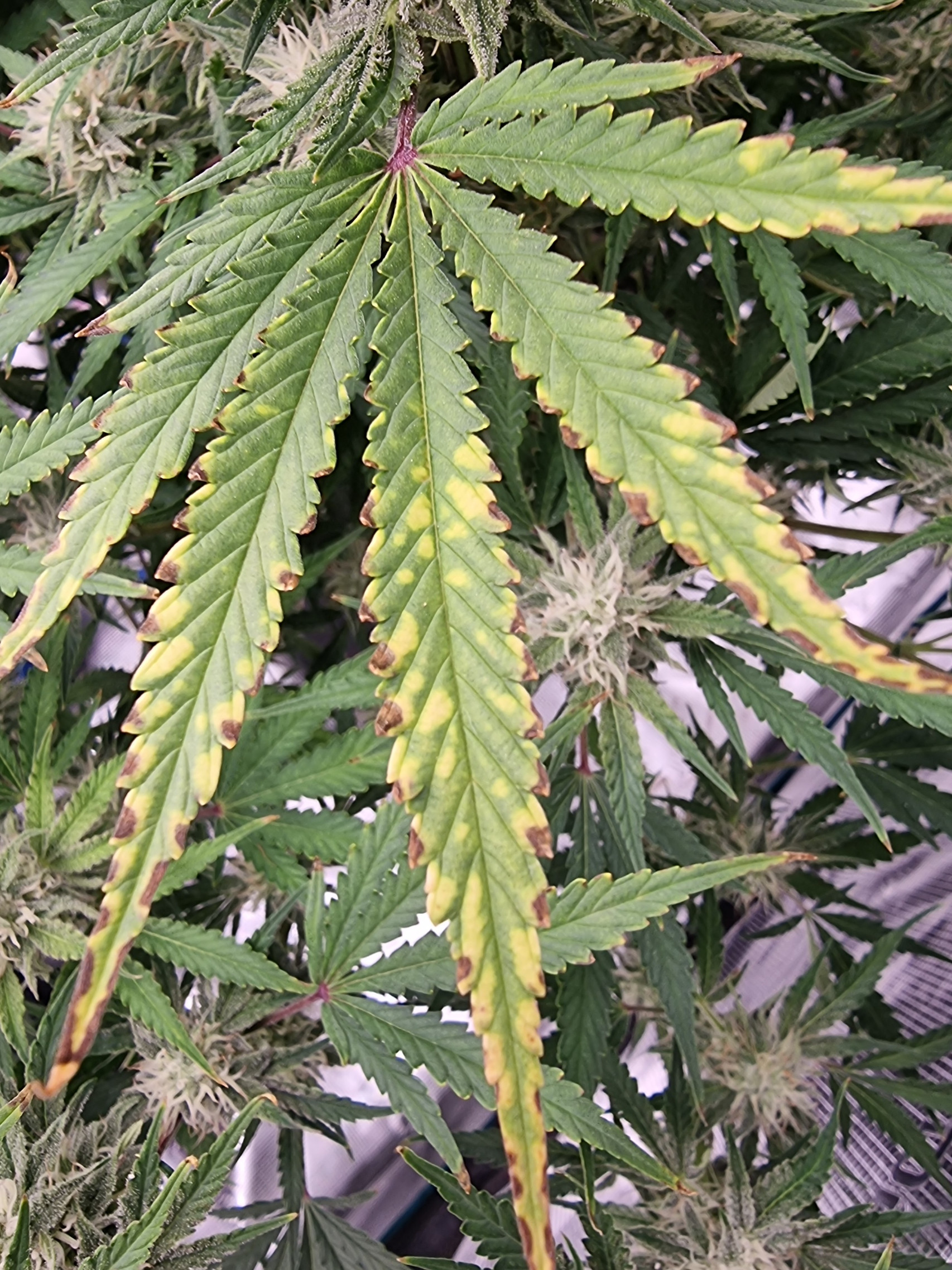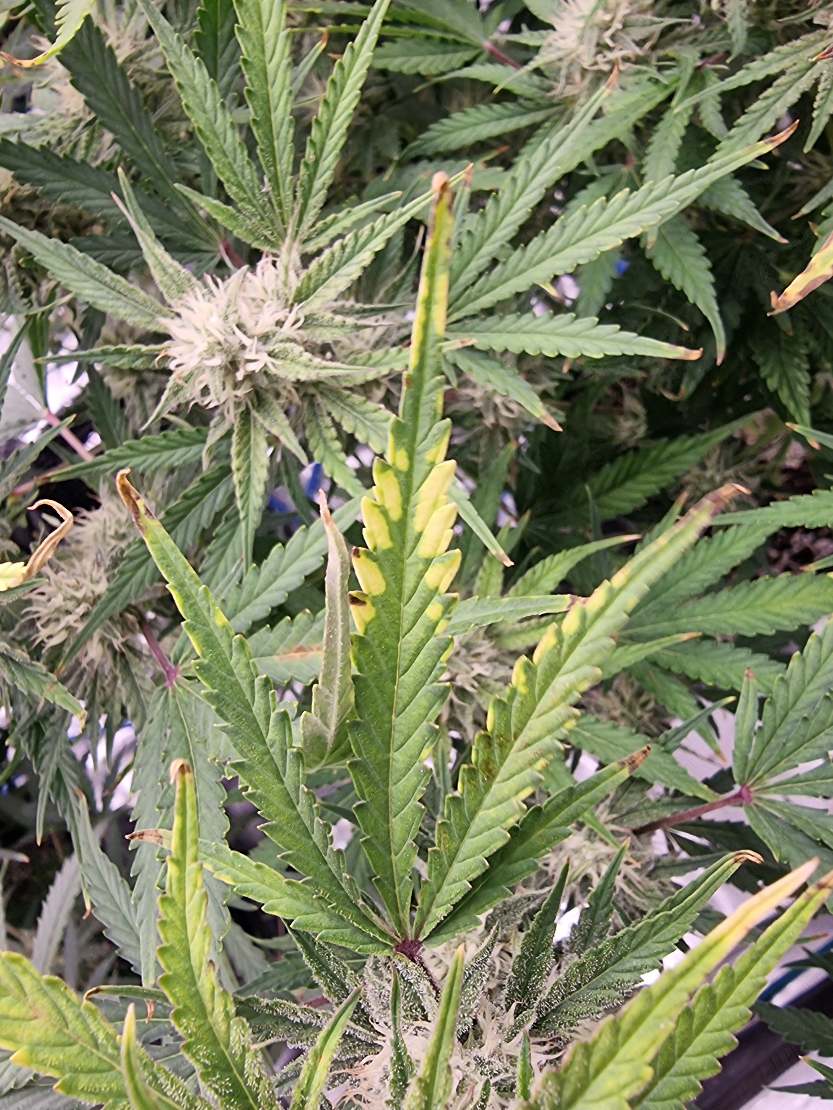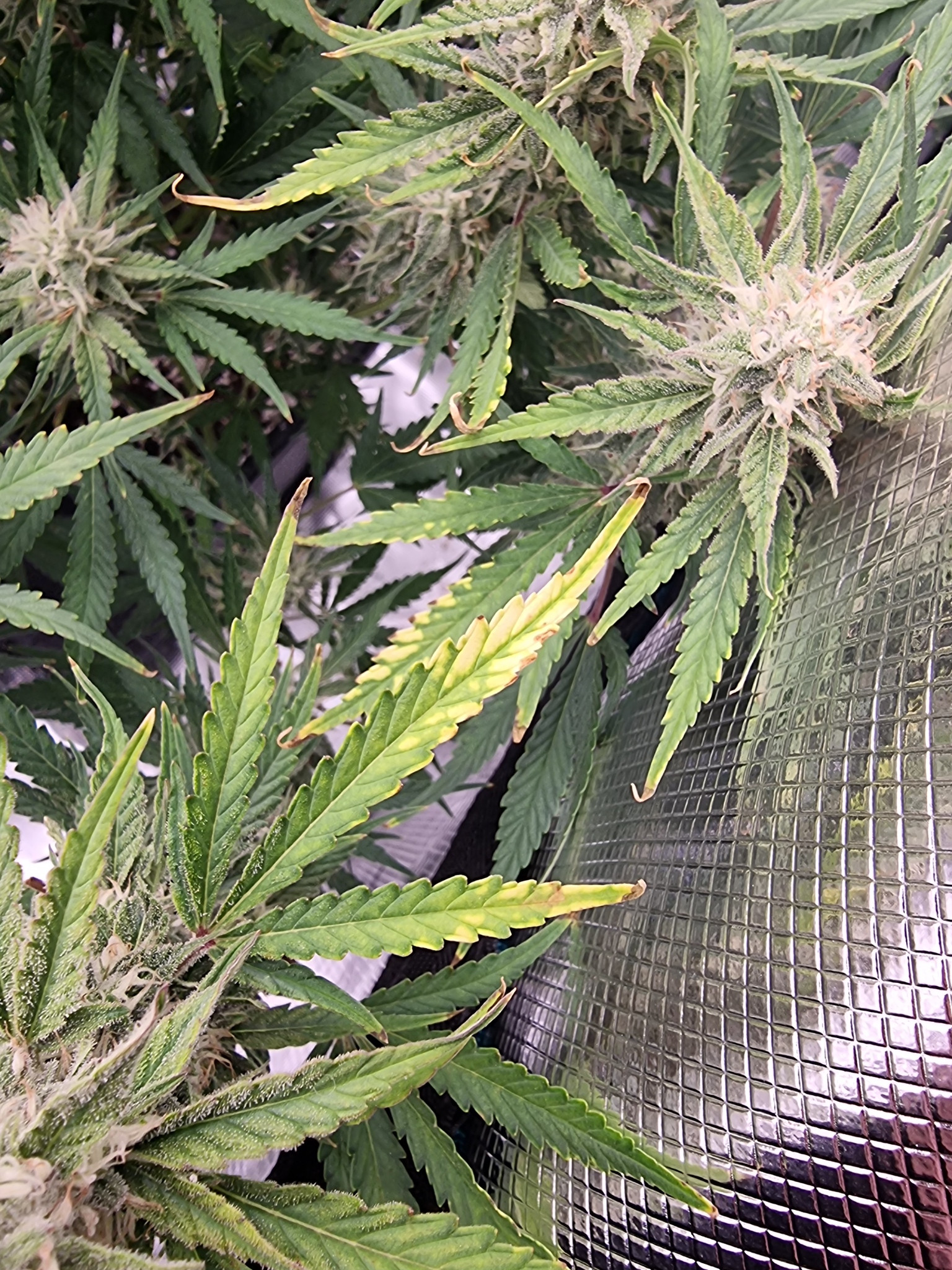 As of ~20 days ago, weird yellow tips grew out on one of the plants. And now it's pure chaos. Leaves dying everywhere on the top canopy, really weird blotchy yellow leaves, very sharp contrasts, some nute burn here and there probably. GWE doctor is absolutely not able to help, it's impossible to find the cause of whatever this is. I tried really low EC, I even flushed this plant (over 120L of 0.8EC solution + surfactant through one pot), and and and. It keeps spreading.