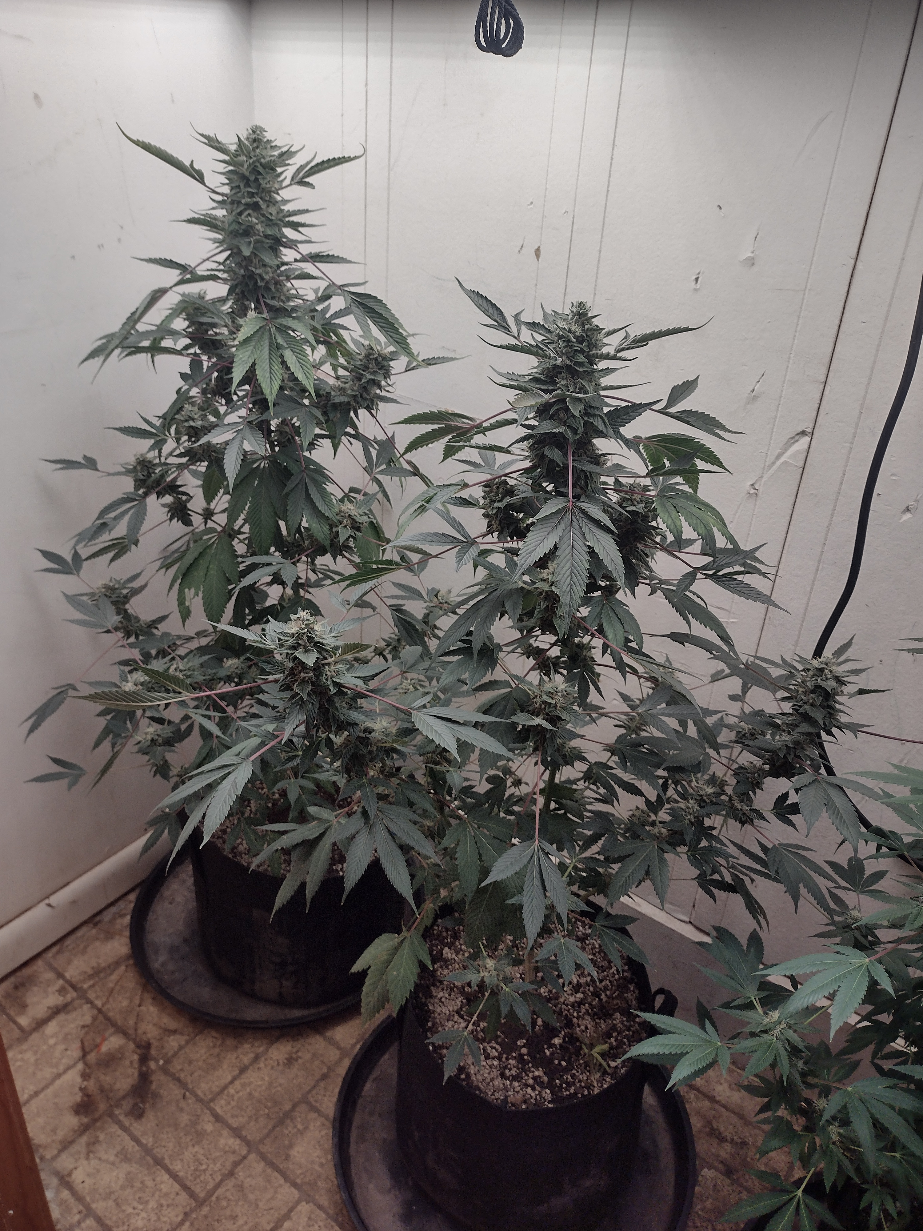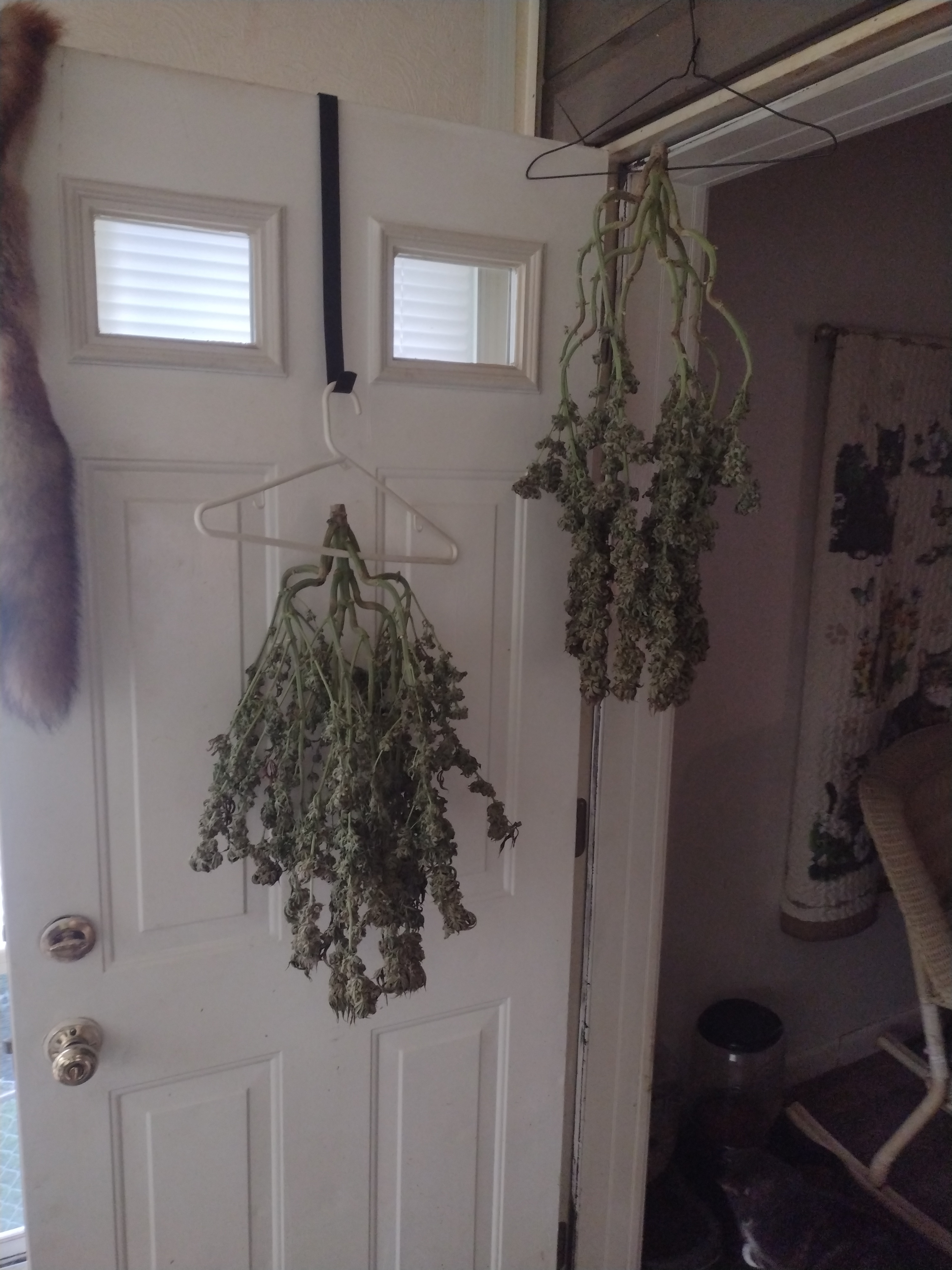 Sssaaayyy... I notice you are hanging whole plants. This is my first time hanging whole plants because I ran out of room and hangers. To help drying time I crushed and split the main stalks down their middles.