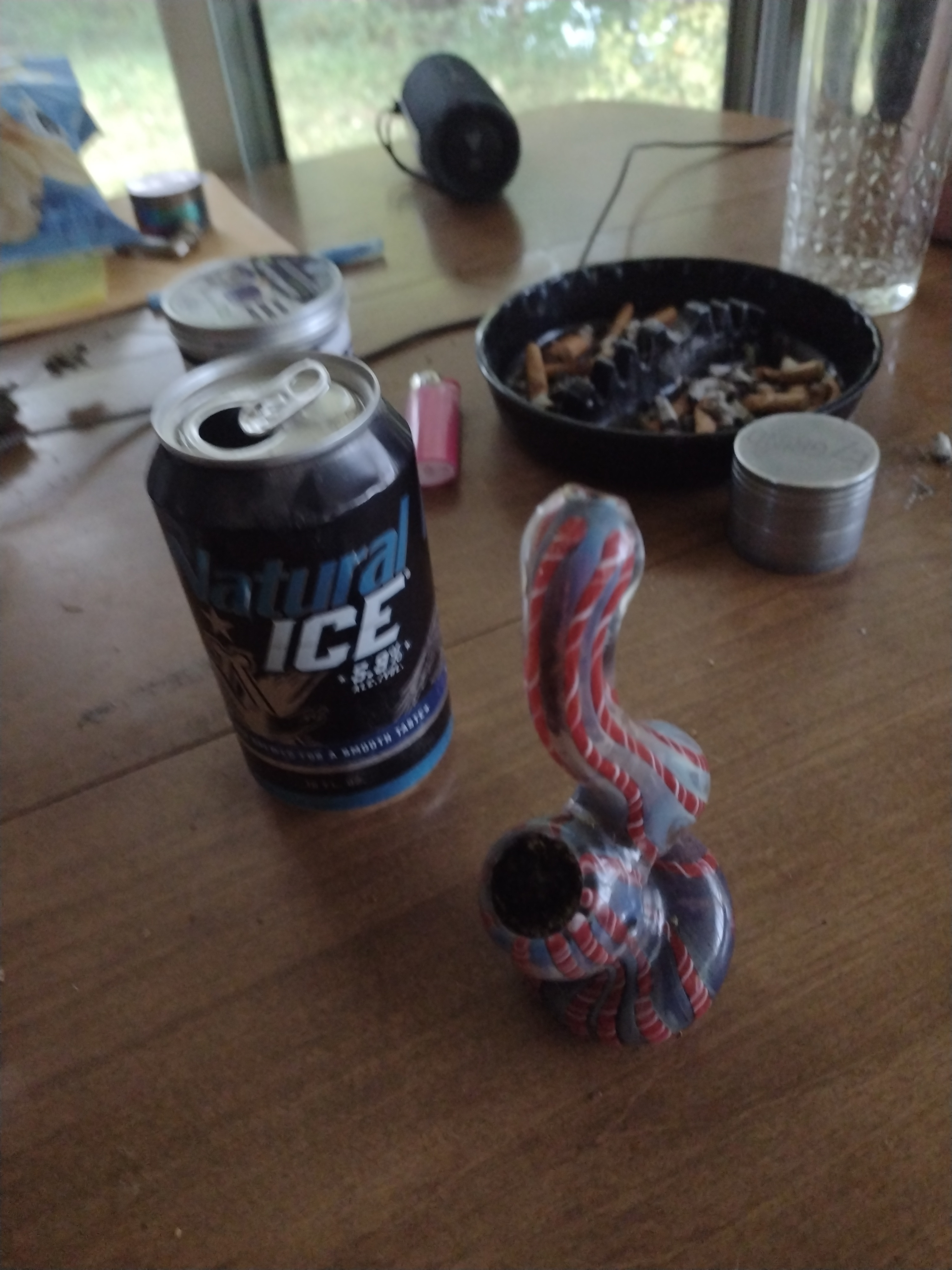 Natty Ice = NIce. I like a nice bong and ice, but I left mine on a boat a while ago and I don't think it's coming back. Nasty old resined up pipe and rolling papers are what I've been using lately. Finely poked the resin right and got it to clear really well today. I've been smoking Blue Banana most of the day. Nice mellow hybrid. I've been prepping king salmon in a brine to smoke tonight. Feeling pretty nice. No natty ice in my nice though. Haha.