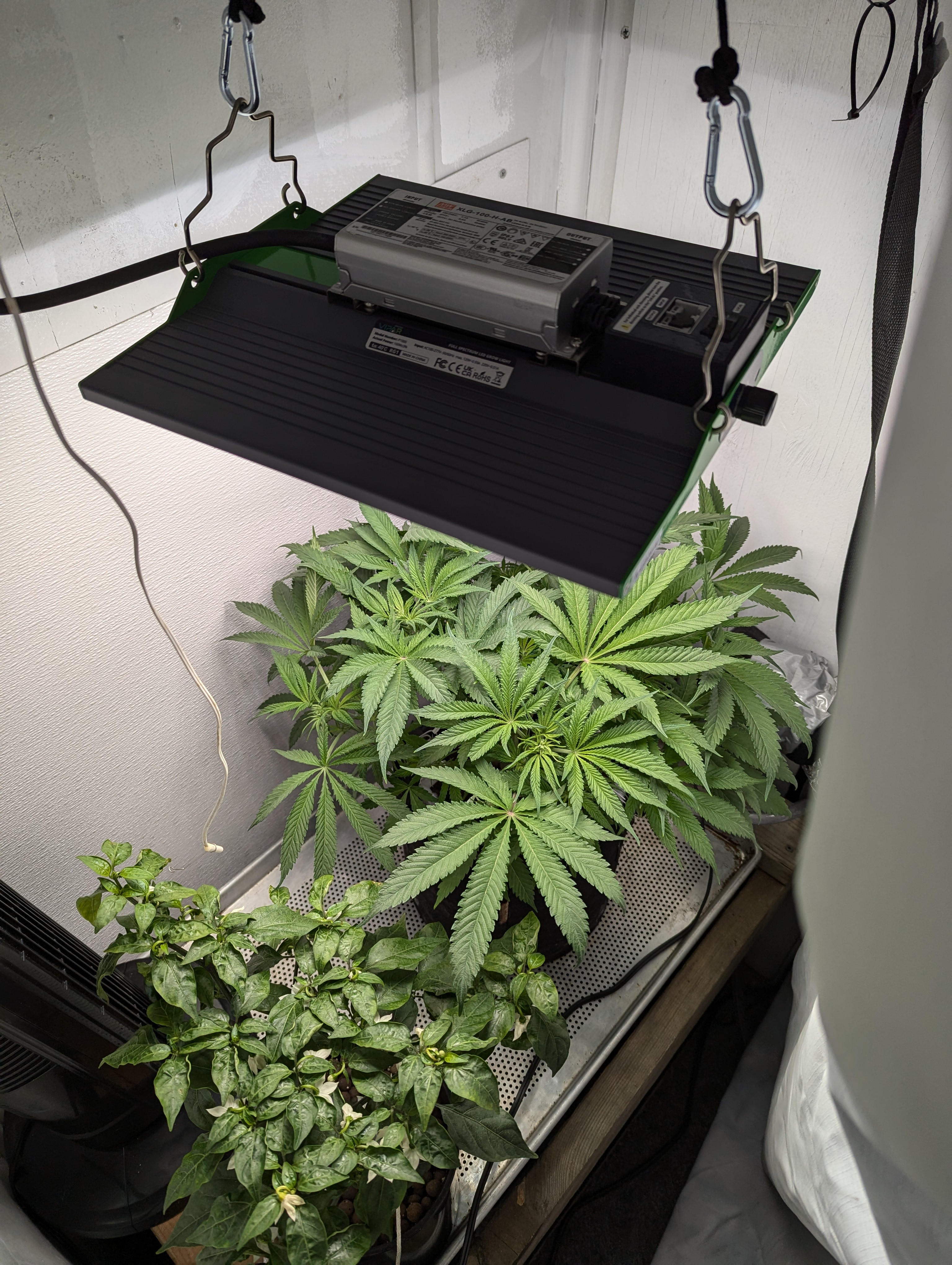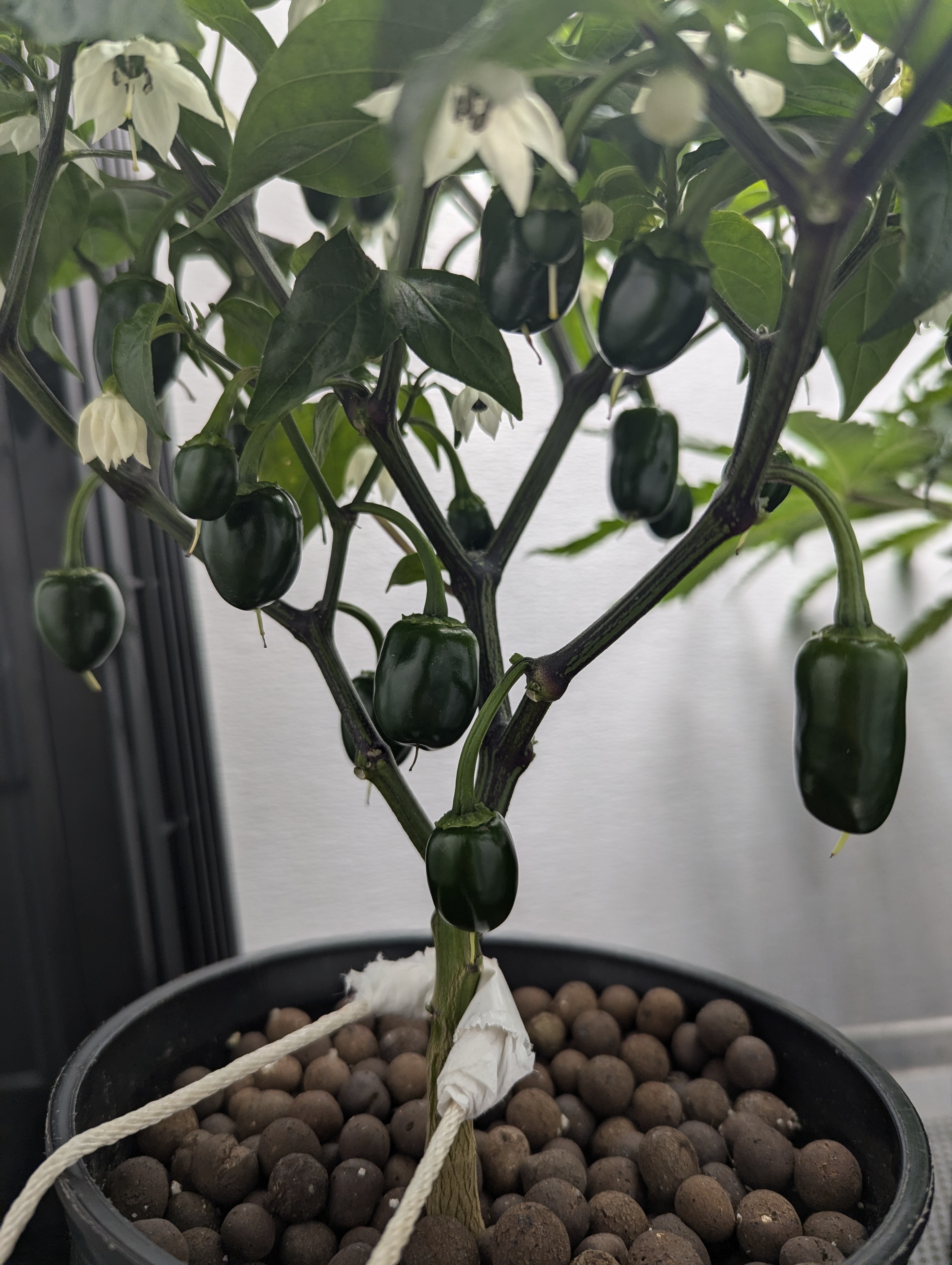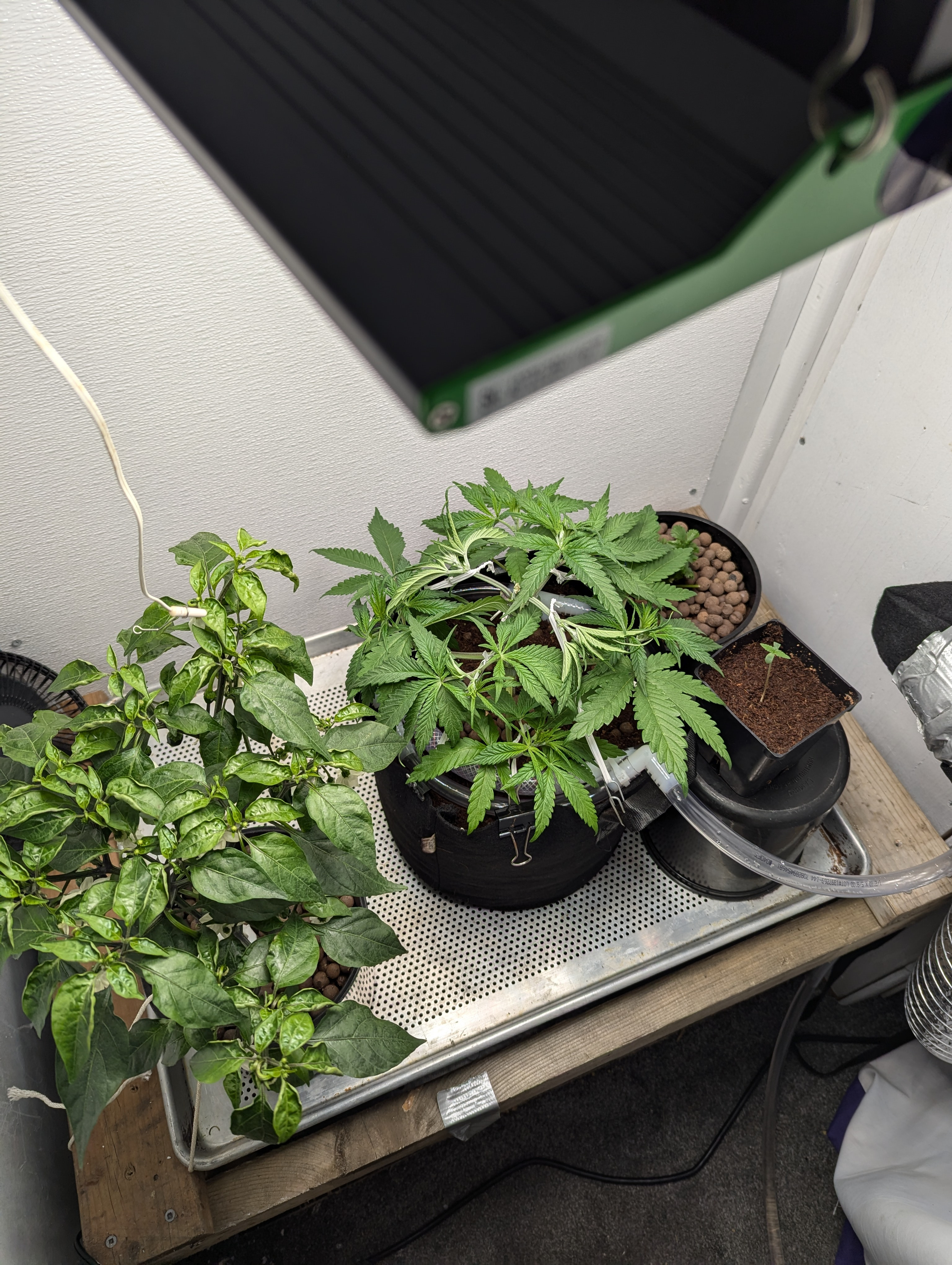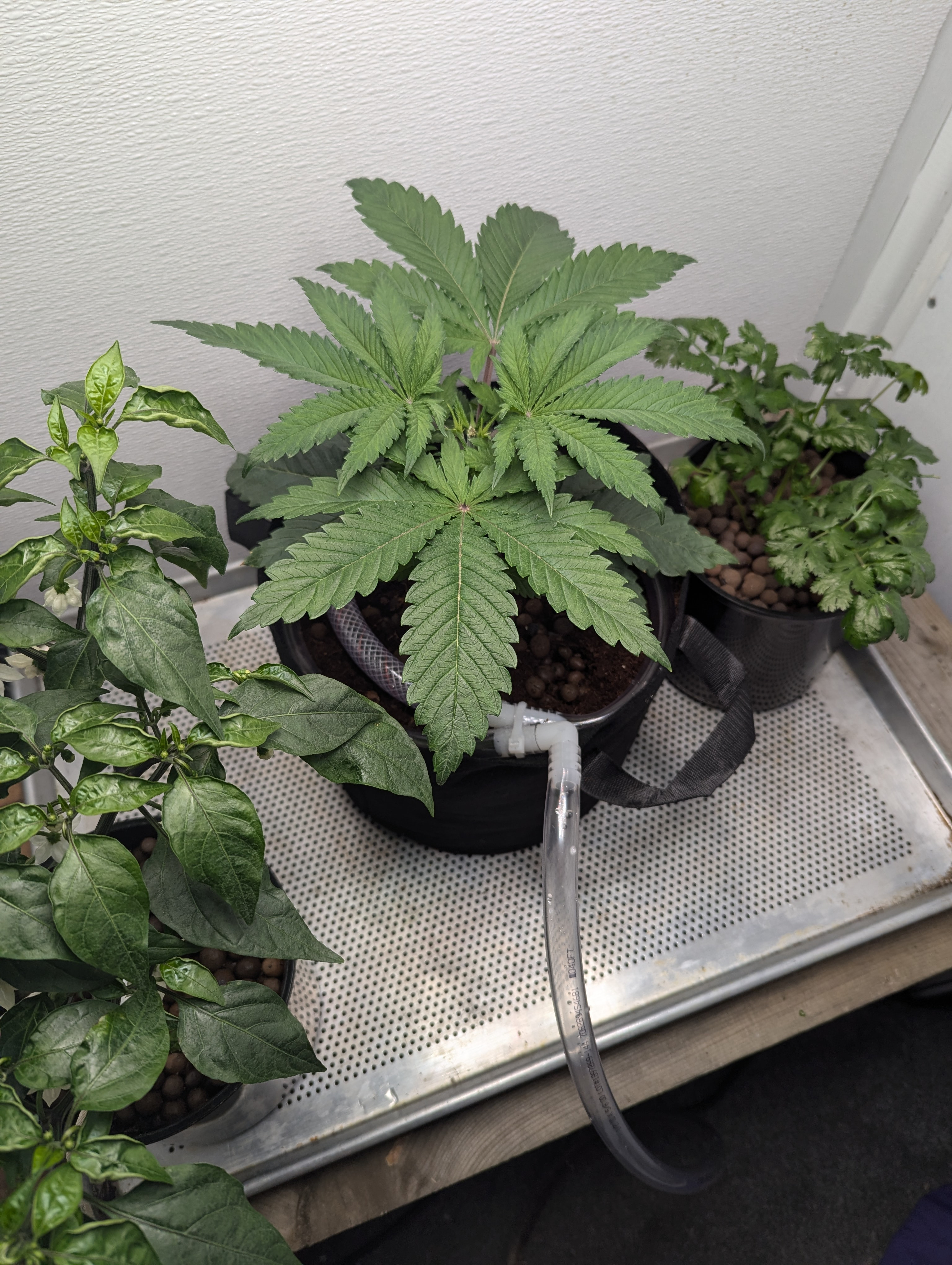 Just started training yesterday. Decided to just use binder clips and twist ties. Still learning. Going to cut those lower fan leaves at some point. I just harvested my first bunch of cilantro today! Making salsa with it. Also ~17 peppers growing and more budding.