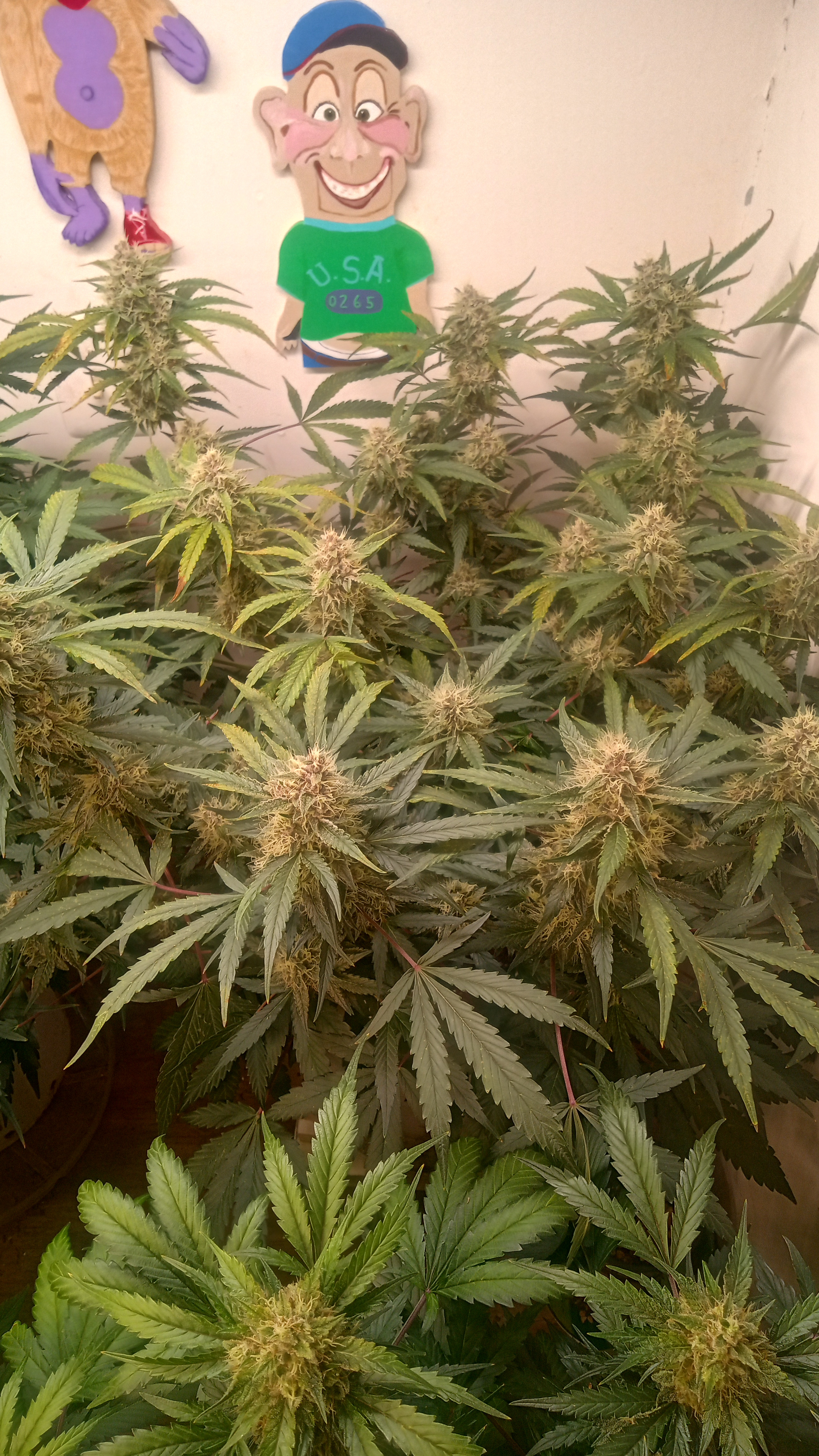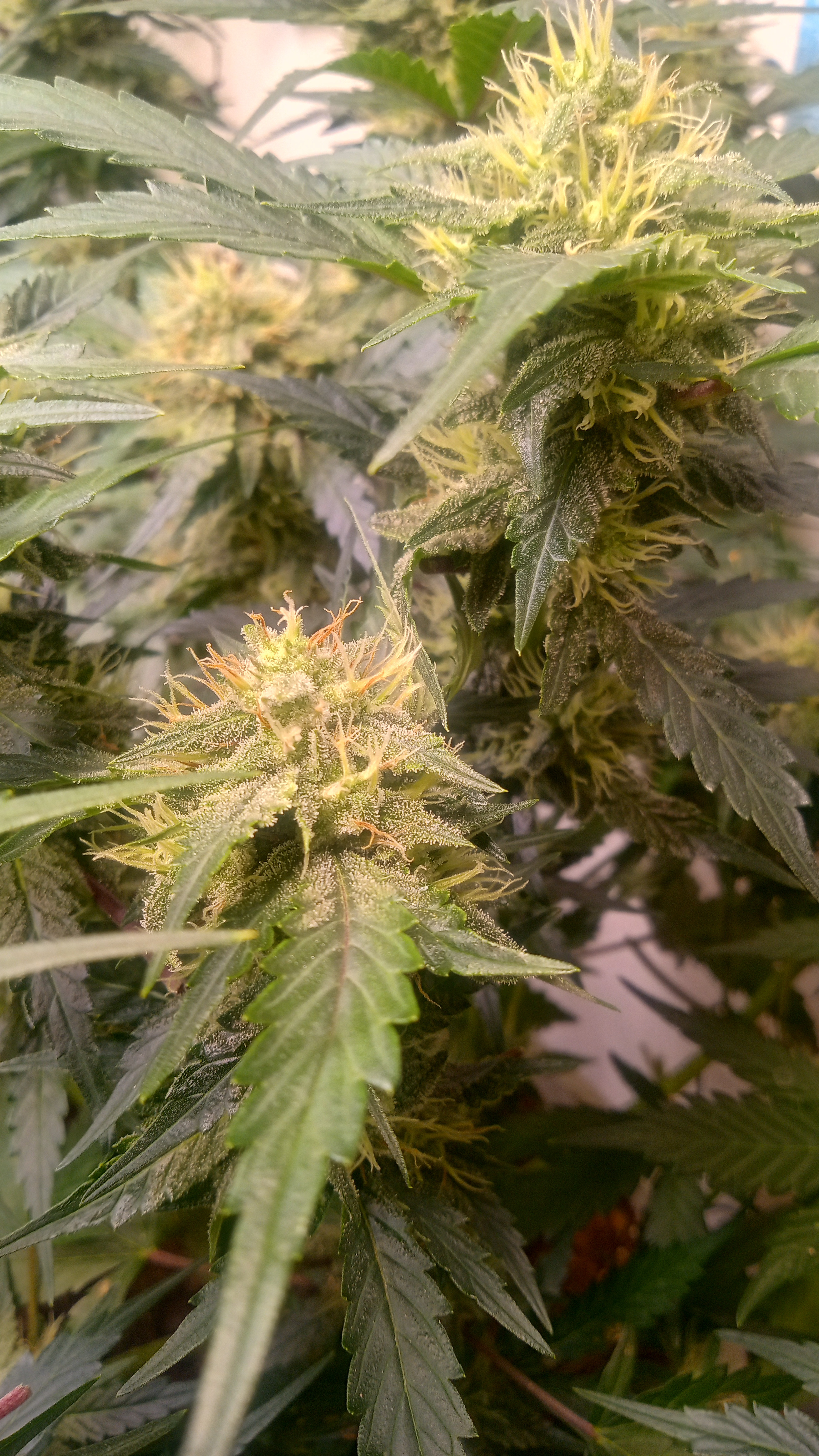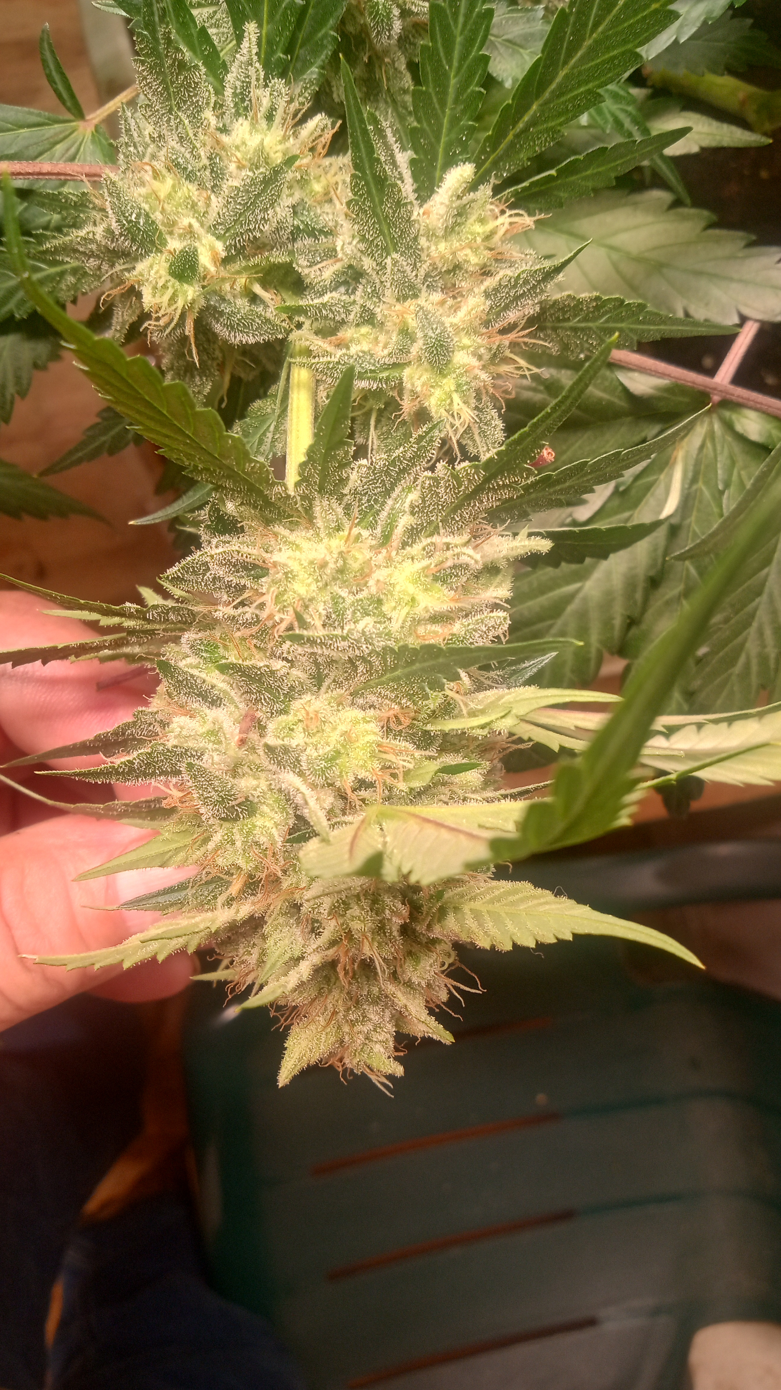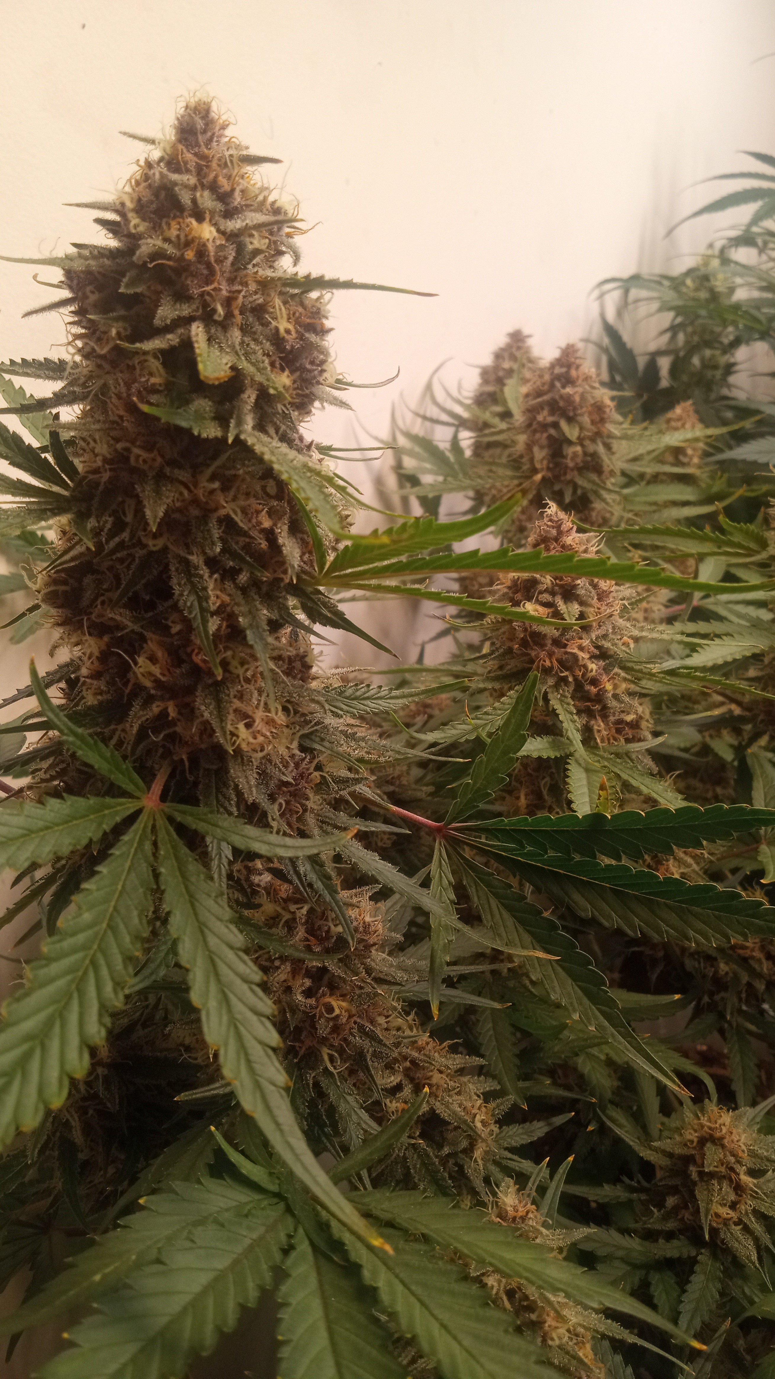 Black&blue and banana daddy will be coming down this week. Trying to push them to 70 days. They are getting water only. Razzpergers is the overachiever of the lot. Buds are getting huge. She's going to be heavy and have some amazing bag appeal. Her and Scarlet Grapes are showing mag deficiency but could also be that I've got both sp3000s at 100%. Gonna give them some Epsom salts and raise the back light a few inches. Been giving them flora nova bloom every other watering.keeping it green with the soil thing
