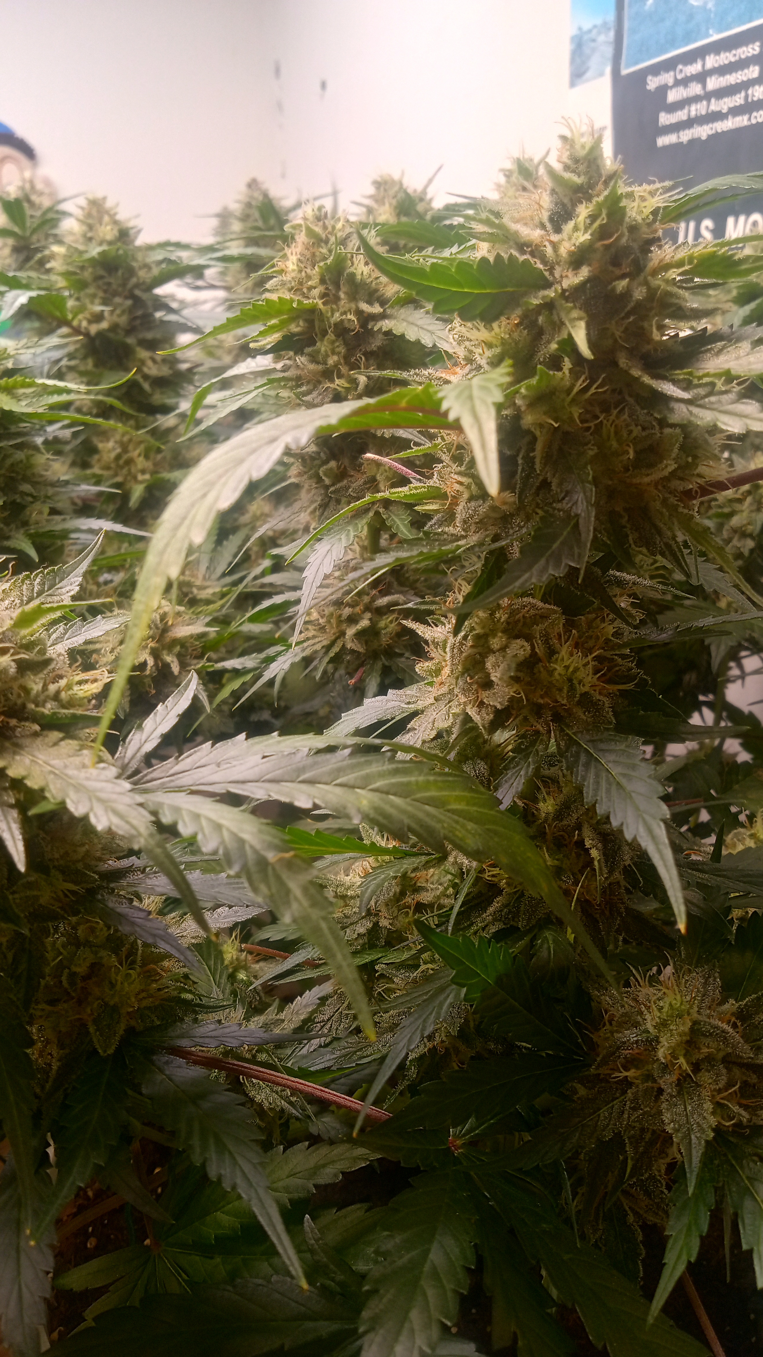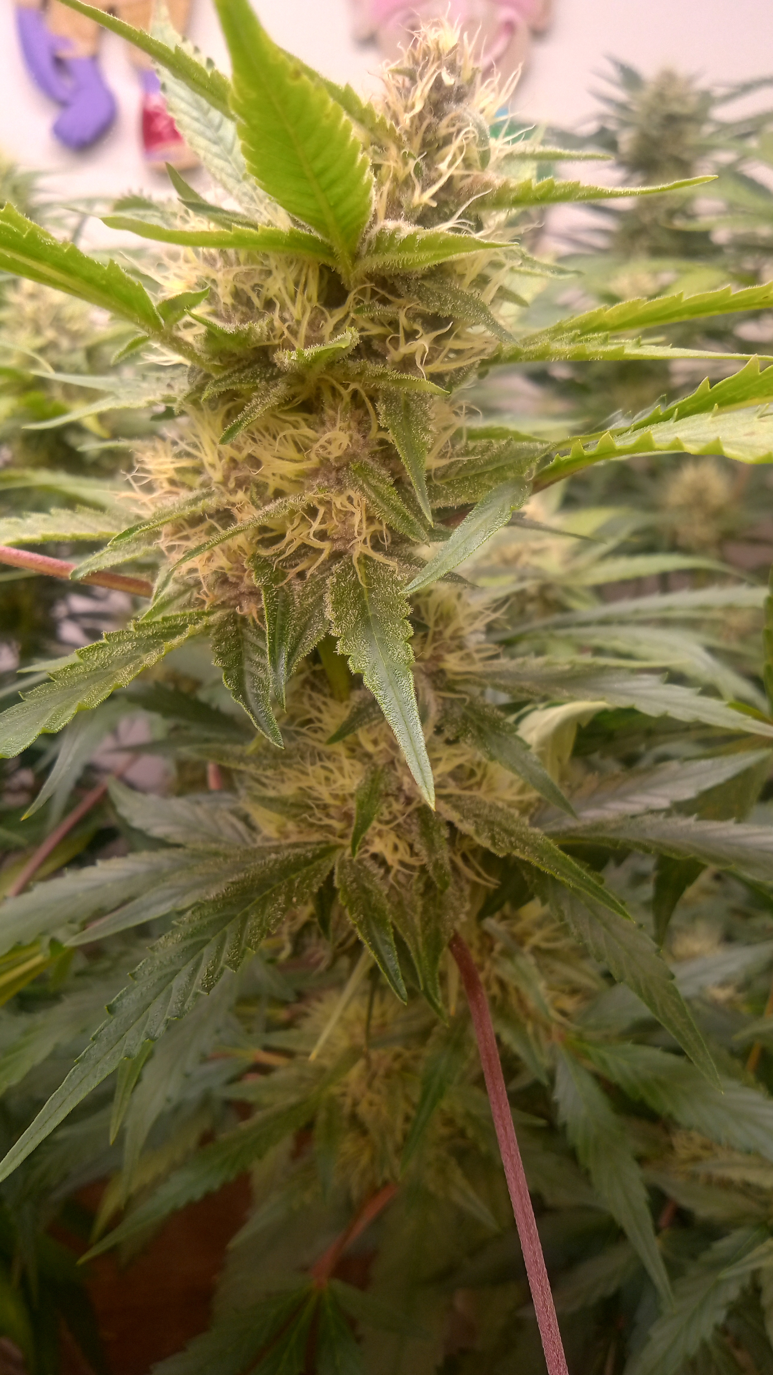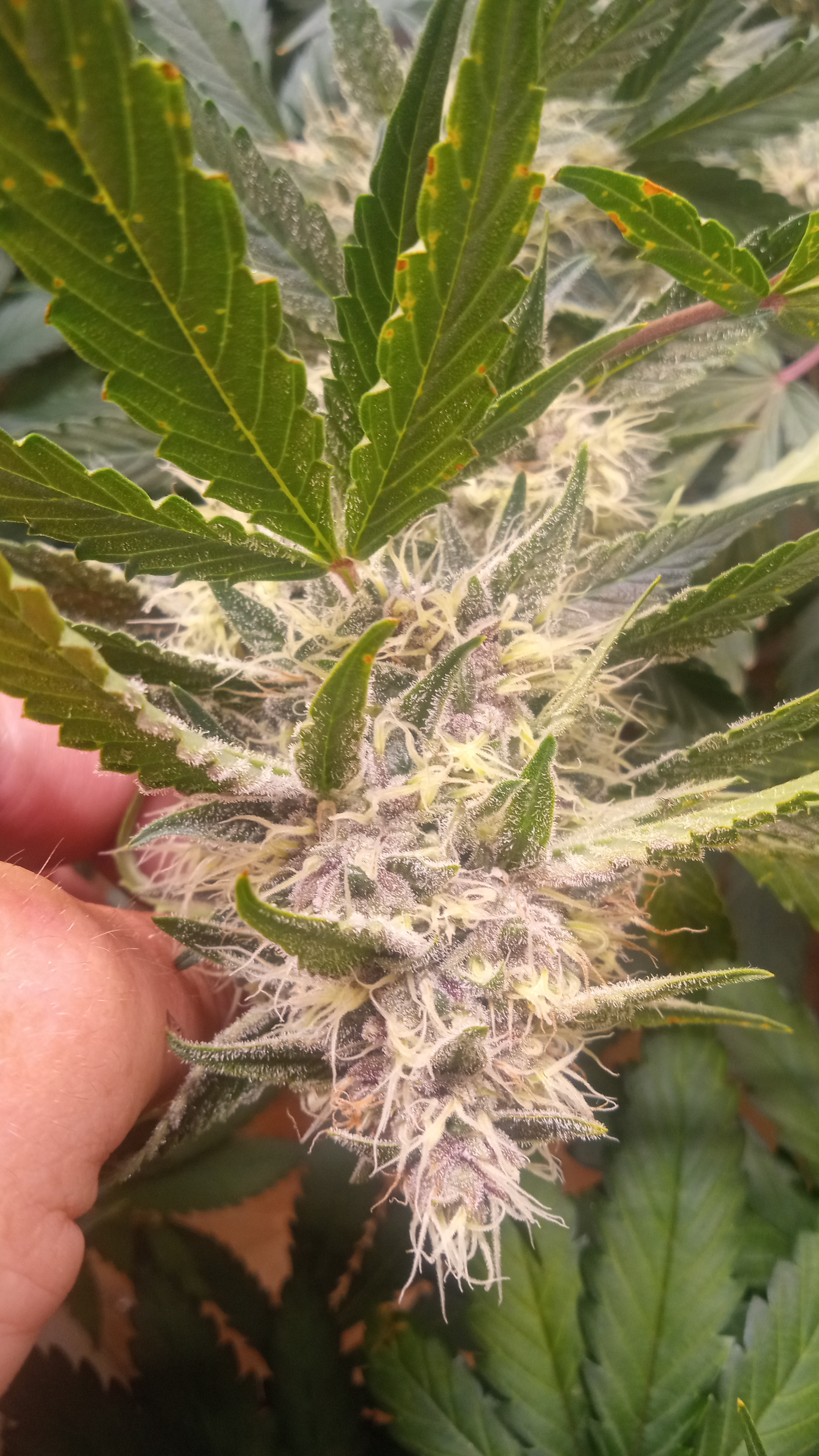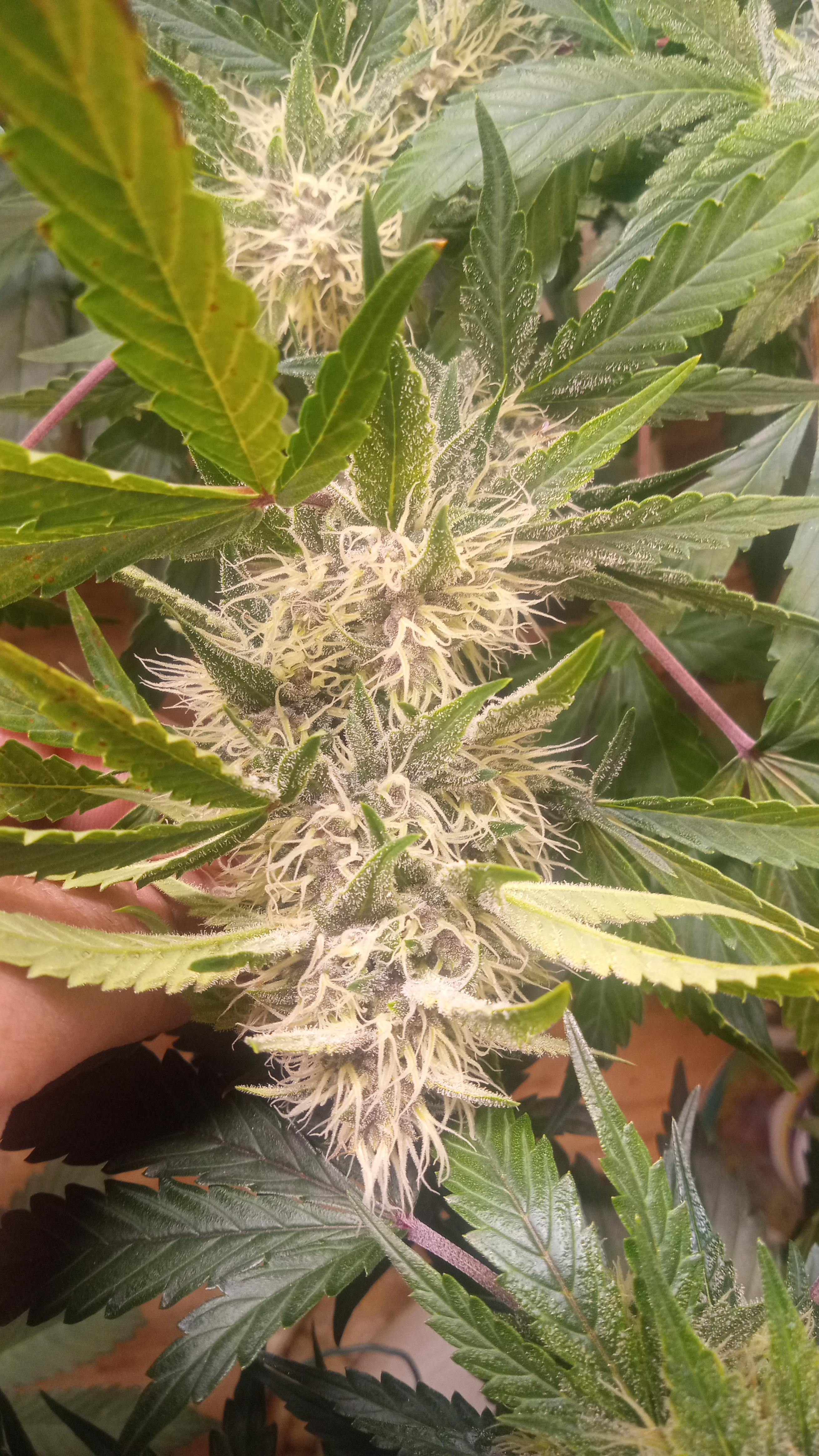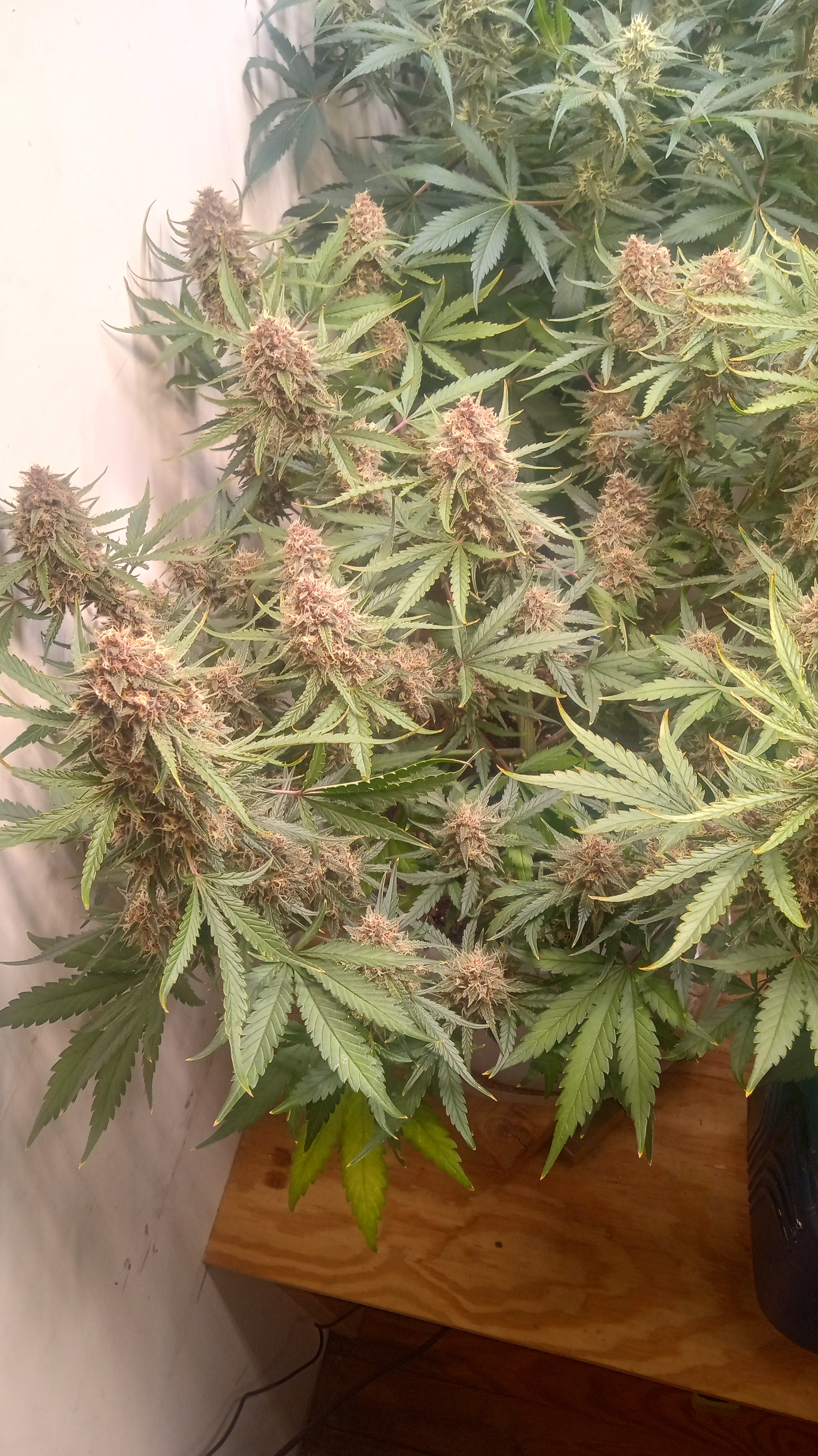 Black&blue and banana daddy will be coming down this week. Trying to push them to 70 days. They are getting water only. Razzpergers is the overachiever of the lot. Buds are getting huge. She's going to be heavy and have some amazing bag appeal. Her and Scarlet Grapes are showing mag deficiency but could also be that I've got both sp3000s at 100%. Gonna give them some Epsom salts and raise the back light a few inches. Been giving them flora nova bloom every other watering.keeping it green with the soil thing
