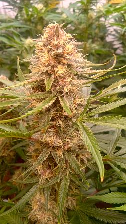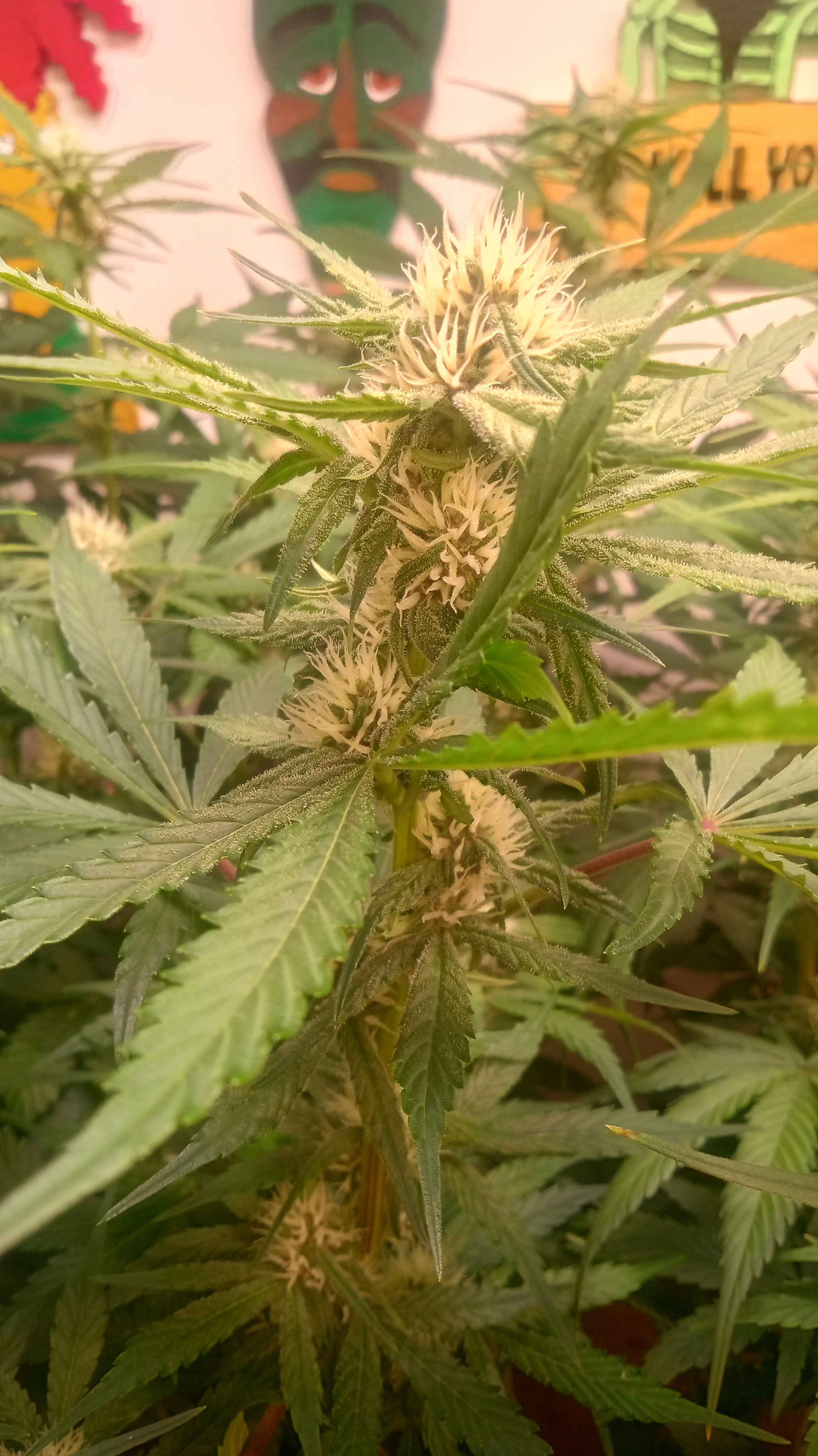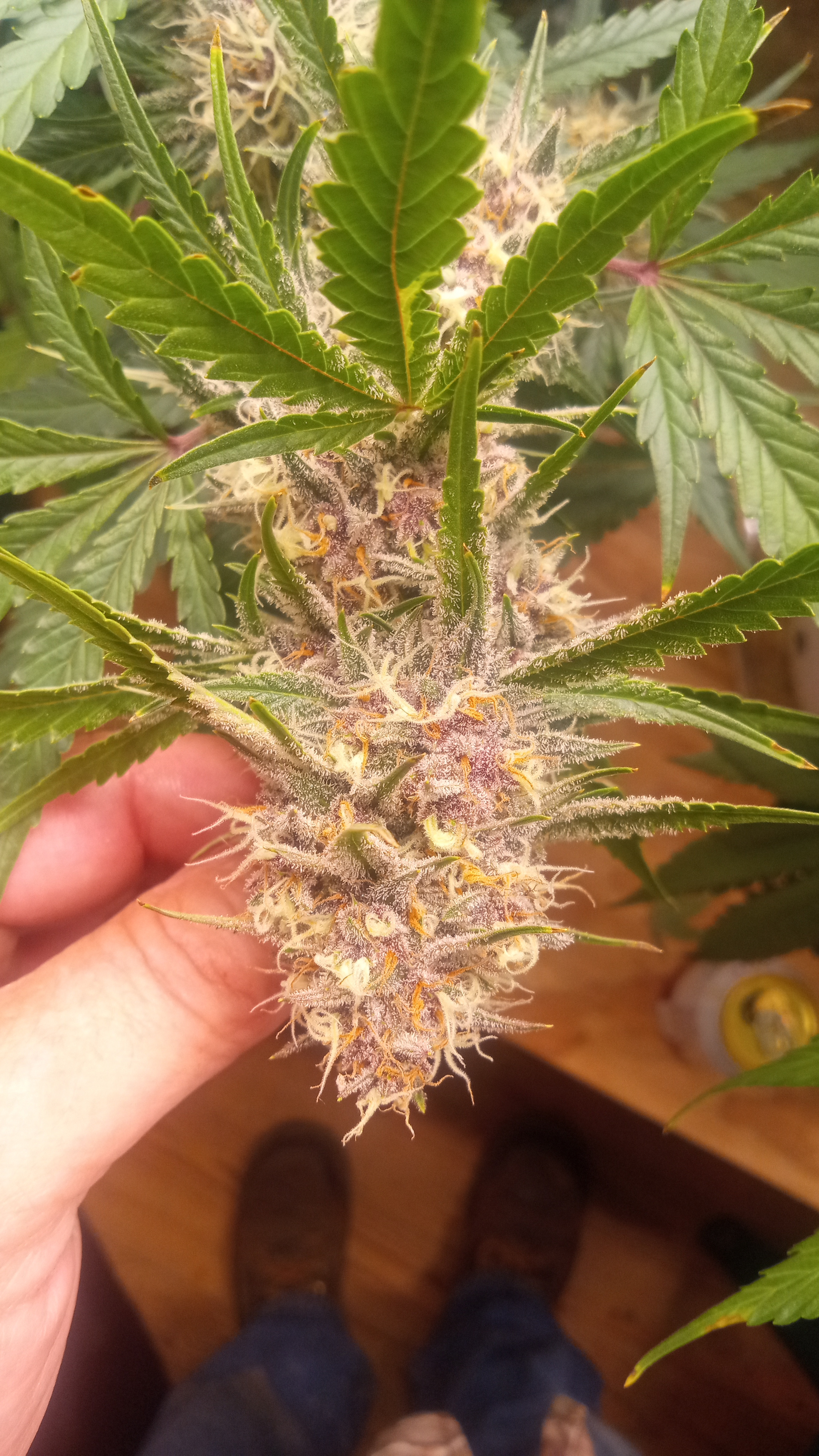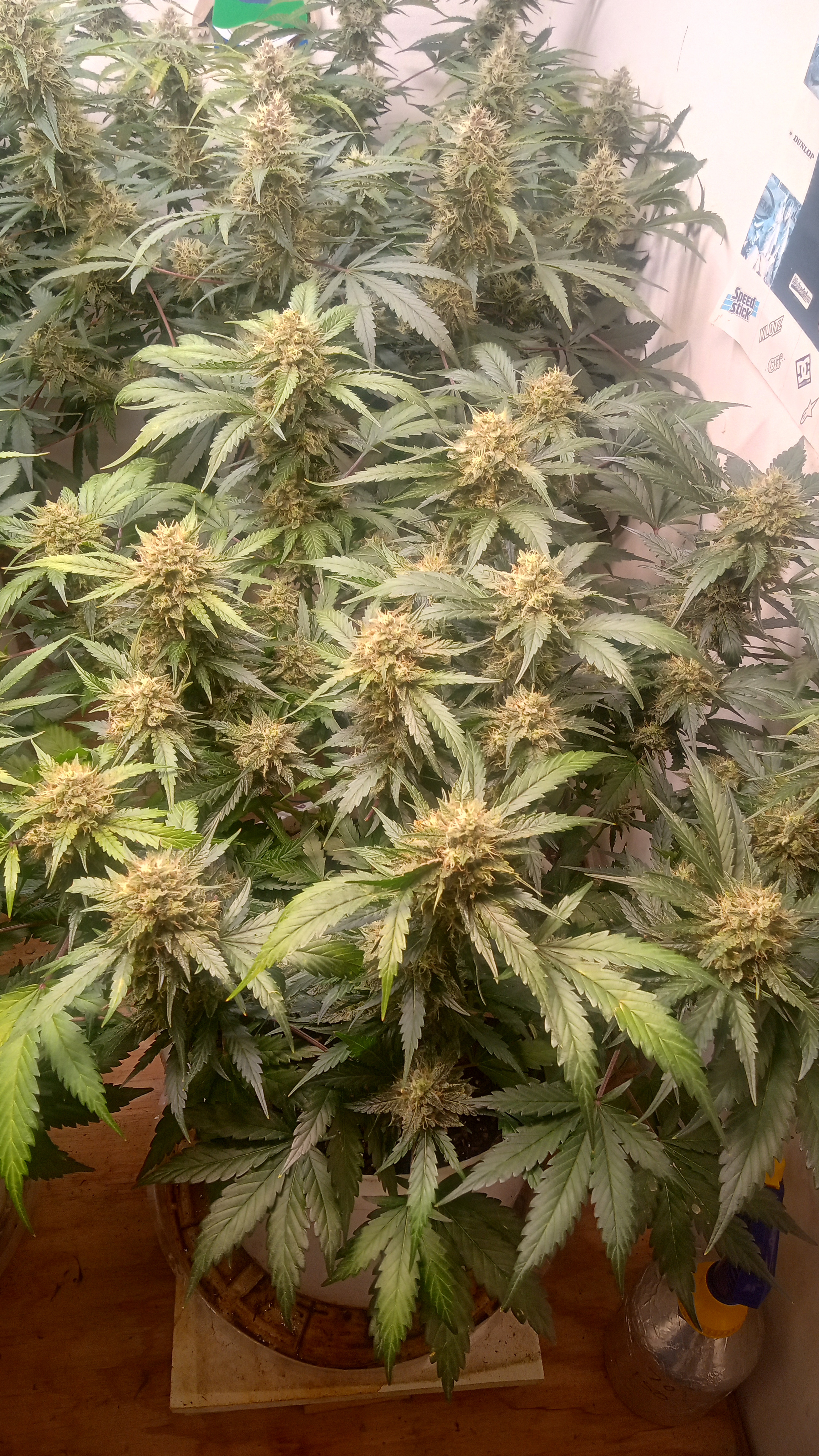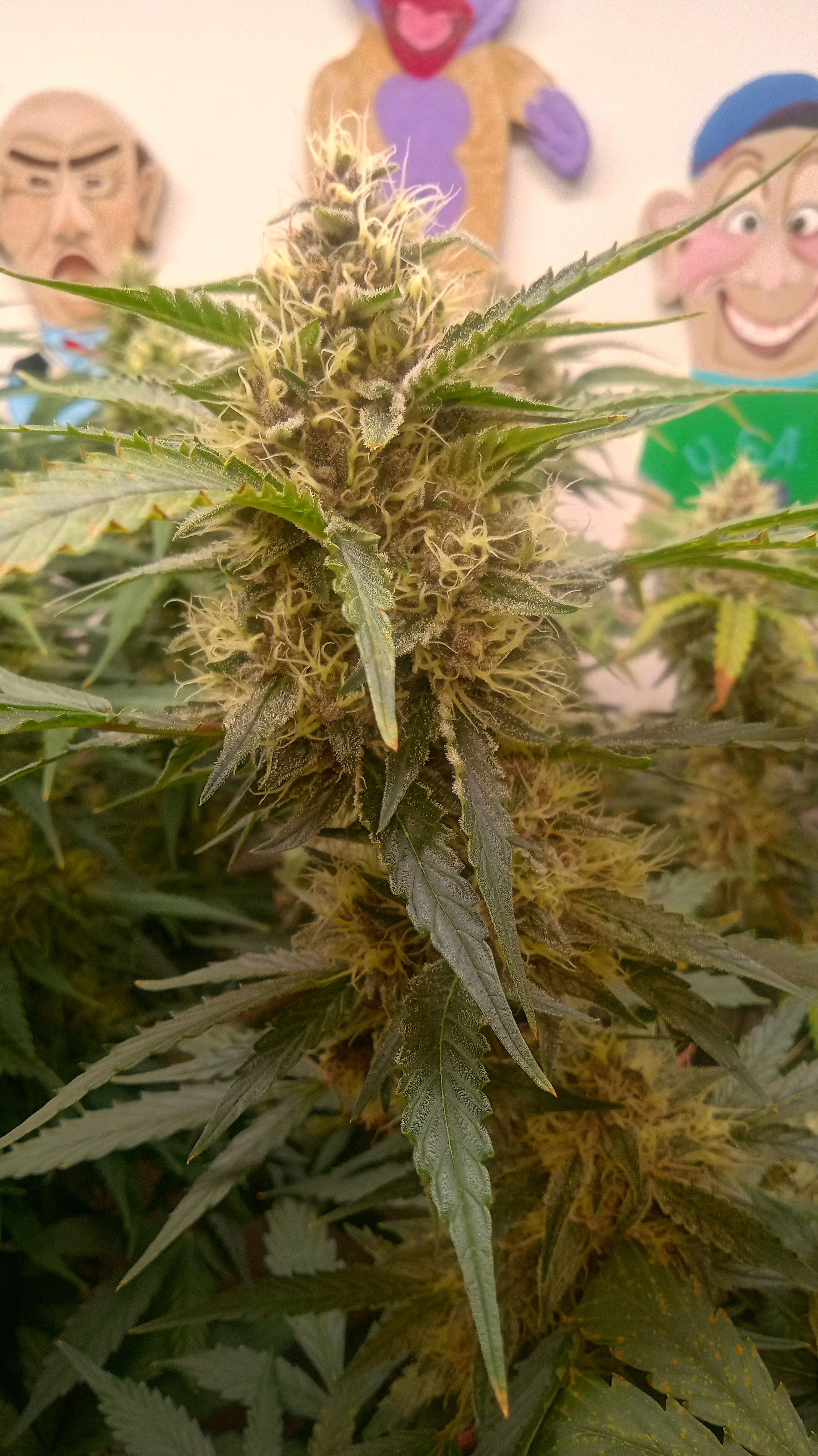 Black&blue and banana daddy will be coming down this week. Trying to push them to 70 days. They are getting water only. Razzpergers is the overachiever of the lot. Buds are getting huge. She's going to be heavy and have some amazing bag appeal. Her and Scarlet Grapes are showing mag deficiency but could also be that I've got both sp3000s at 100%. Gonna give them some Epsom salts and raise the back light a few inches. Been giving them flora nova bloom every other watering.keeping it green with the soil thing