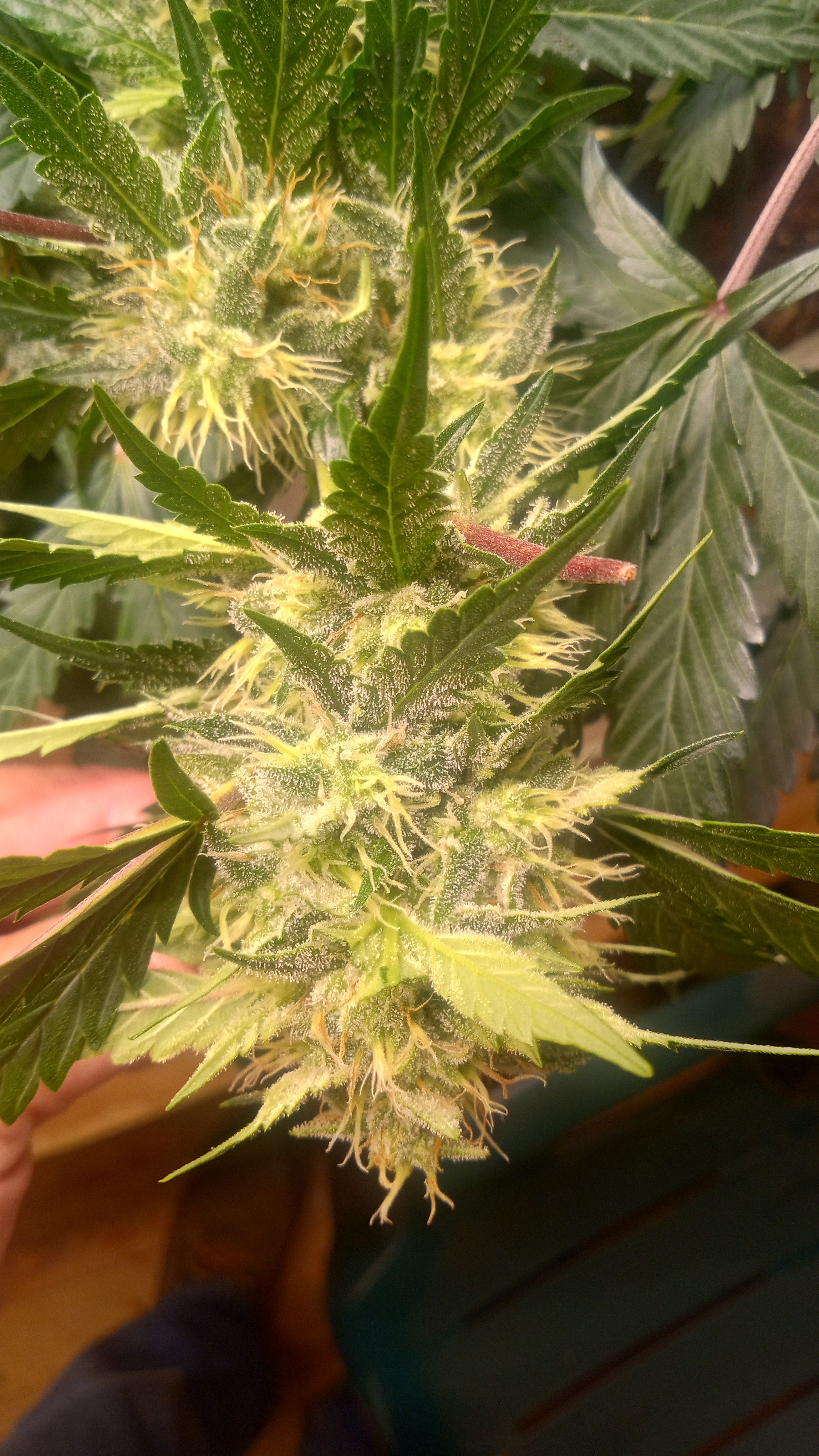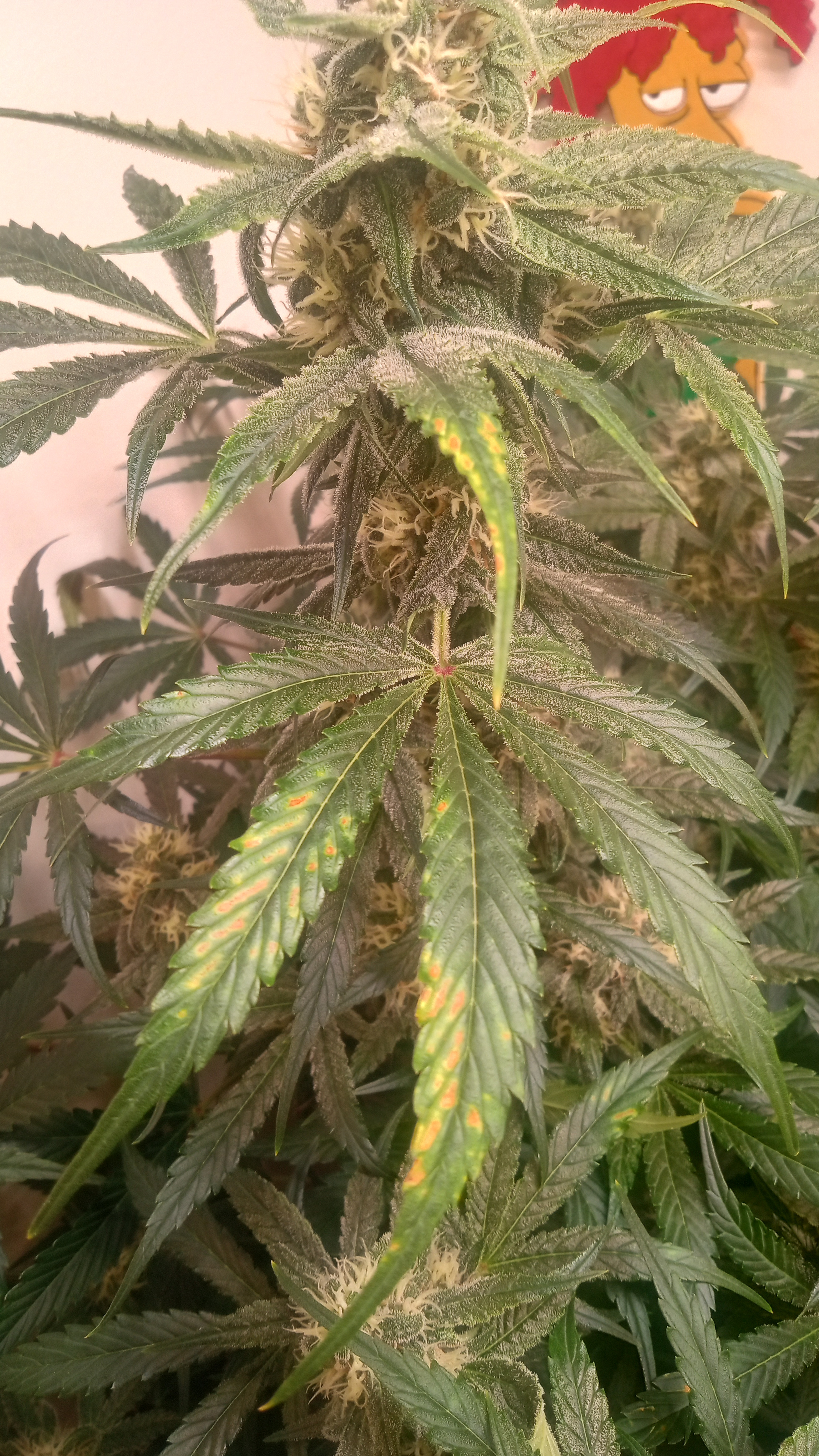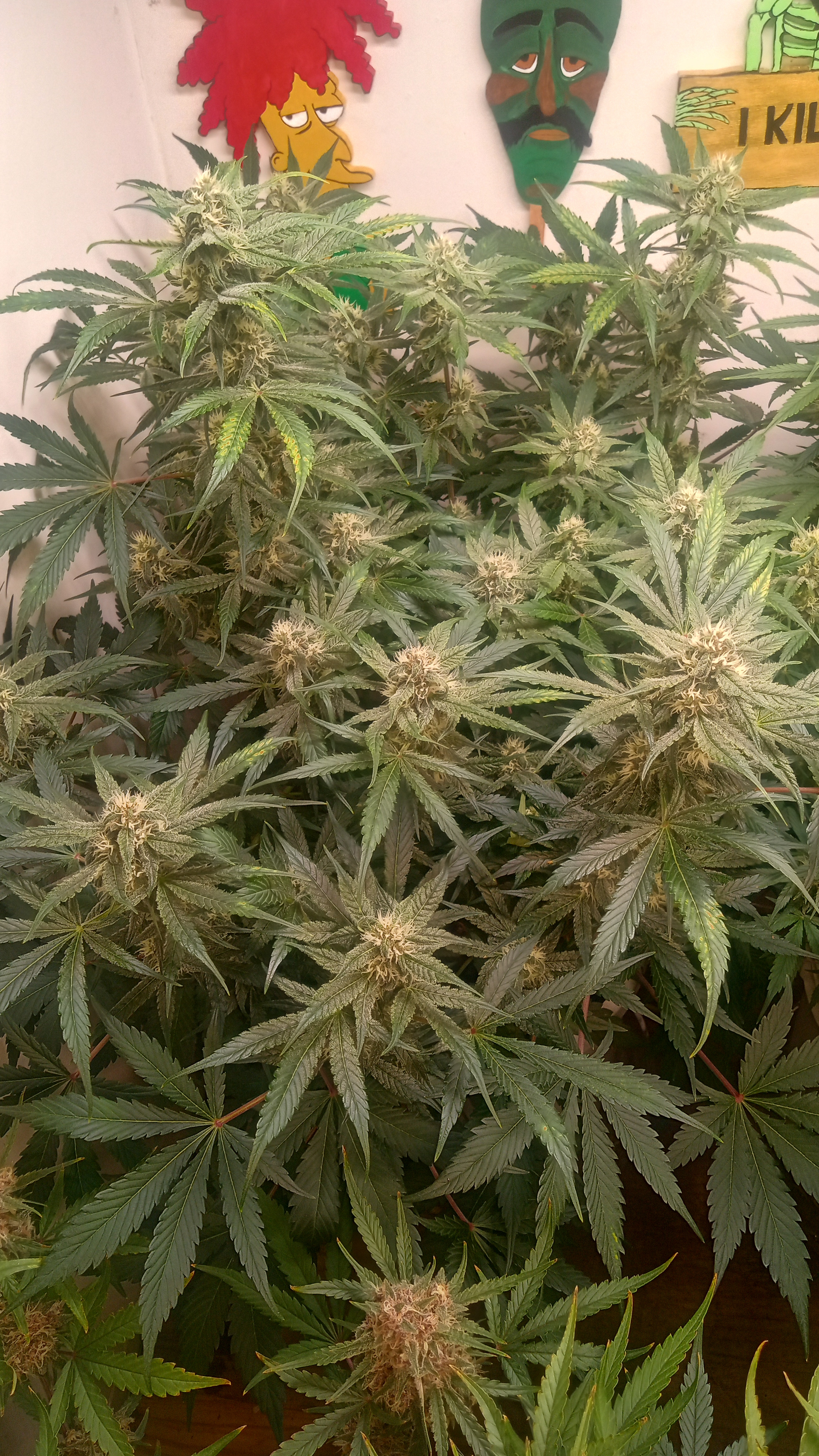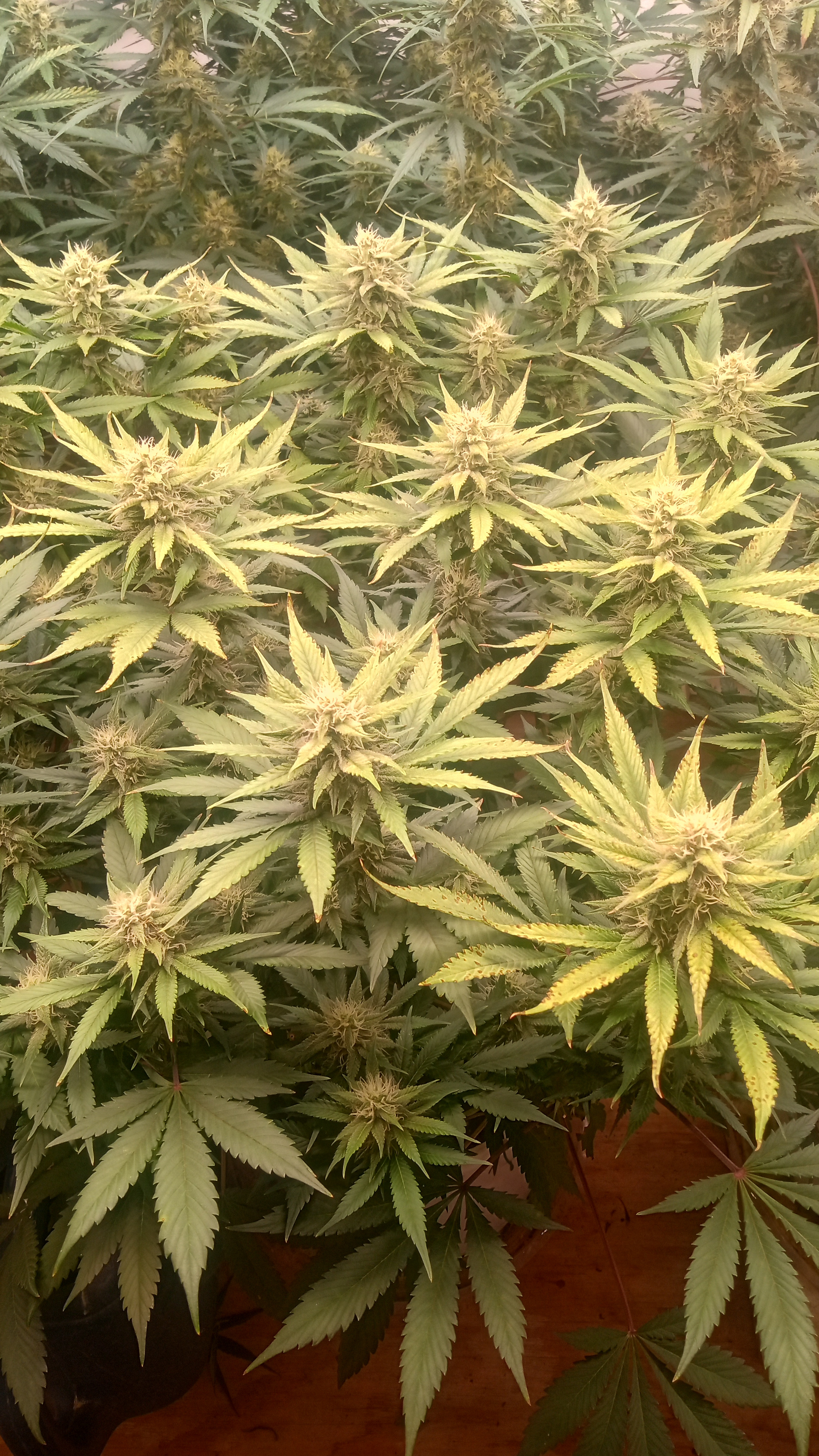 BLack &Blue got the chop today. Will do a post on her in a minute. Everyone else chugging along. Fixing the ph seemed to halt the spotting but Blue raspberry took it pretty bad. Scarlet Grapes has too much nitrogen and hot cakes and razzpergers just don't give a shit. I love growing multiple strains for this reason. Helps identify who likes and dislikes what.