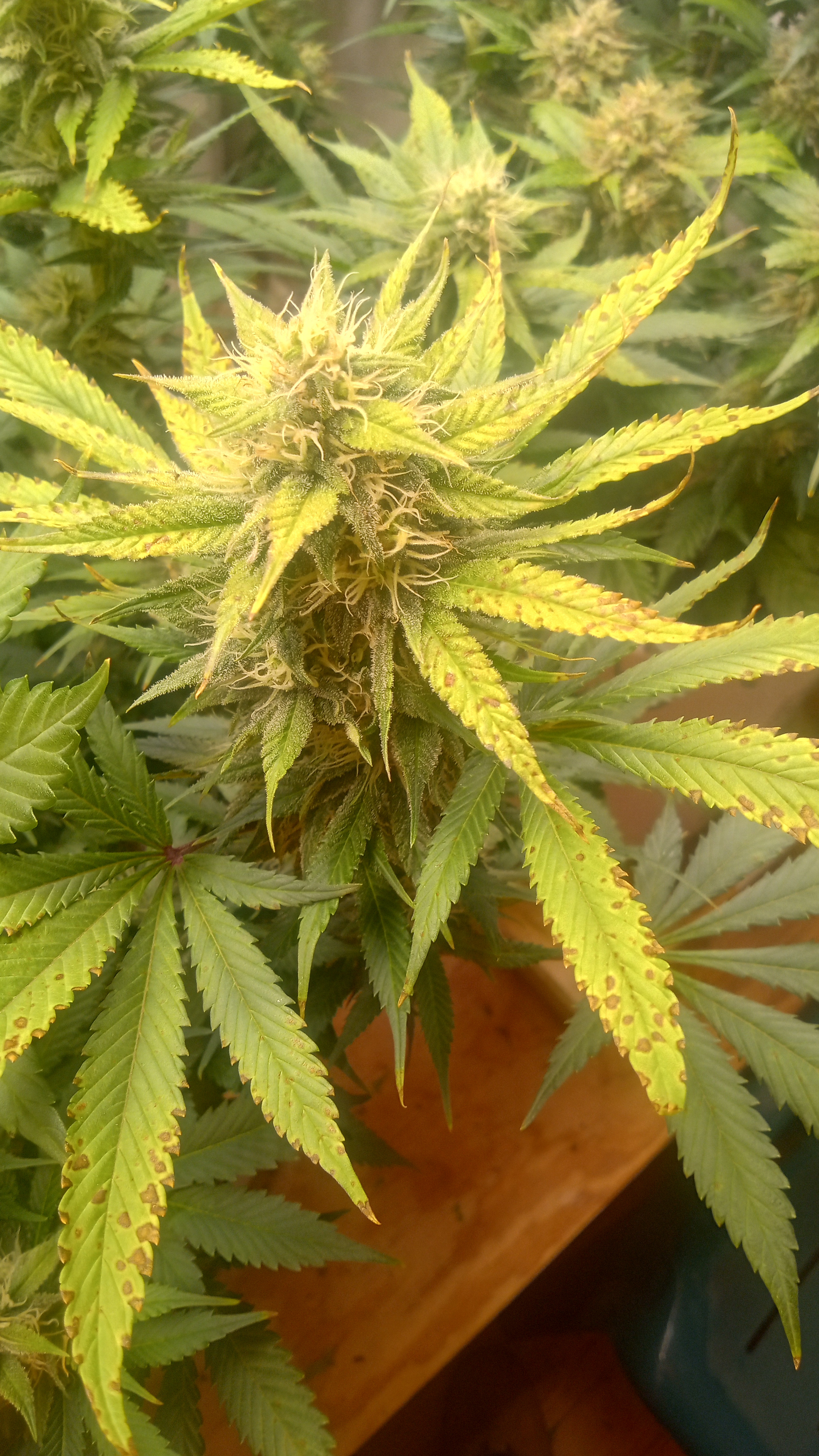 Here ya go broba fett. Scarlet Grapes, razzpergers and Blue raspberry. All at least two + weeks from harvest. Prime fattening time. Same thing on all 3. Don't wanna piss them off here.Just on the top leaves so the LED's have a play in this game. 5 gallons of soil can correct for only so long. The other 3 don't seem the be affected. Hot cakes is like whatever water me. lockout due to pH me thinks. Open to thoughts.