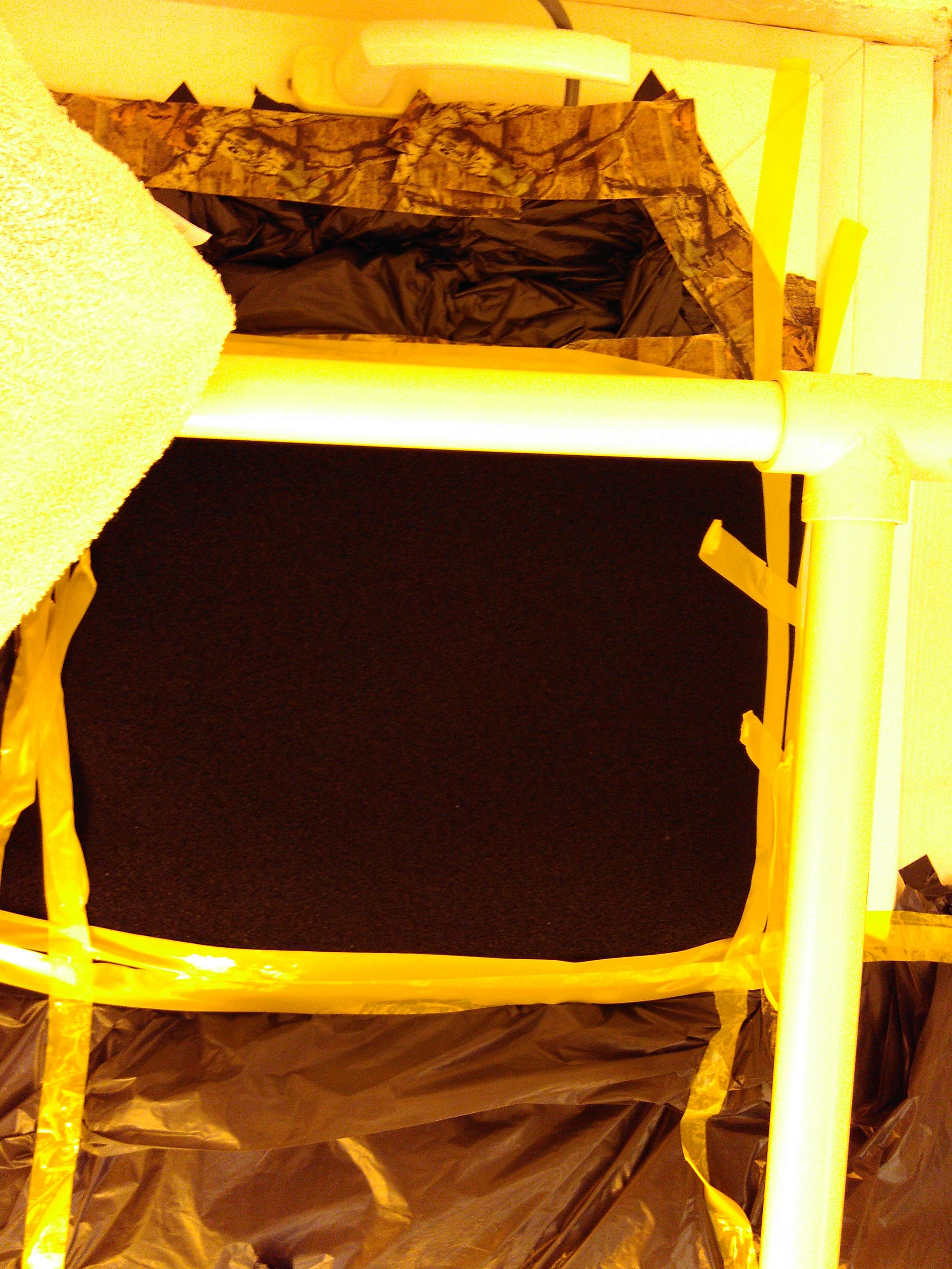 Up until now i've been okay with slightly covering it using a towel to control whatever minimal light leak might come in from outside. The blue lines cutting across the exhaust fan in the picture represent this towel. I've set it up so that it's about 2 inches in front of the exhaust fan. This is so that the exhaust fan can keep working, and so that it isn't blocked. There is a 2 inch distance between the fan and the towel.