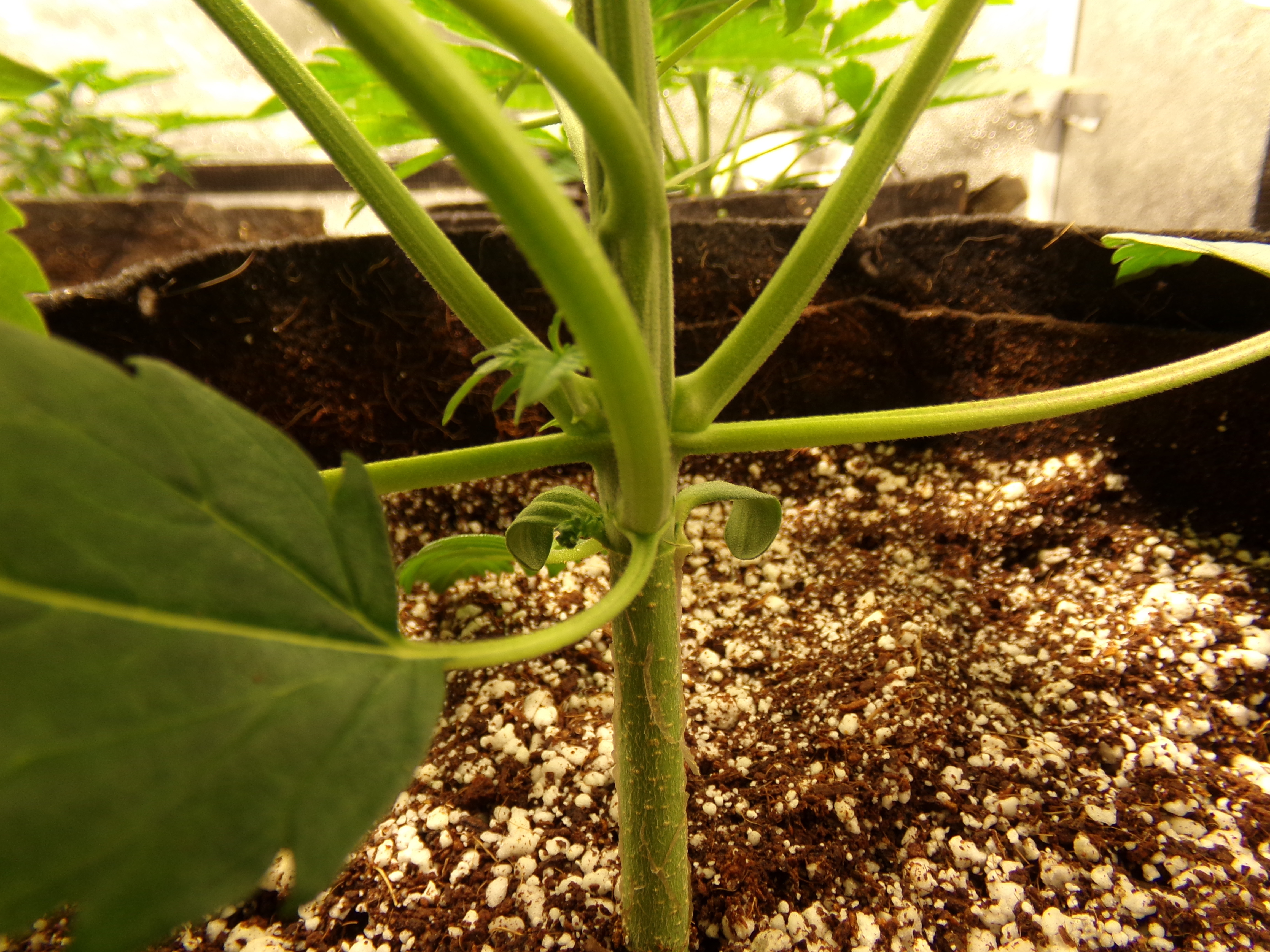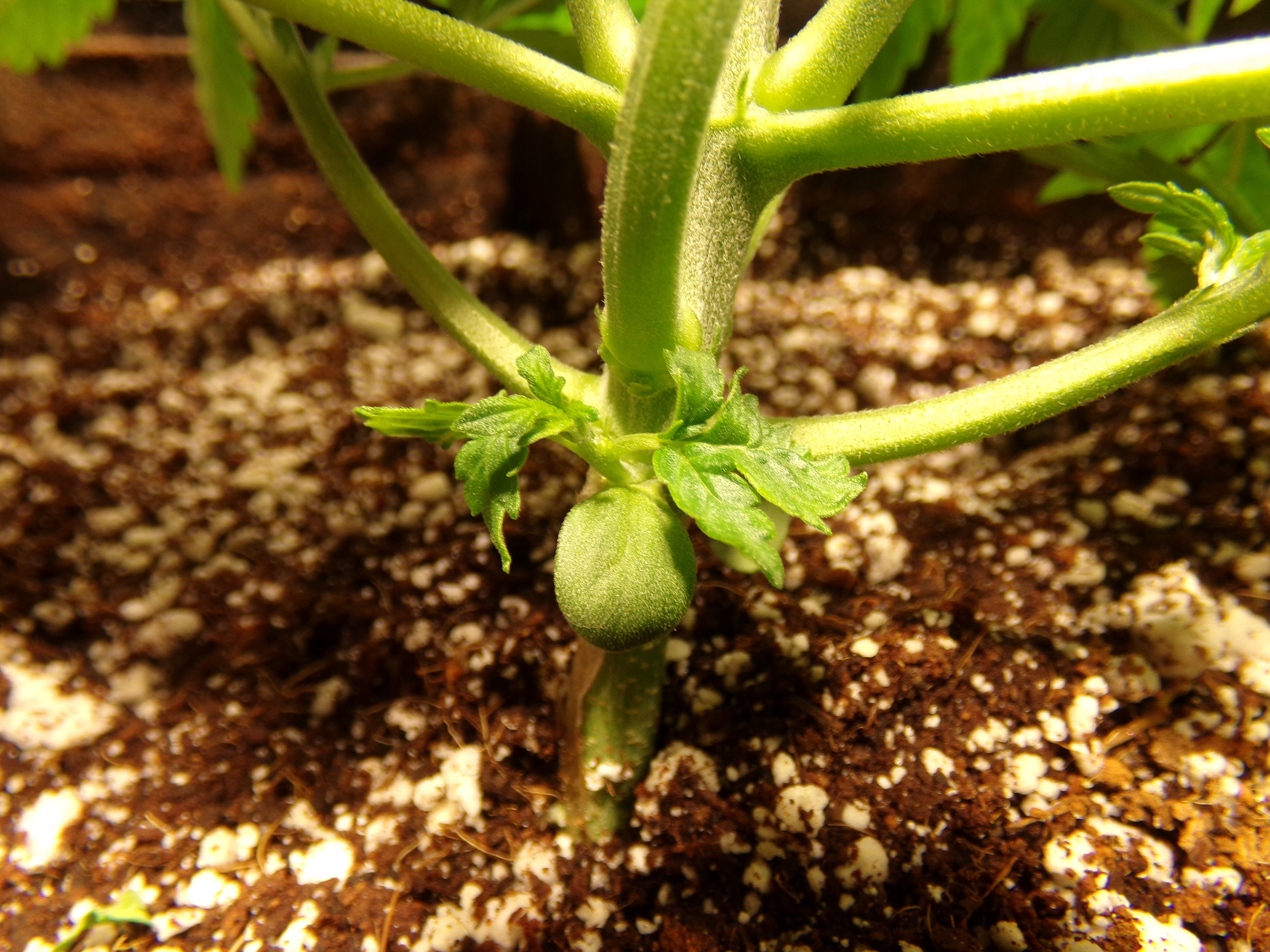 Up close, what looks like a flower node is coming from the cotyledon intersection: Fan leaf zero.