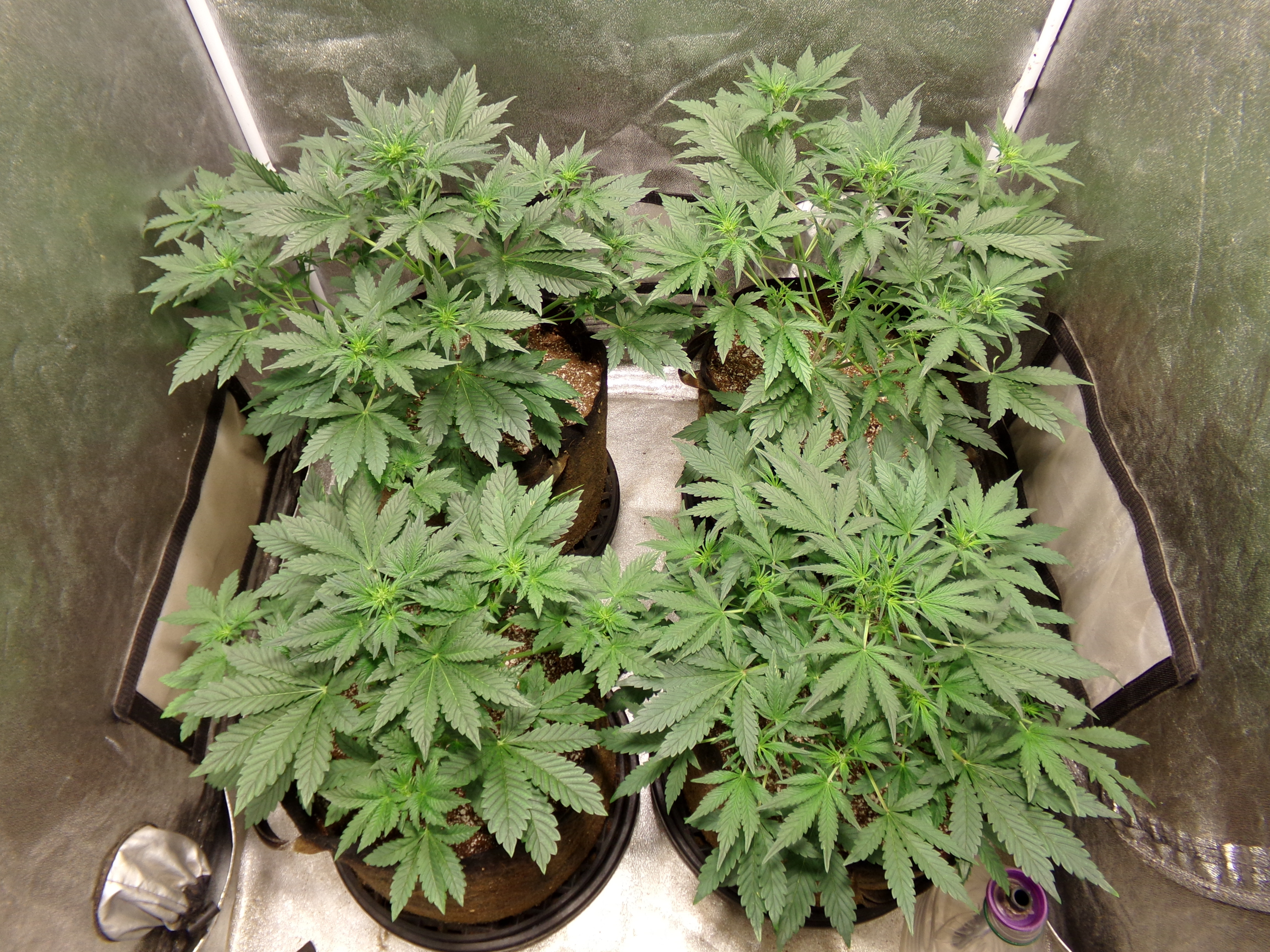 Looking good. They haven't started stretch yet but the buds will be THICK. Here's a pic of mine at 32 days next to black&blue same age. B&B is definitely pushing more sativa.
