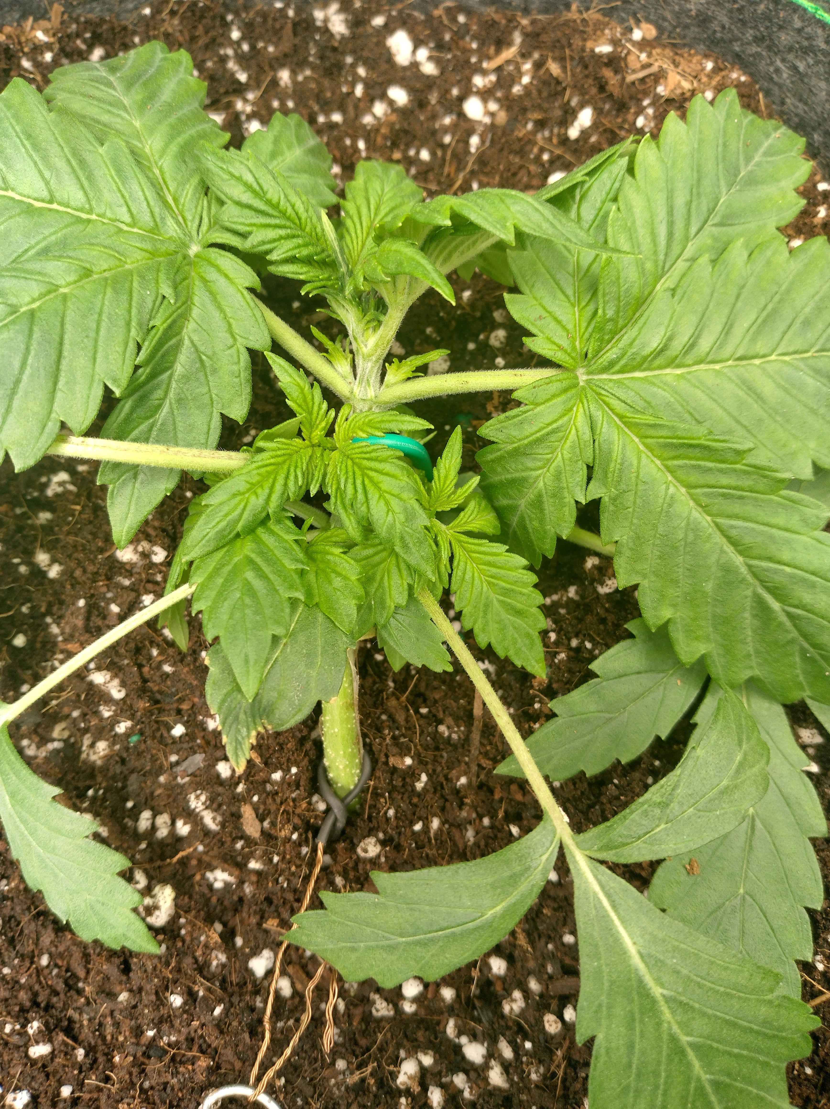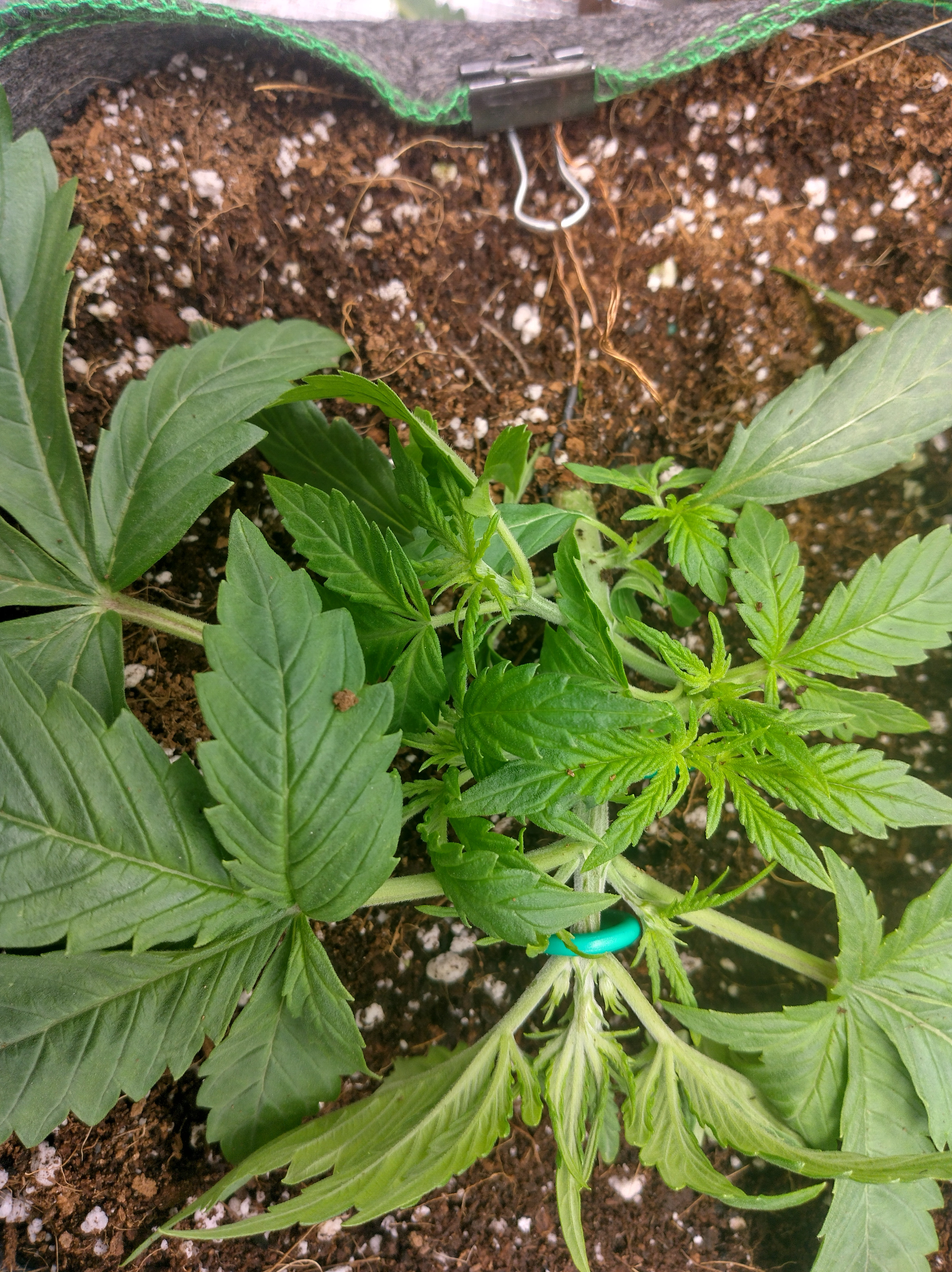 Scarlet Runts has started to show new growth and the fan leaf tuck time is here. 22 day since pop. took the hold down off. there isn't much space in between nodes.