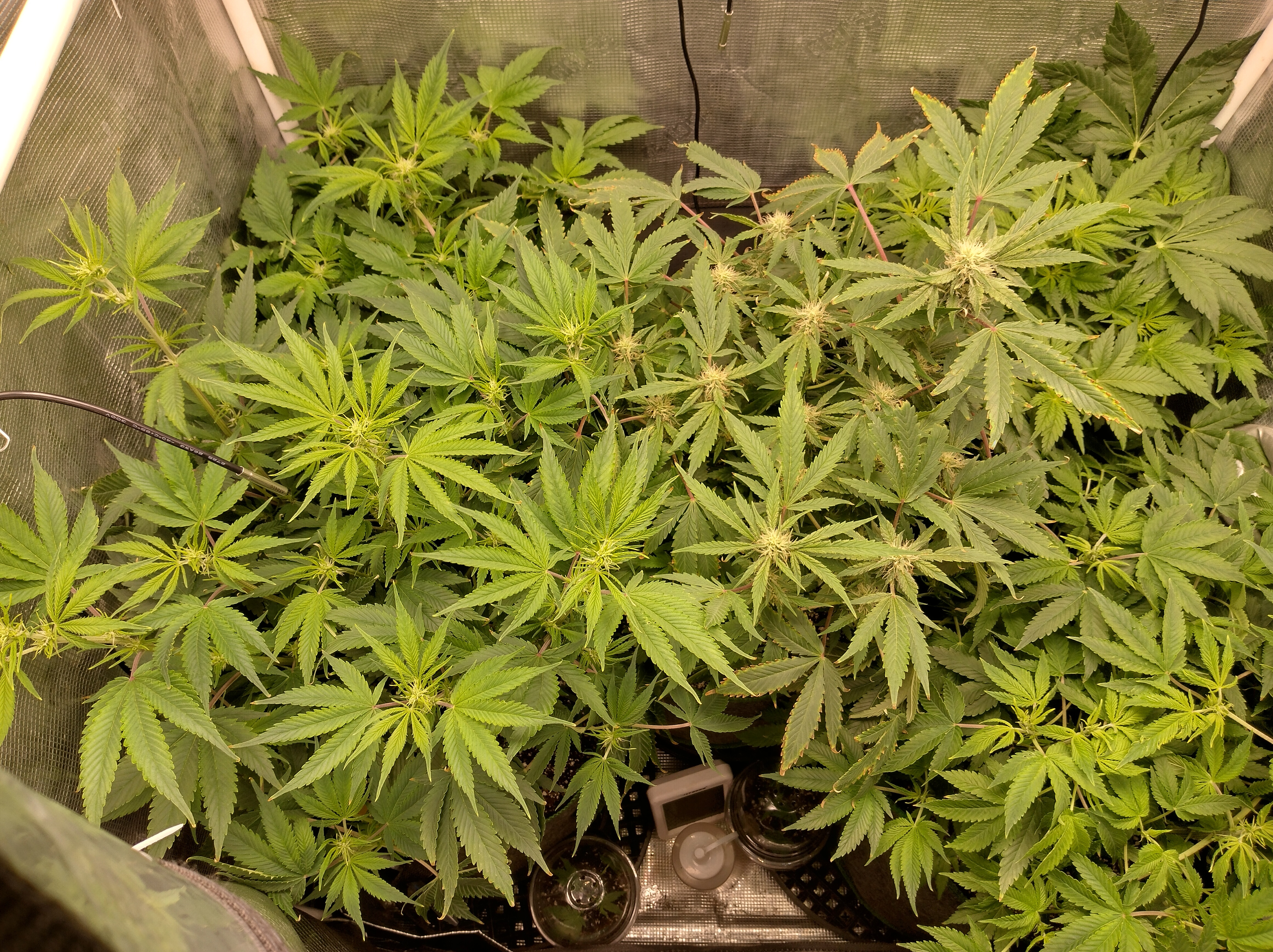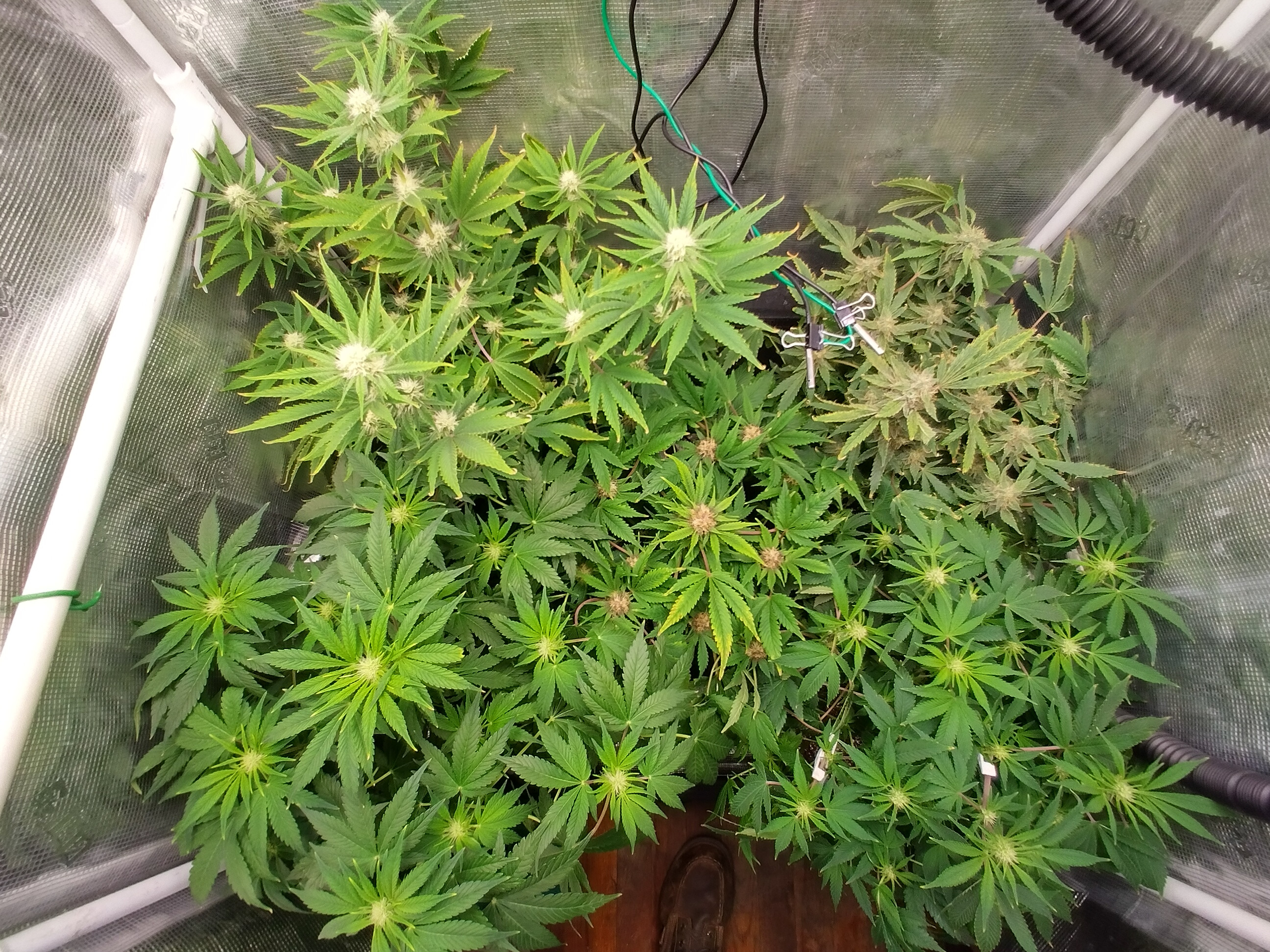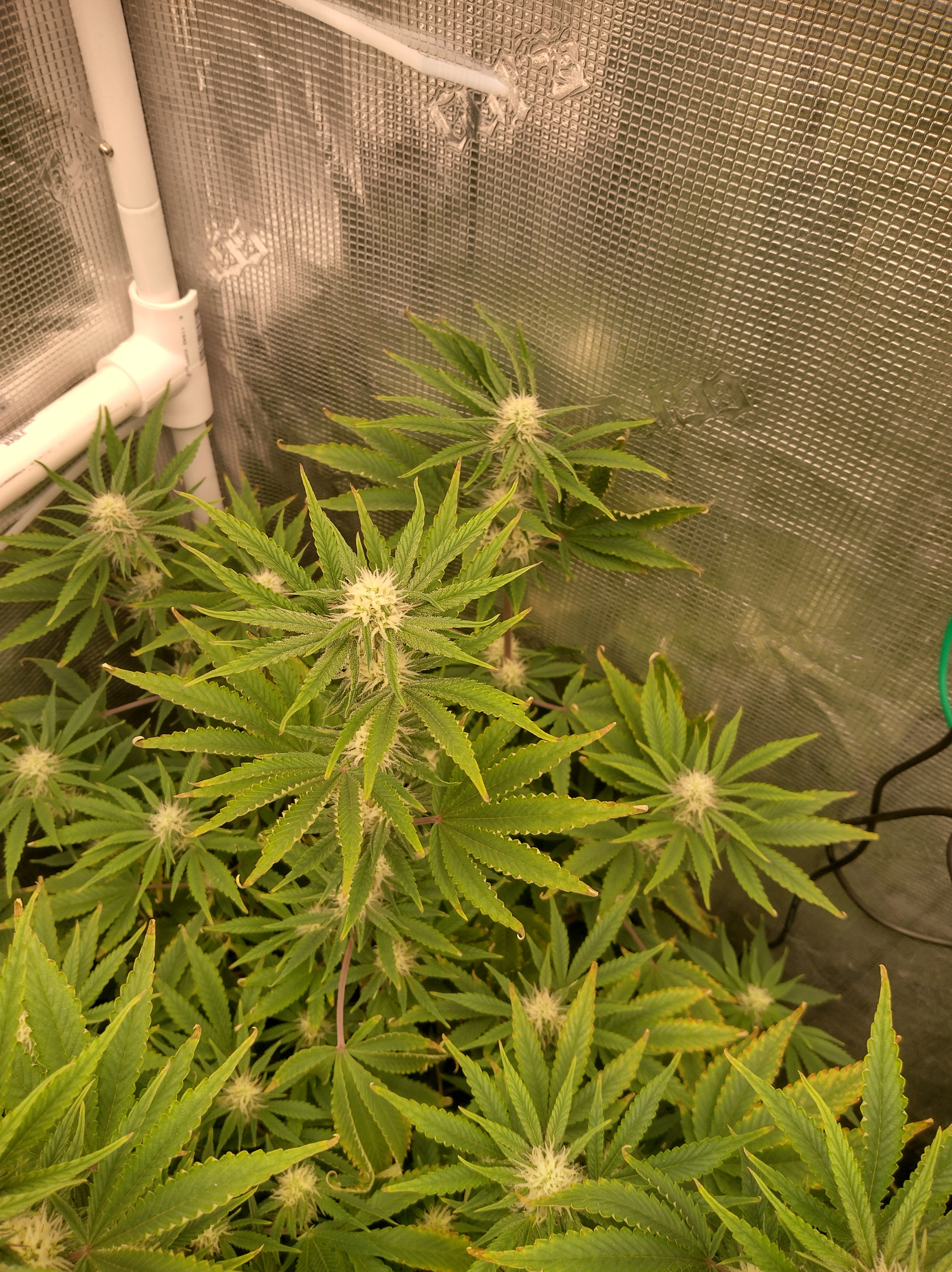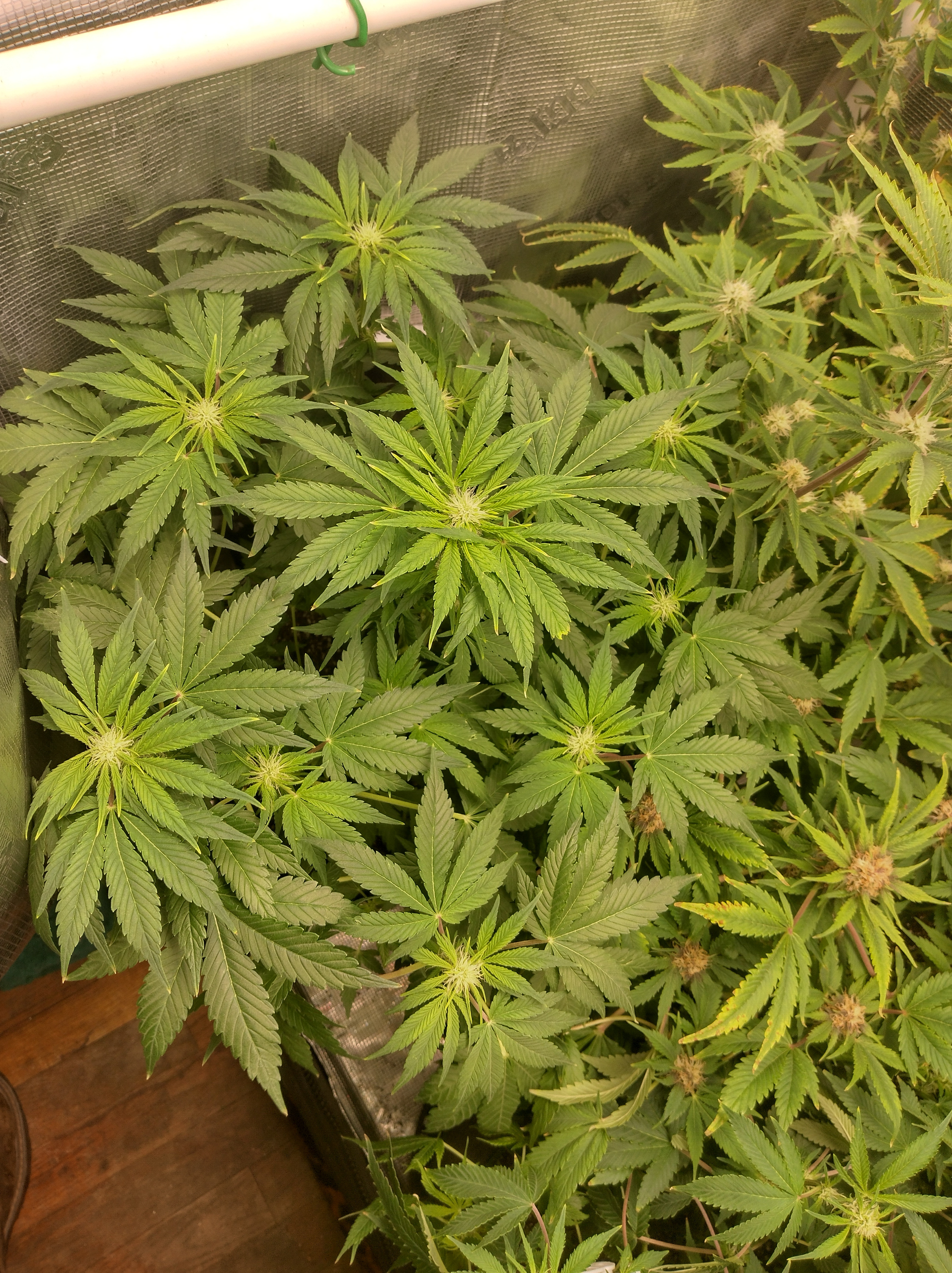 Got flowers on all 5 now. Pics in order are Going2fast Scarlet Sun S1 PIC 1 and 2 are about 1 week apart. Scarlet Runts PIC 3 and 4 are (OZ S1) Orange Barb and Zikittles S1Franklin Pic 6 is a crowded tent for sure. It smells like a Avon perfume counter in my bedroom from time to time.