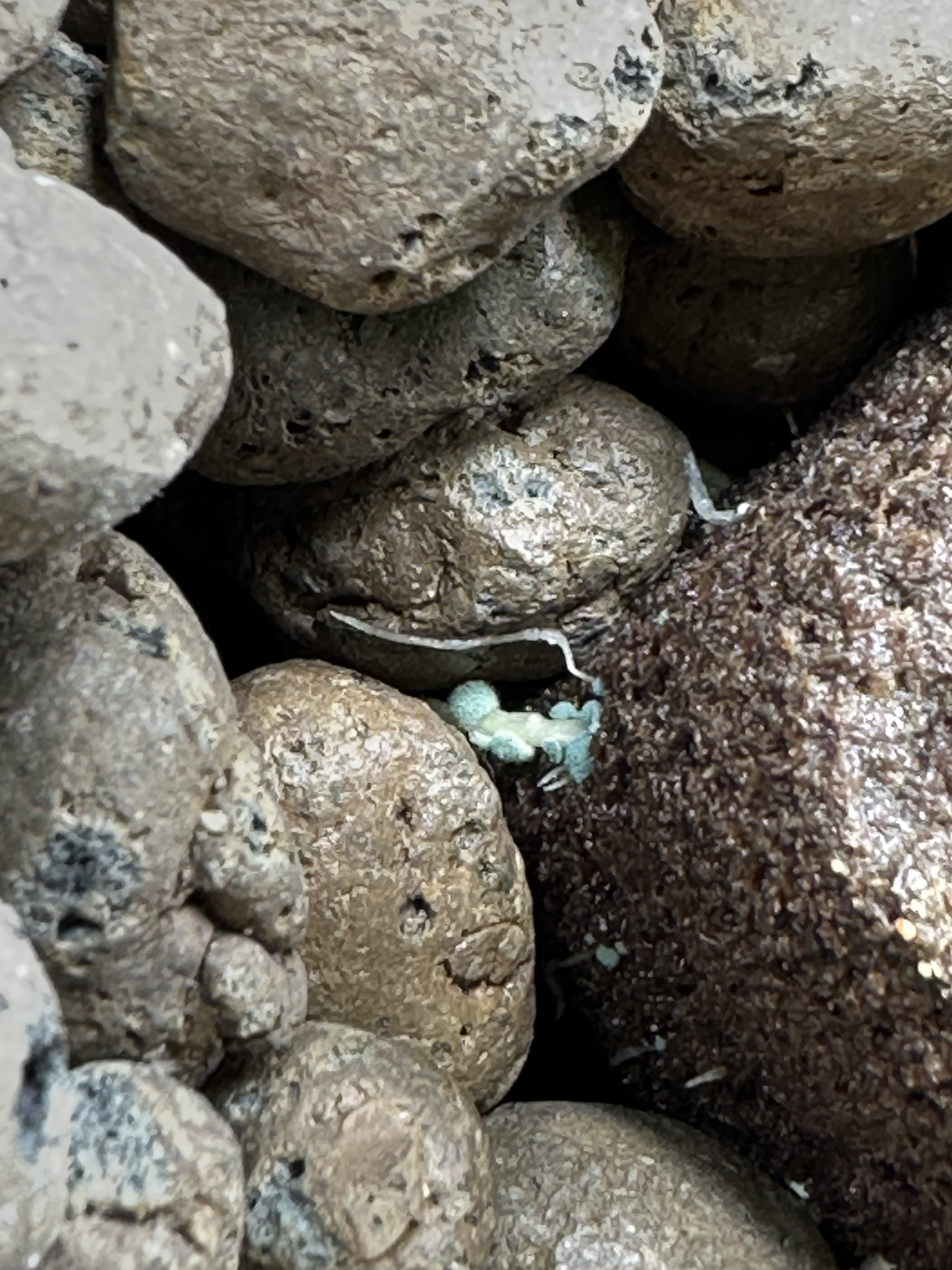 Long story short. Saw some “green stuff” on root cubes. Decided to pour some undiluted 17.5 peroxide on them. Bad idea. Destroyed roots, extreme leaf burn and yellowing. Waited hoping they would bounce back since the roots in rdwc water seemed healthy and intact. After a week or two I decided to check the roots near the base of the plant. Pulled back some clay pebbles, saw green and white spots on root cubes and roots.