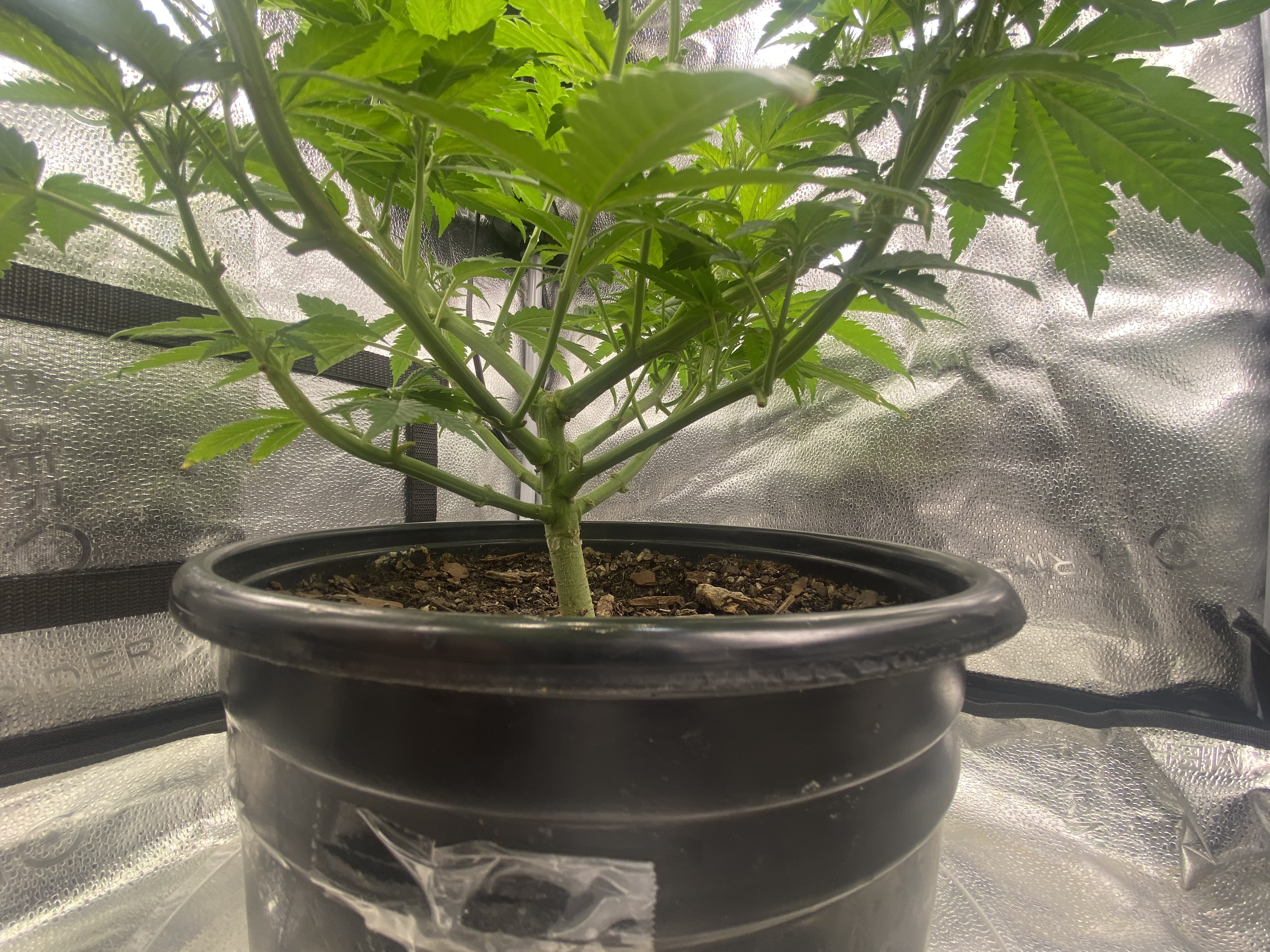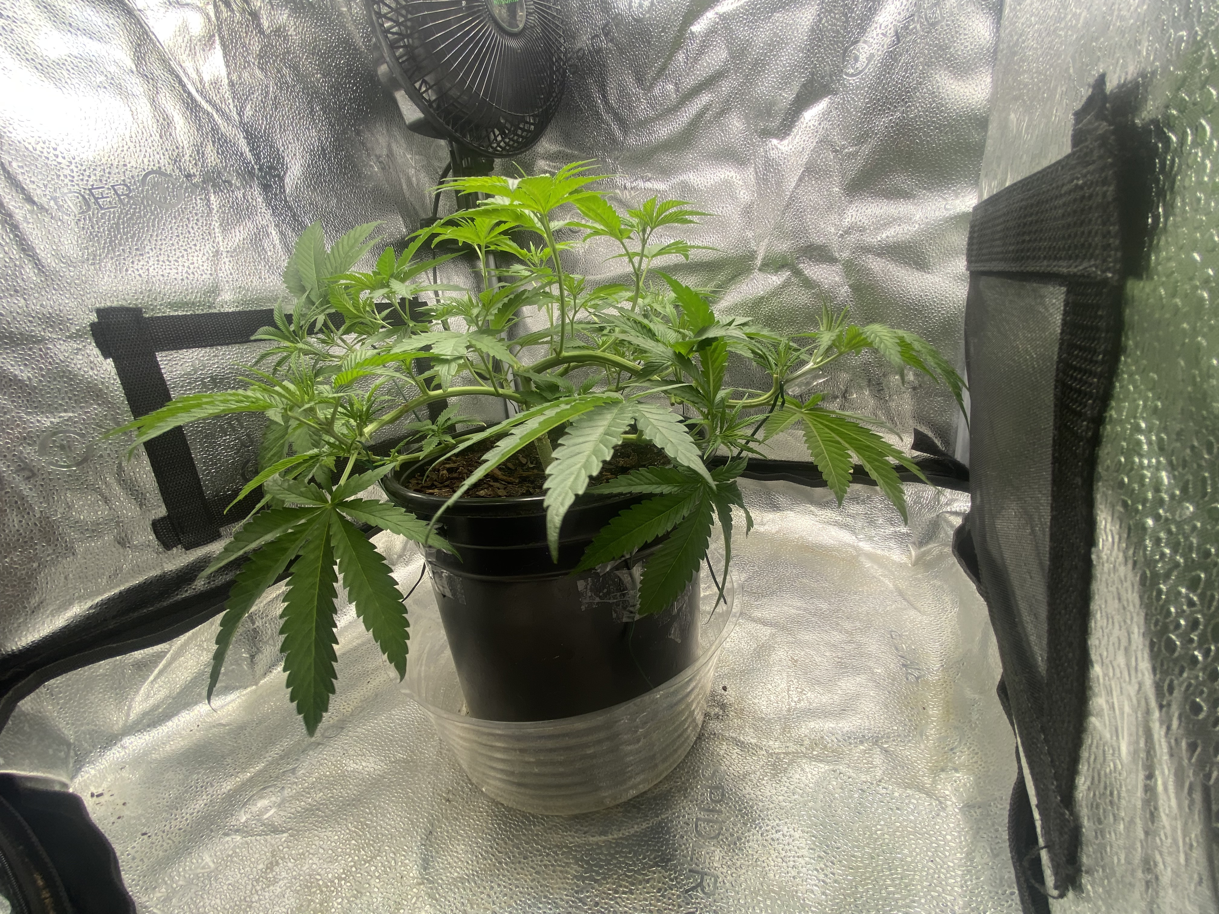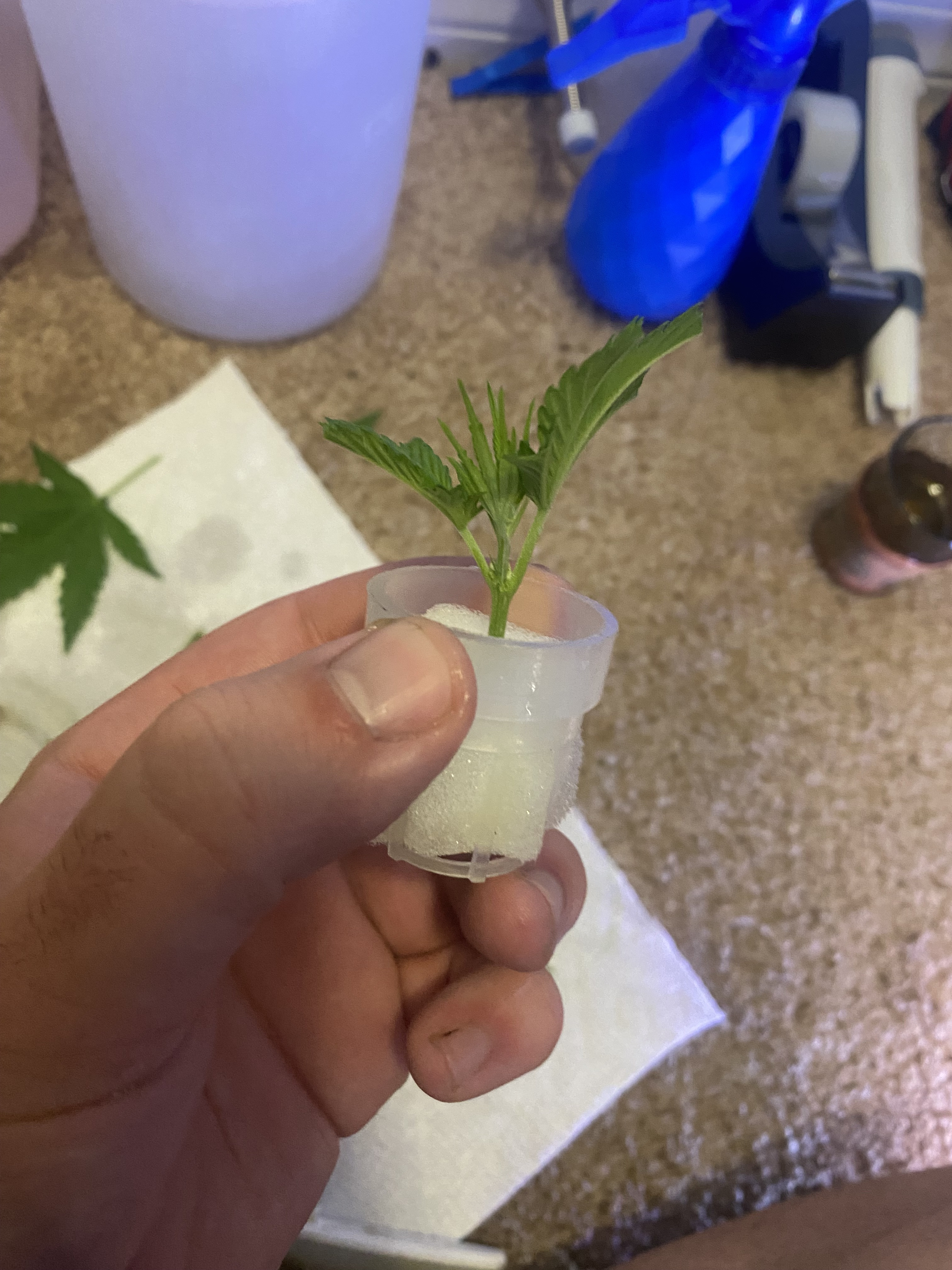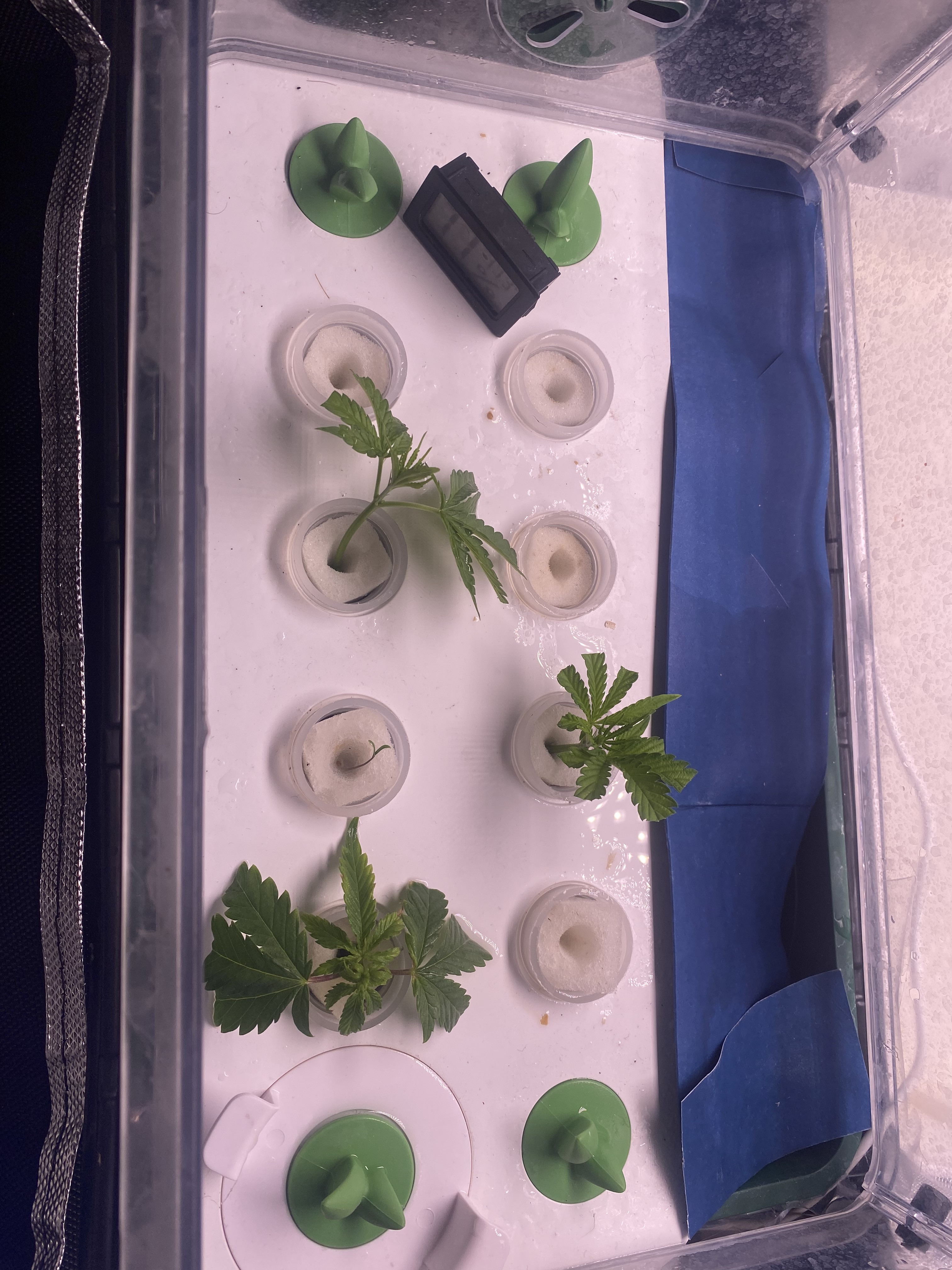 Update. Plant is doing good, tomatoe seedling germinated next to my clone, and my clone looks like its starting to show roots. Running 18/6 for the cuttings and tomatoe seedling, while doing 12/12 with my main plant. Its been