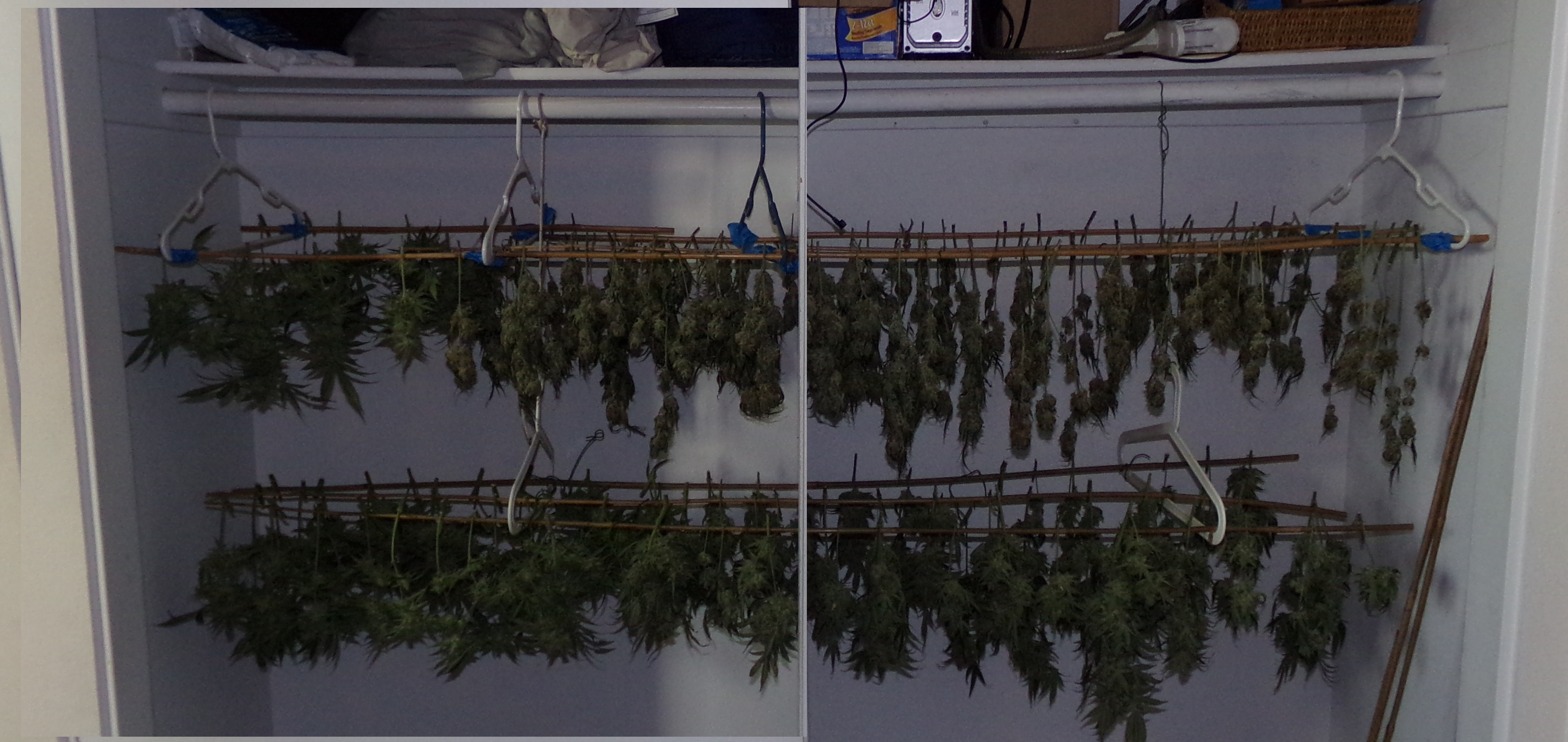 Okay, then. Best I could do to splice pictures to show the 42LF of dope hanging in a 35LF apartment. 6, 6-foot bamboo poles hanging from hangers. If I had trimmed everything all at once, there would be another layer of poles.