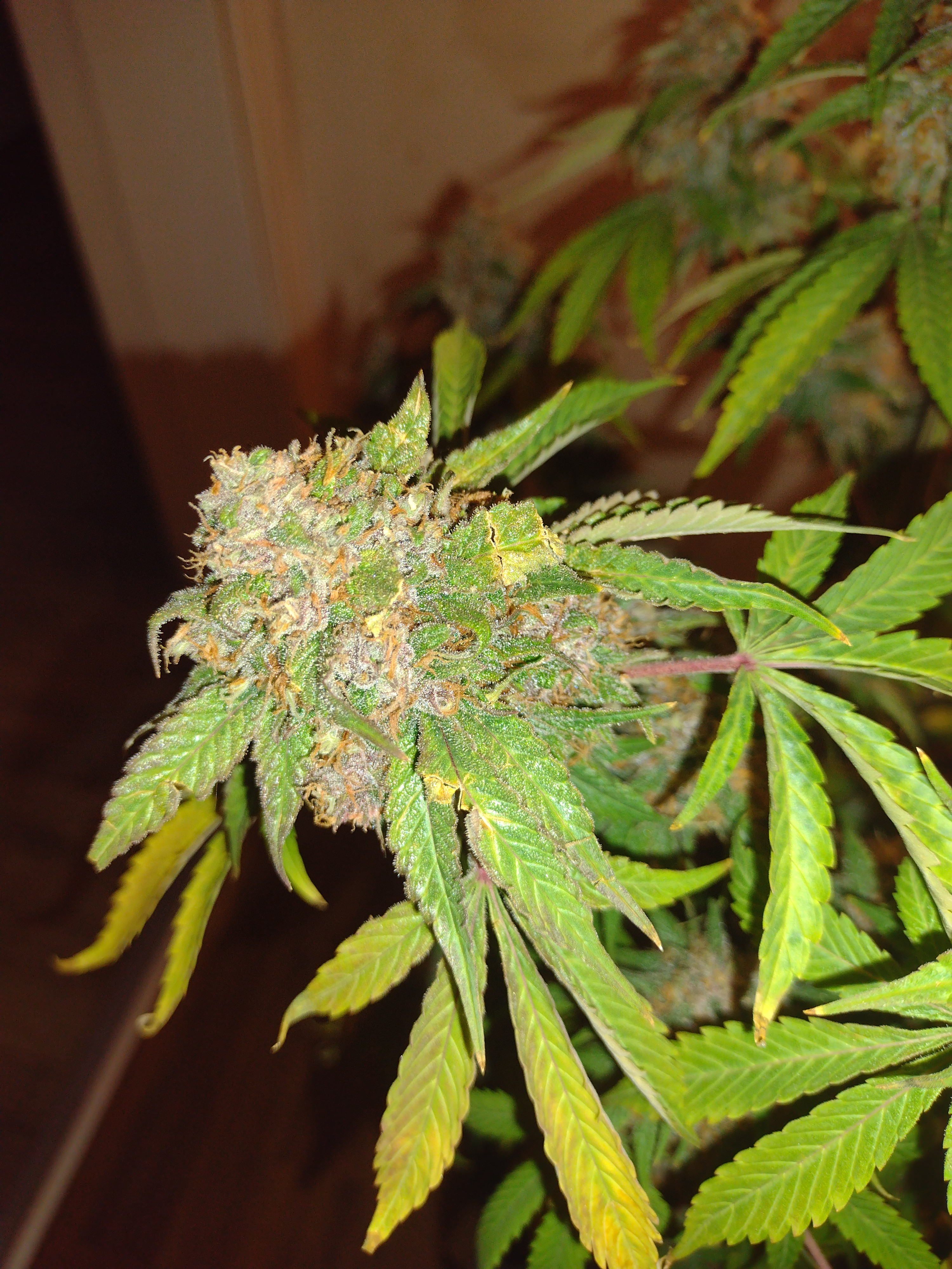 Those extra days gave her the time she needed. Perfect fade for scarlet. Should have some pink on the inside of the bud. All those leaves can be plucked with fingers while its in the pot. Check out that blood red stem color. Nice