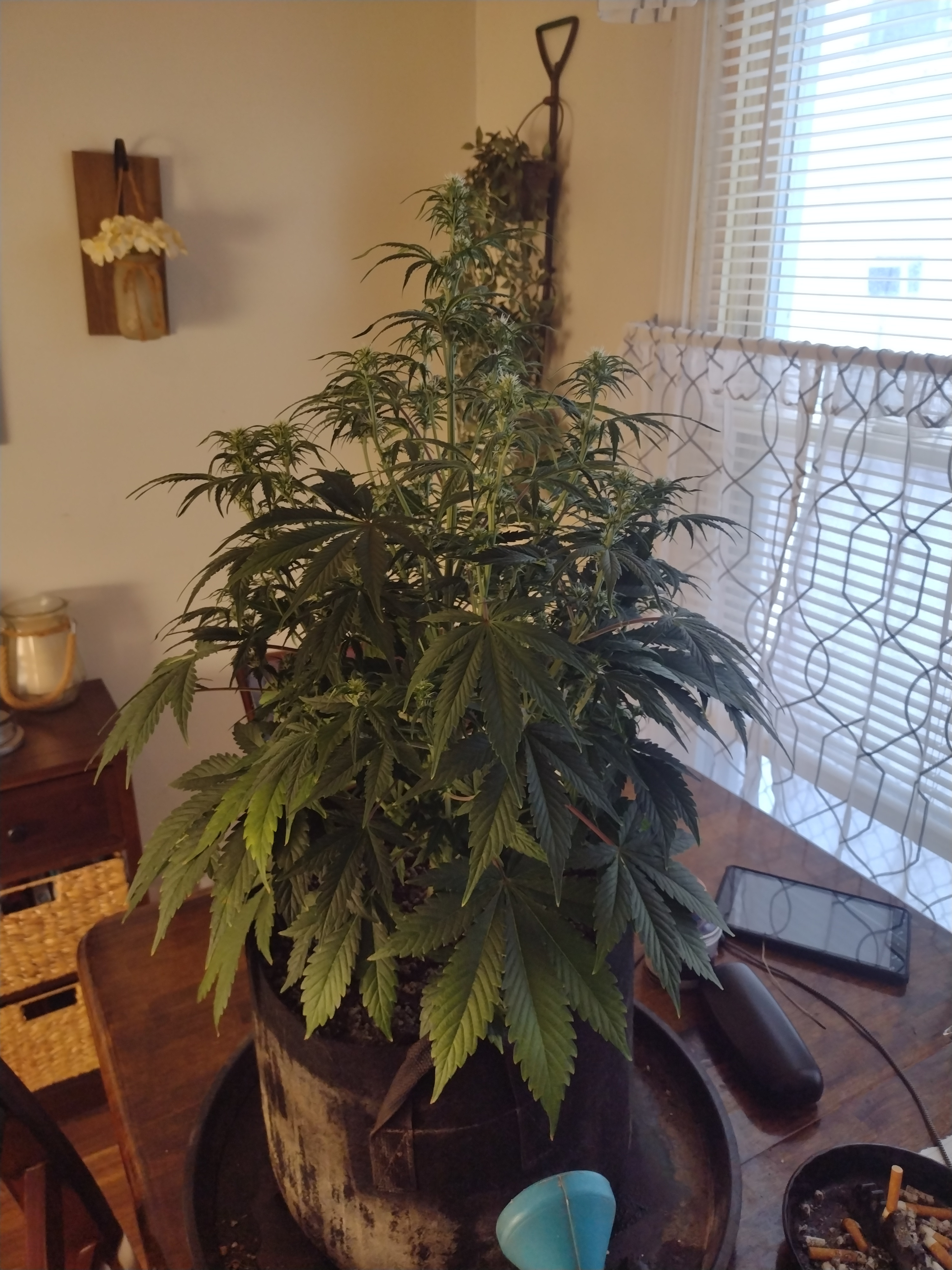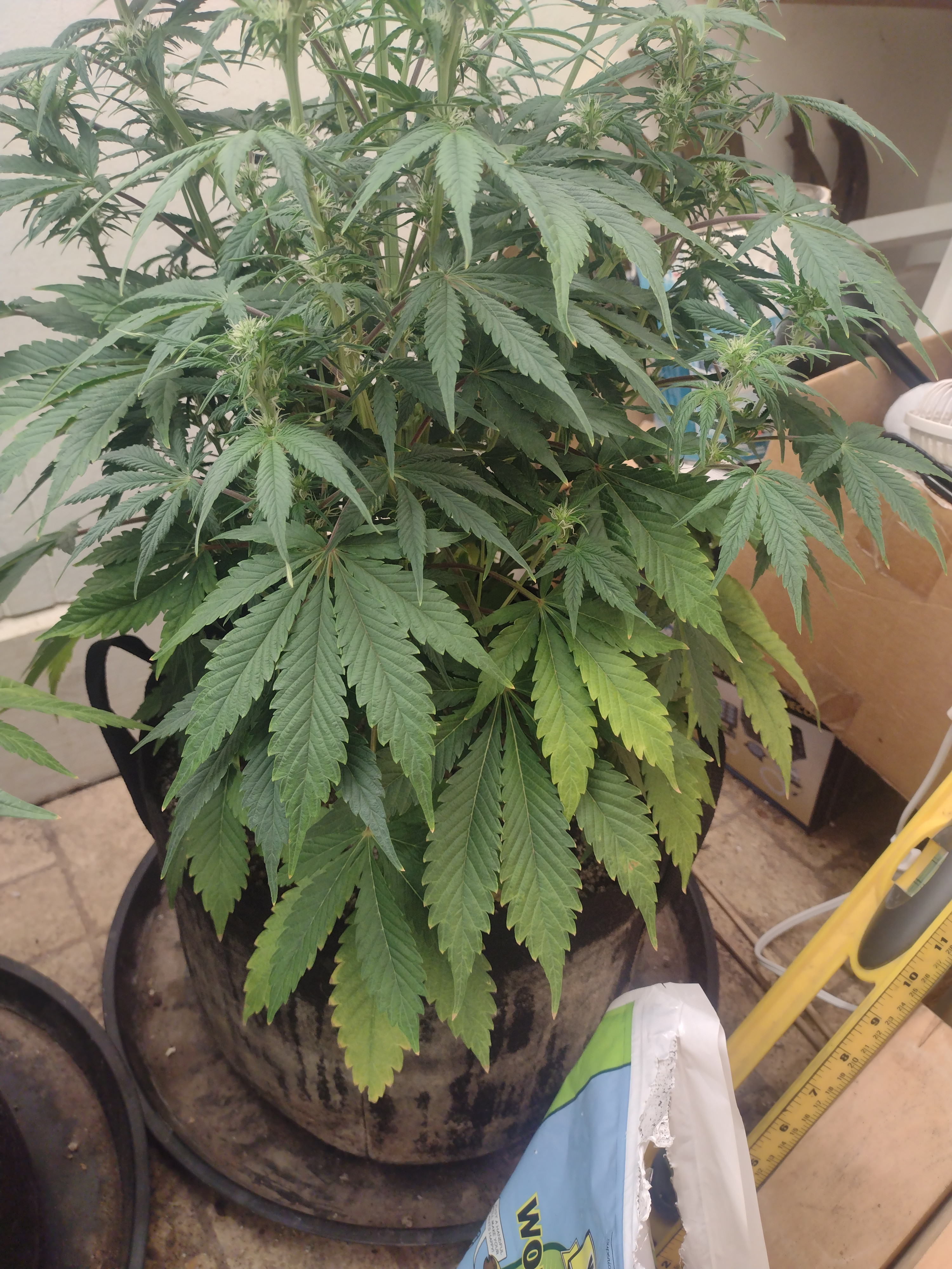 Shes still reaching, Feed time. She will shed them big fans when she sucks everything out of them. I'm pretty sure all nutes are going straight to the bud formation now. If you UP the nutes to catch up to feed the fans back from the dead you take a chance on burning the tips. Yellow is low enough not to bother much. Might need more Cow Bell. LOL