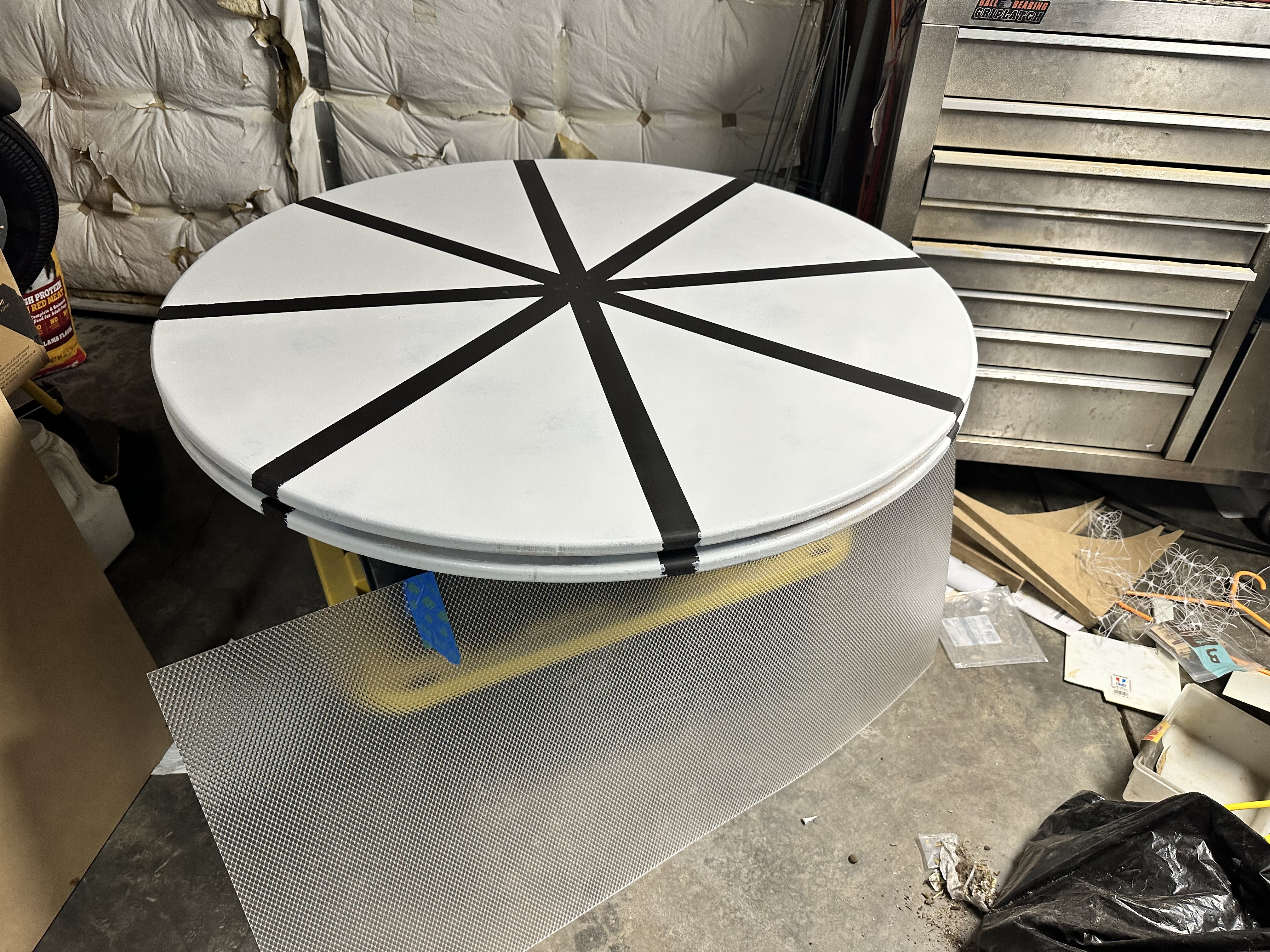 Was thinking it would be easier to turn, but it’s doable. Have strong magnets at 8 points to hold it in position when working on plants. Had them too close and they were hanging up. Center turns on a lazy Susan bracket from Lowes. There are 8 small wheels spaced out near the outer edge. Will be adding some 1” nylon webbing loops to grab to turn it.