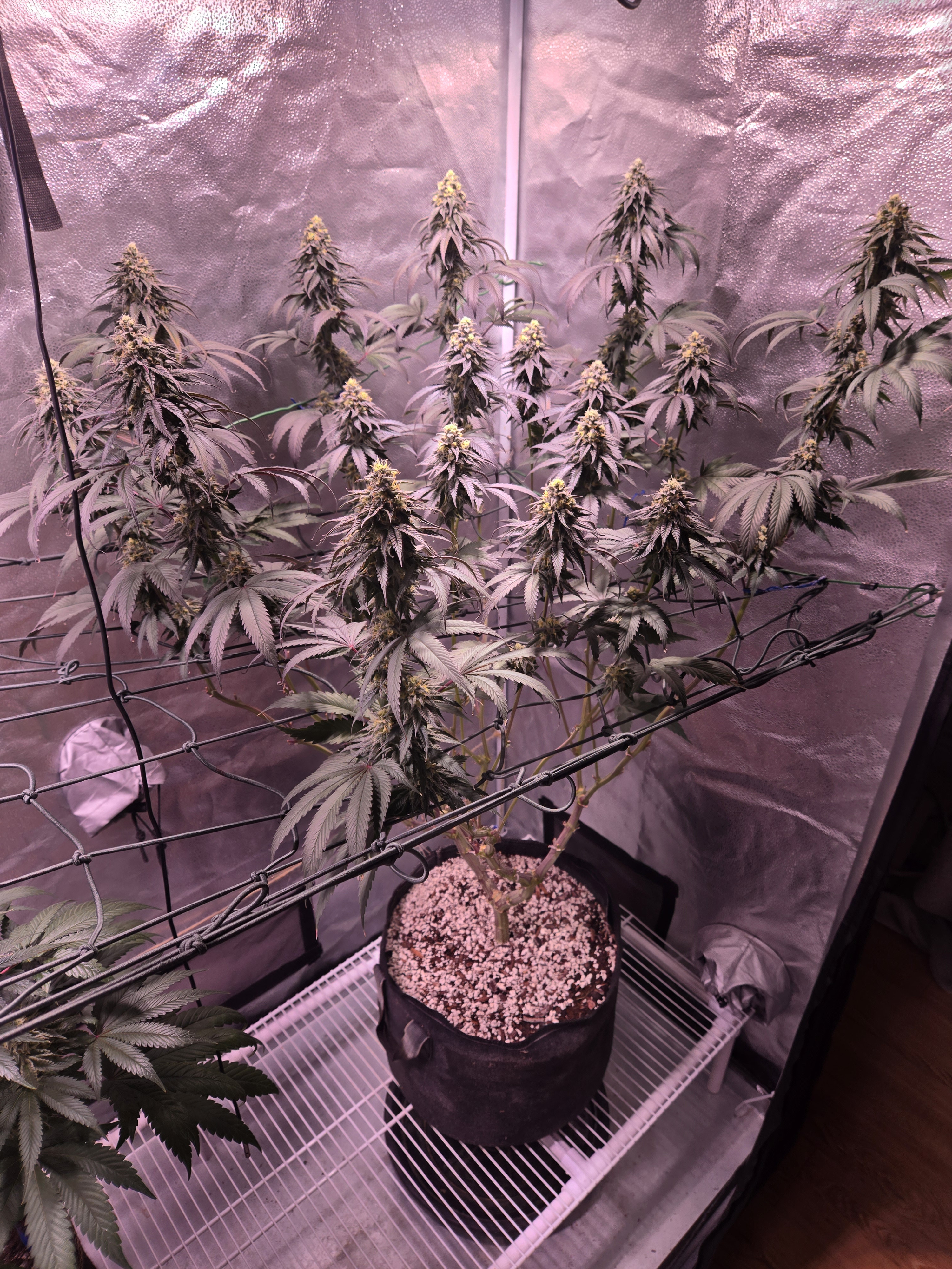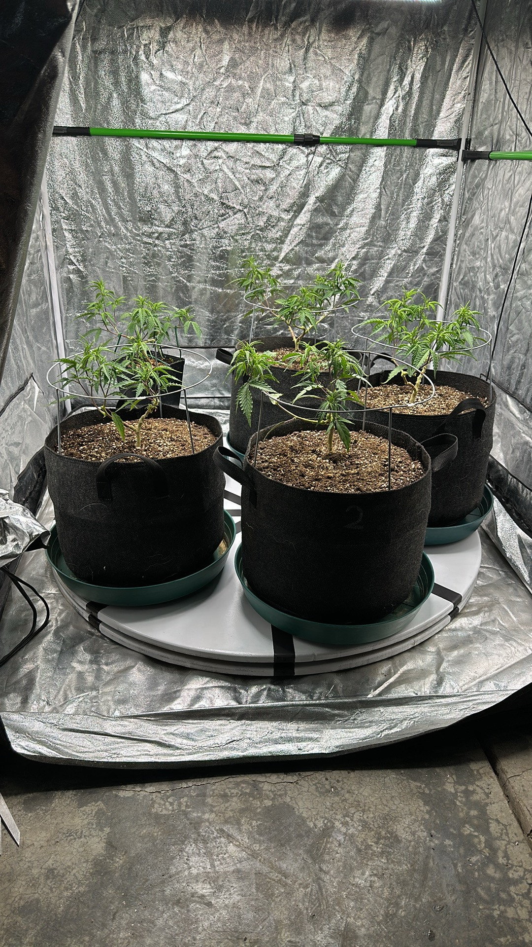 I have 5 afghan kush plants I 5 gallon fabric pots. I am mainlining all 5. I have built a giant lazy Susan, so I can rotate them to front to manipulate them. I have each plant on its own smaller lazy Susan. I’m waiting for plants to finish the last phase of mainlining. Originally meant to have 4 but all my clones were doing good and my friends didn’t want to adopt ut