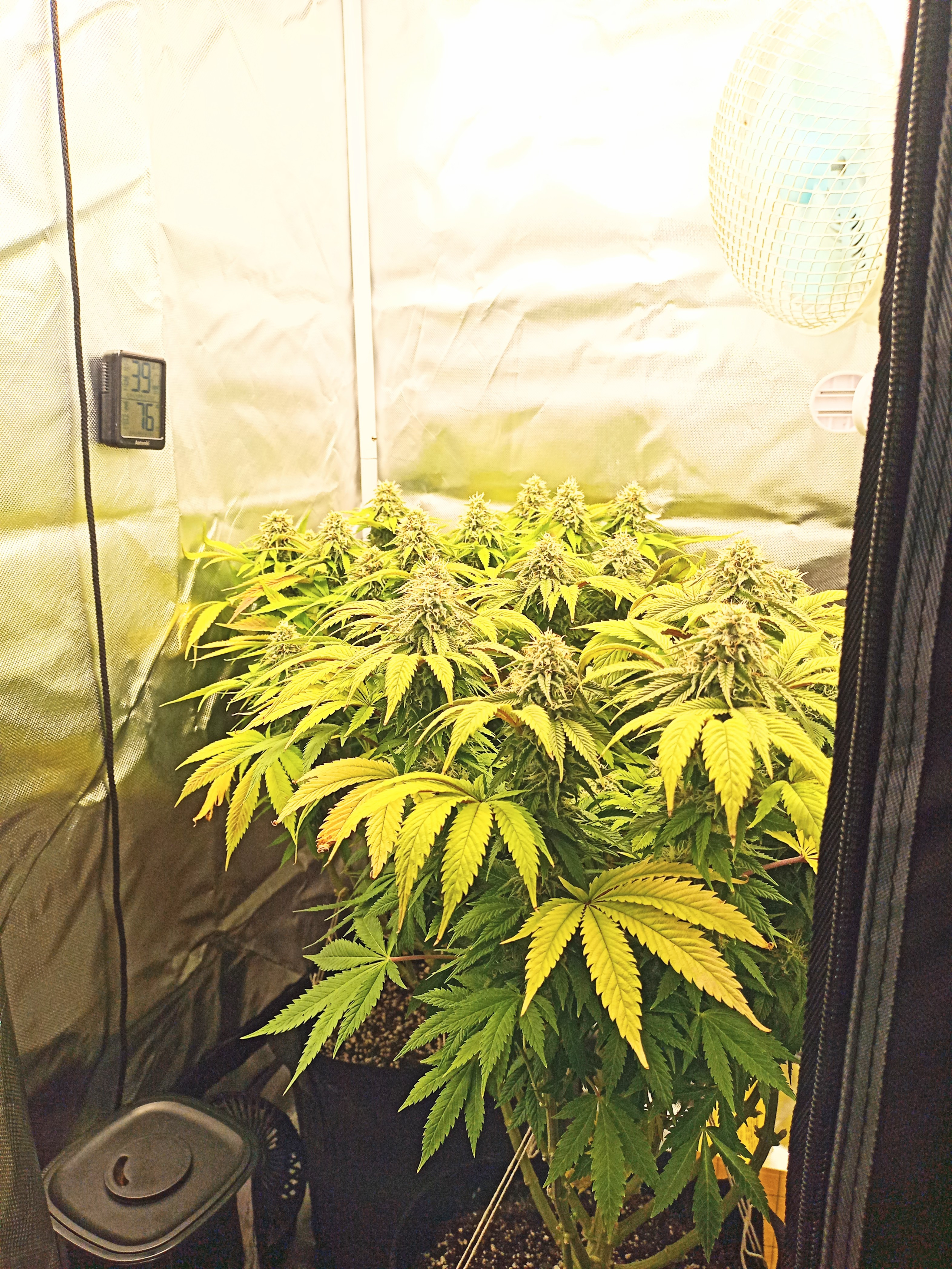 Are the leaves of the canopy yellow compared to the color underneath? In other words, is some bleeching going on?Flower Room: 11' x 7' x 7.5'H, 480w AC, 13gal/day dehumidifier, 1.5gal ultrasonic humidifier, 60gal (27gal usable) nute tank, 16" pedestal fan & 18" wall fan. Lighting and climate automated. Hand watering.