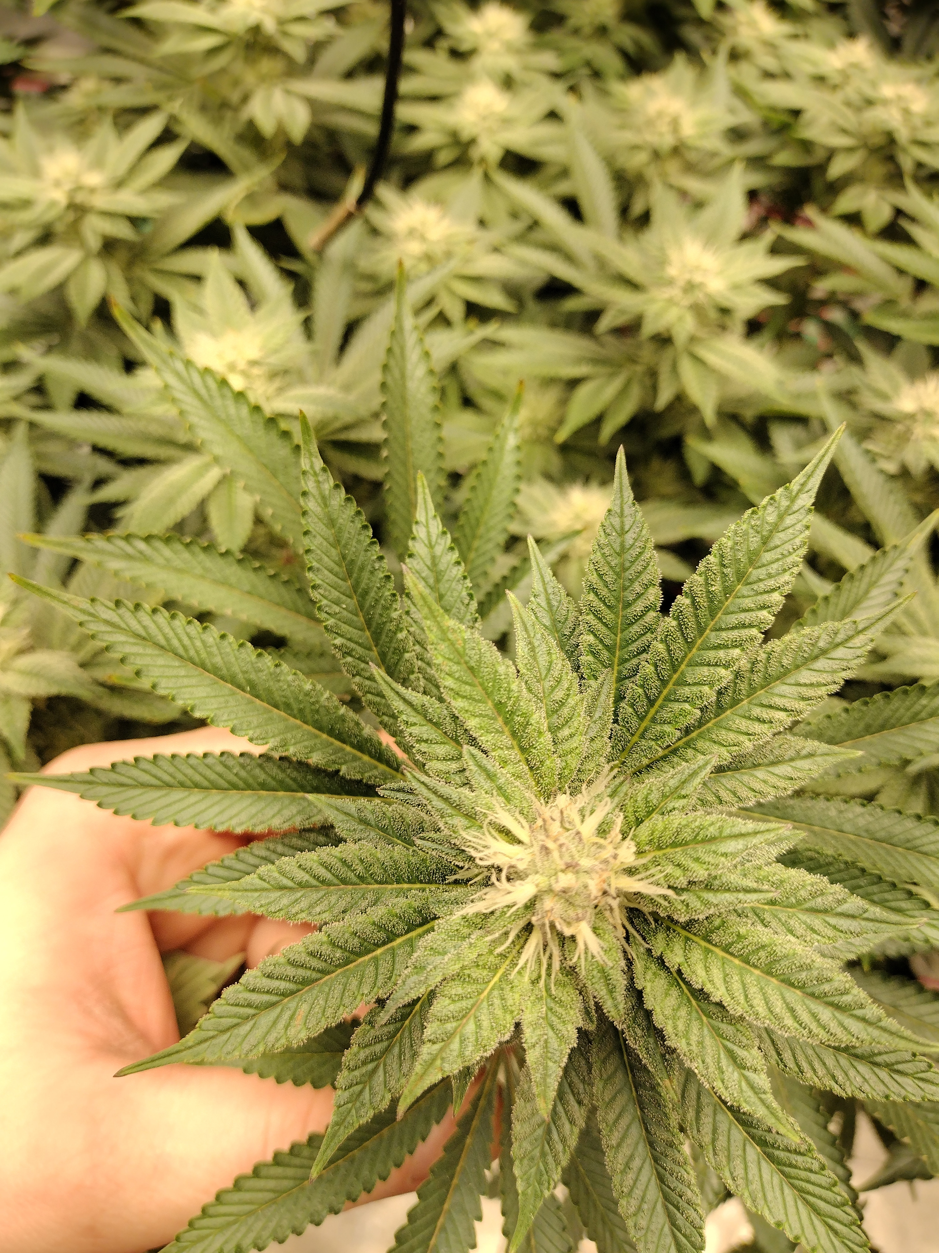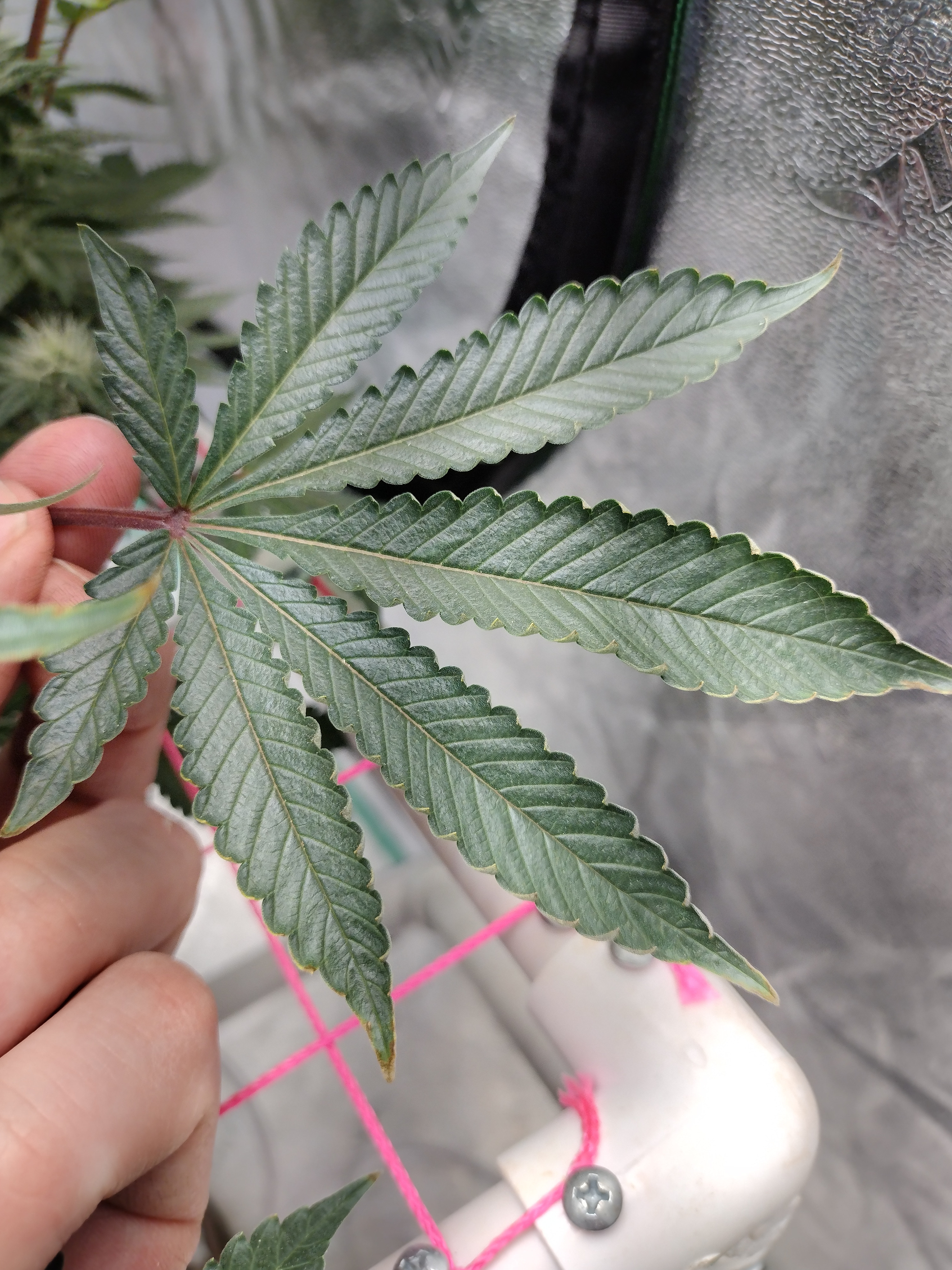 Hello, could someone give me advice? Is this nutrient burn or light stress. Ppm are at 975.ph is 5.8 I did get the ppm to 1300 but brought it back down when I started having problems. . I was feeding it big bud since week 2 a long with gh Lucas method and cal mag. Super sherb in dwc. In a 5x5. I'm having problems with both plants. It started on the lowest fan leaves. I have 2 led lights in my tent. I thought if it was light stress it would effect the top leaves first. Any help would be appreciated. I'm in week 4 of flower. I'll upload more pics if needed