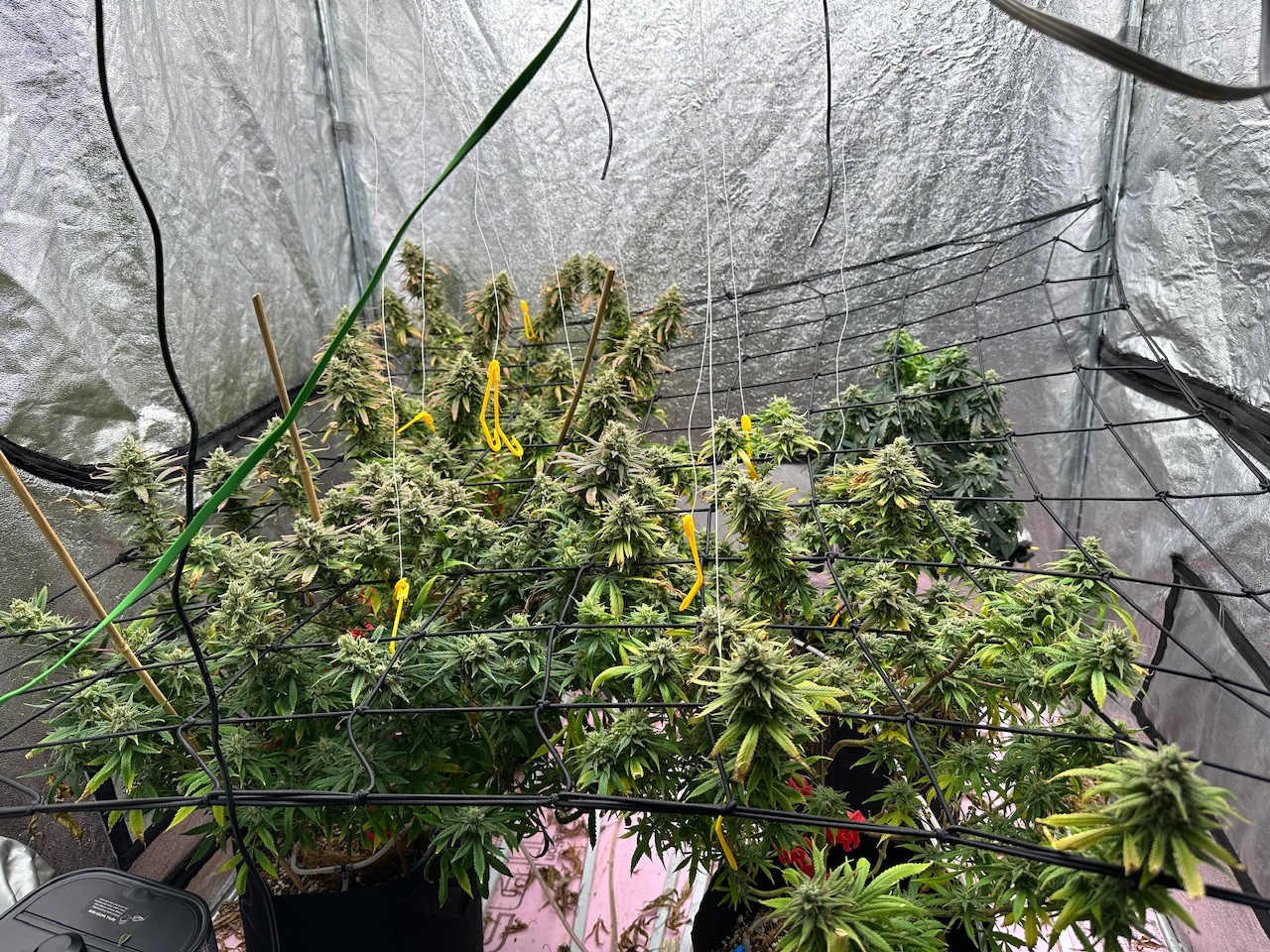 Flower Room: 11' x 7' x 7.5'H, 480w AC, 13gal/day dehumidifier, 1.5gal ultrasonic humidifier, 60gal (27gal usable) nute tank, 16" pedestal fan & 18" wall fan. Lighting and climate automated. Hand watering.