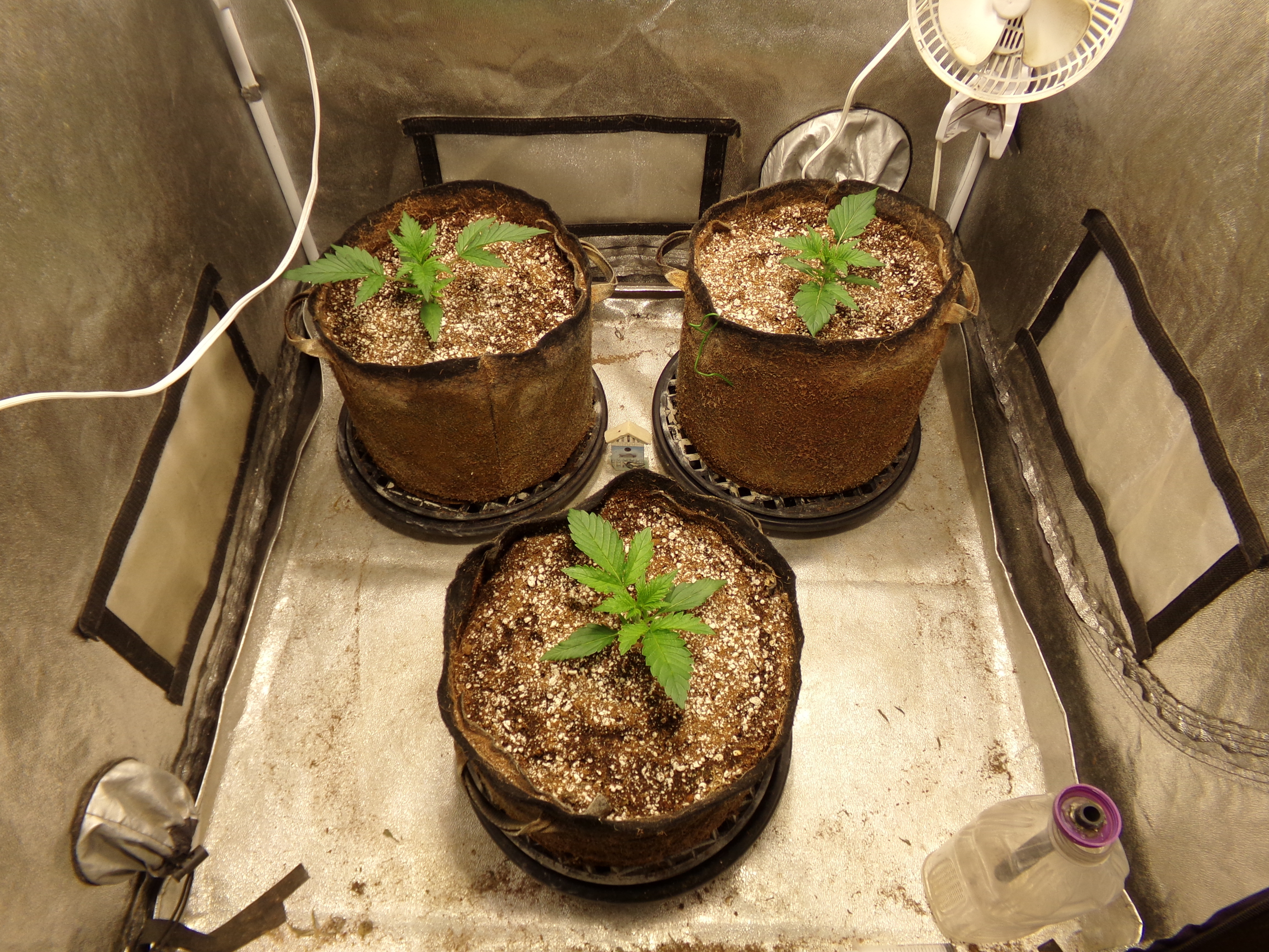 Planted 5. 4 came up. 1 rotted/died at about an inch above coco. Champ is left. The mutant is right. While the other two were growing their first three finger fans, Mutant Girl grew a one-finger and a two finger and the first one-finger leaves were real crinkled-like. Front is the slacker. Slacker Girl and Mutant Girl have picked up the pace and are looking less mutantish. Are the first three weeks more stressful than harvest?