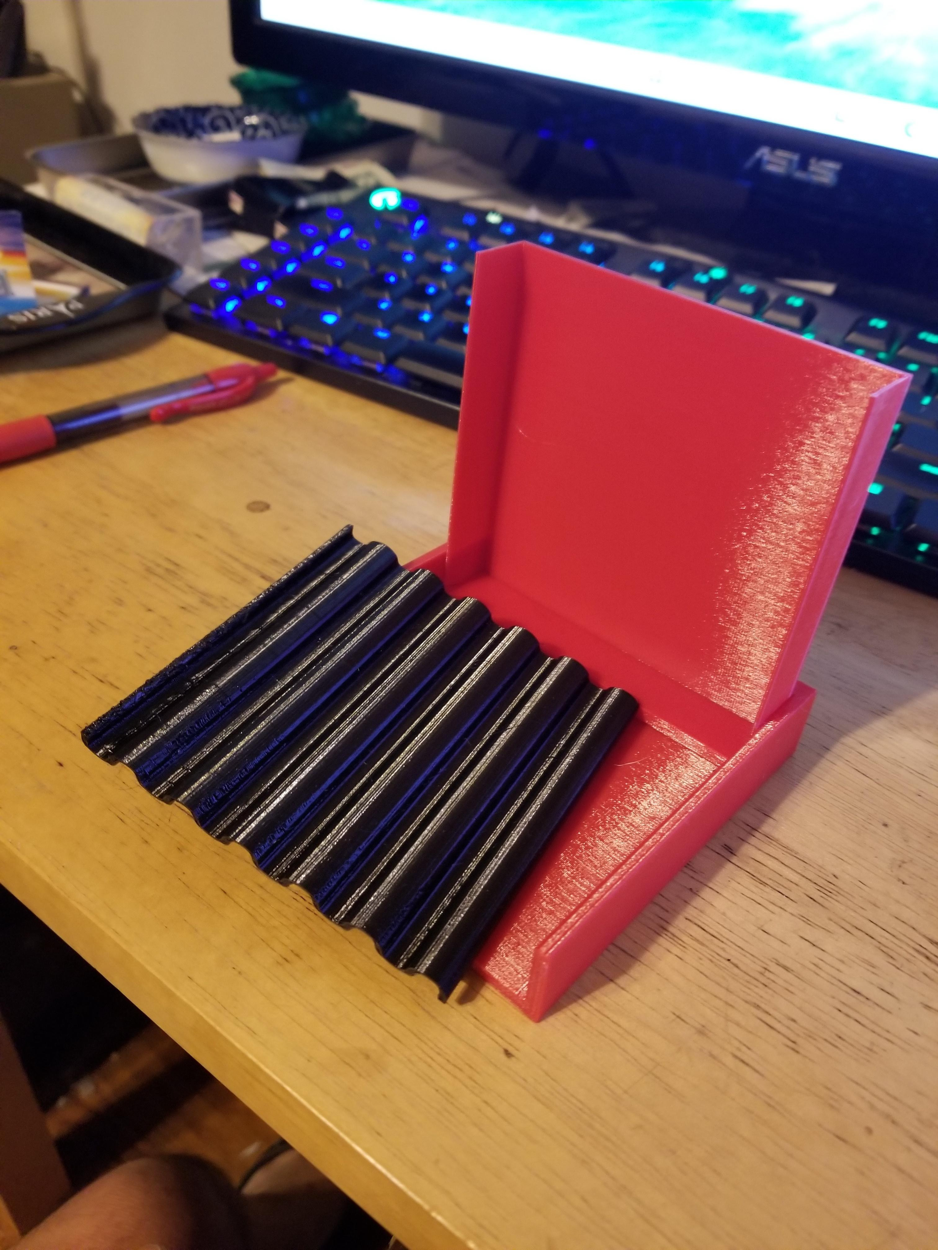 While a CD case works well, these work even better. If y'all want one I'll ask the 3D guys if they'll print up a few for you. I got one of the early ones. One of the last ones I saw coming off the printer was using multicolor filaments so it was pretty wild looking. Same function just not so bland!!!