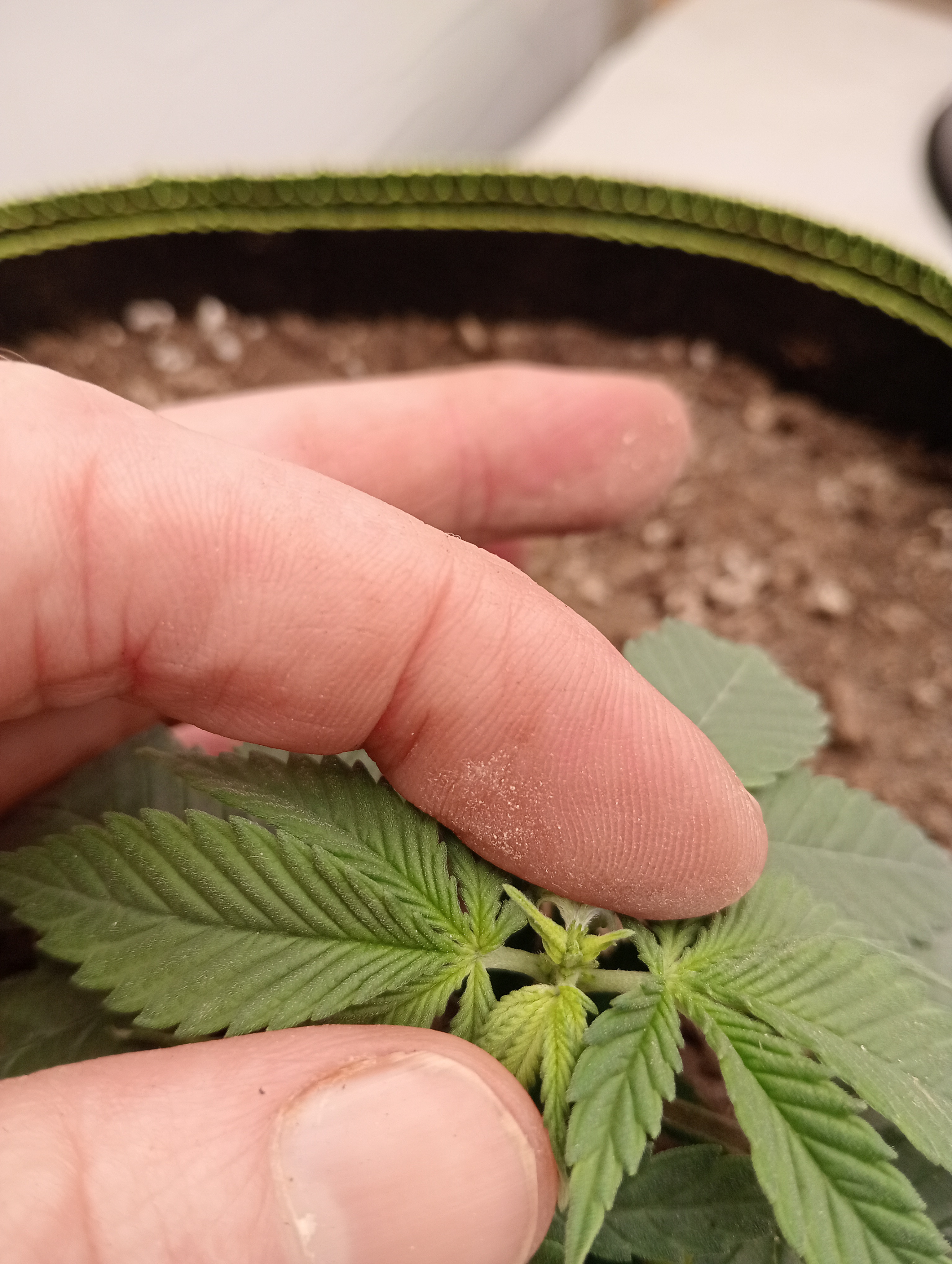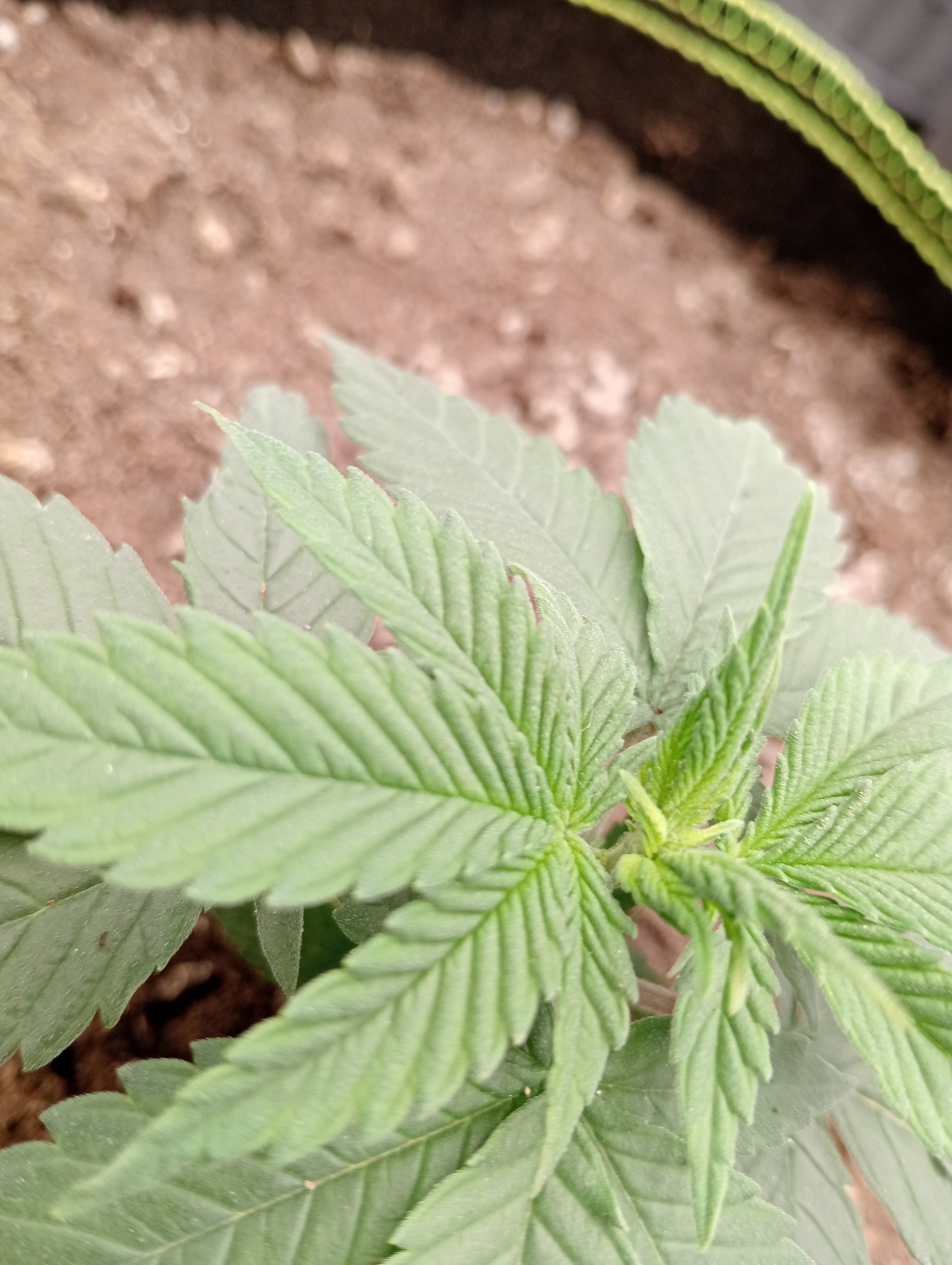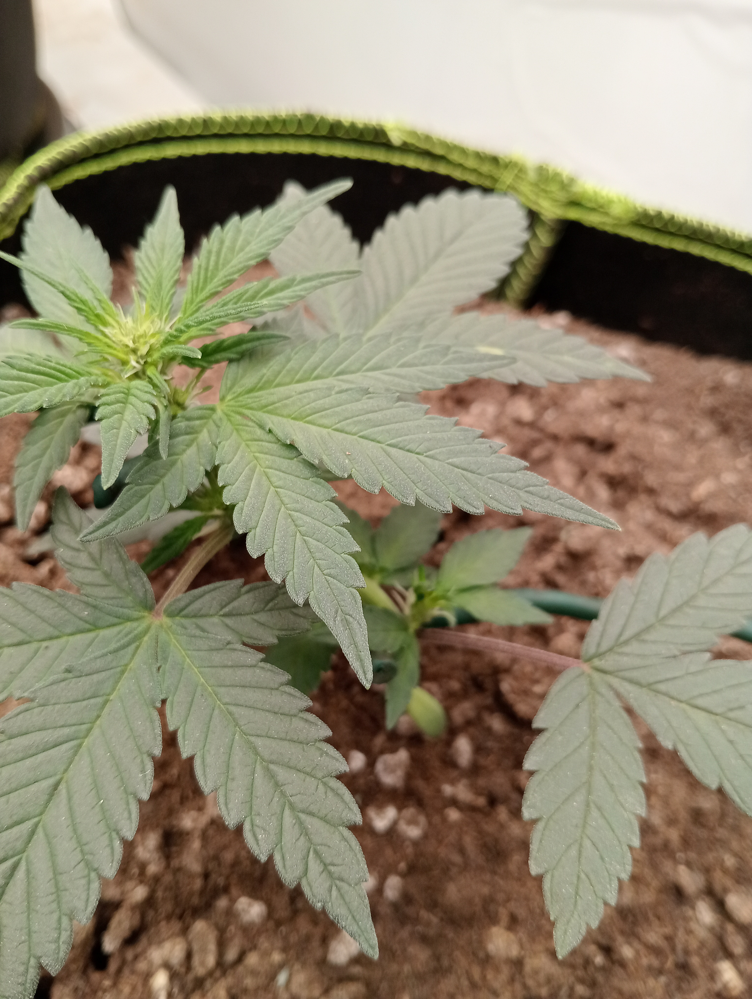 So 4 weeks since germination and day 8 in the big fabric pots and I'm not seeing much growth since the first little spurt π however they are starting their 6th lateral and looking healthy and green so I FIMmed 2 and stripped the first laterals off closest to the dirt so they can focus on the top growth. The third one has started to flower so Ive just tied it over a bit and will see what happens. I've also set up some pot saucers I drilled a few 10mm holes in for air to get to bottom of plants. Not too concerned about run off as I'm following Nebulas watering schedule for water only soil.