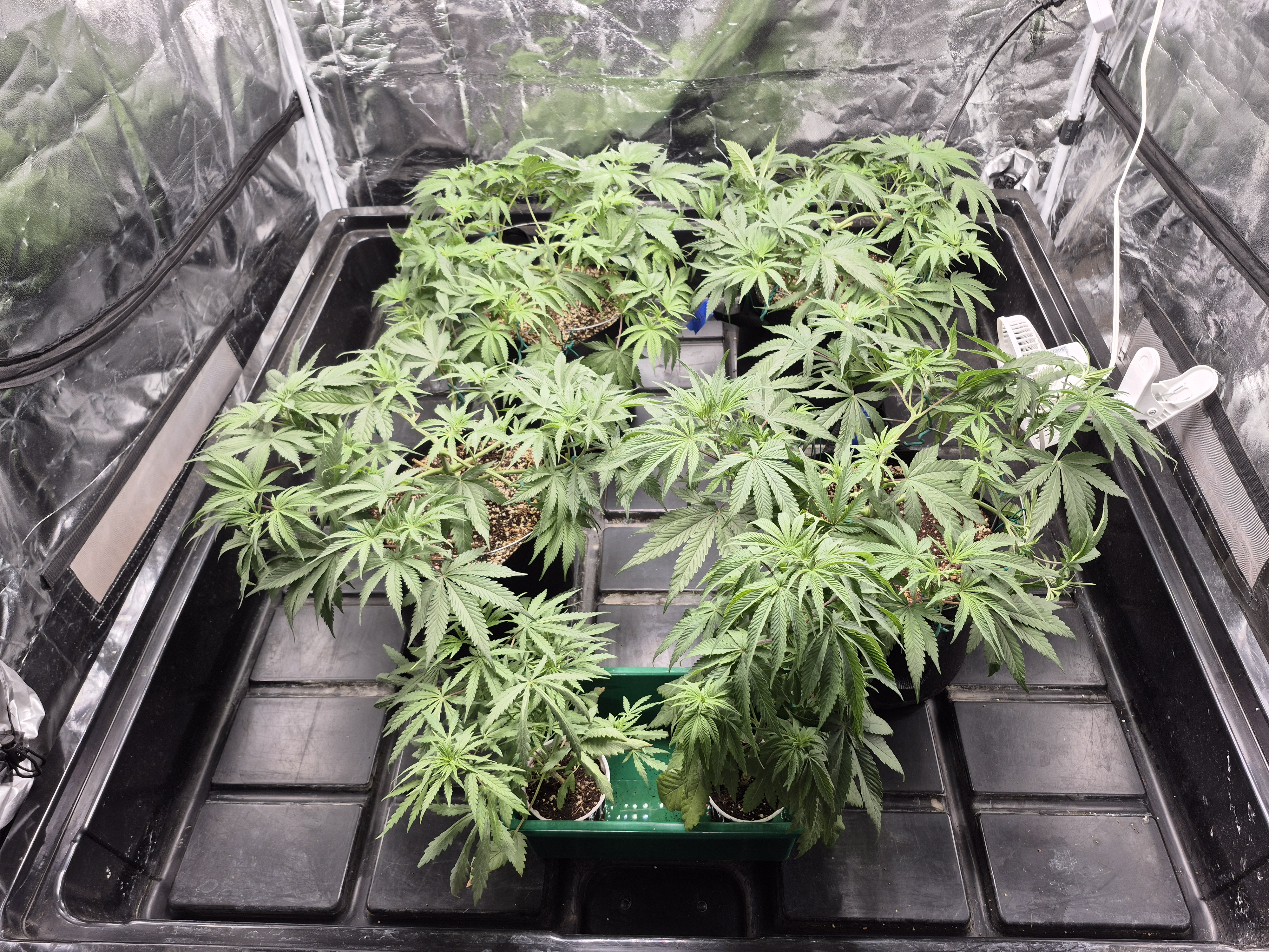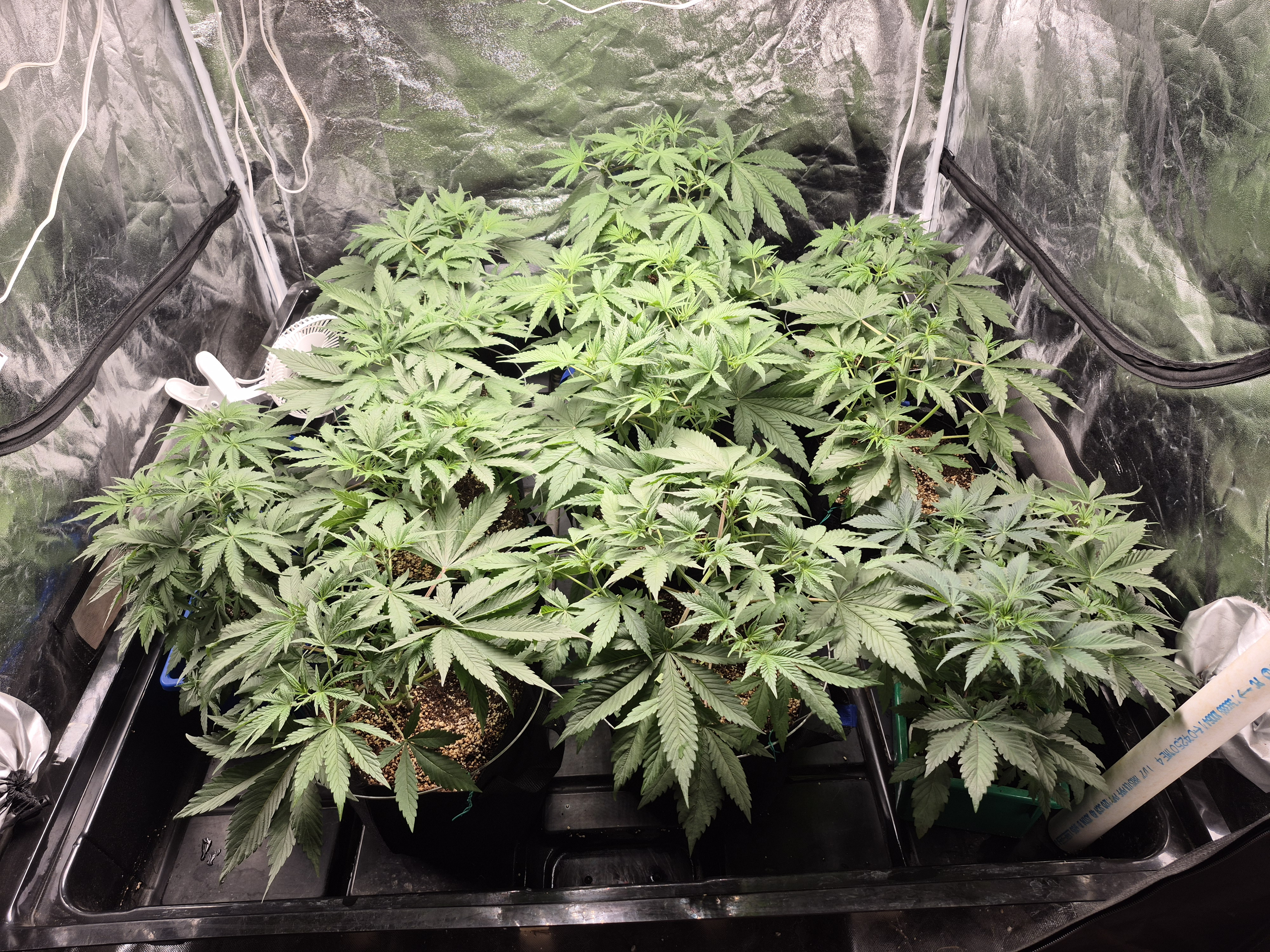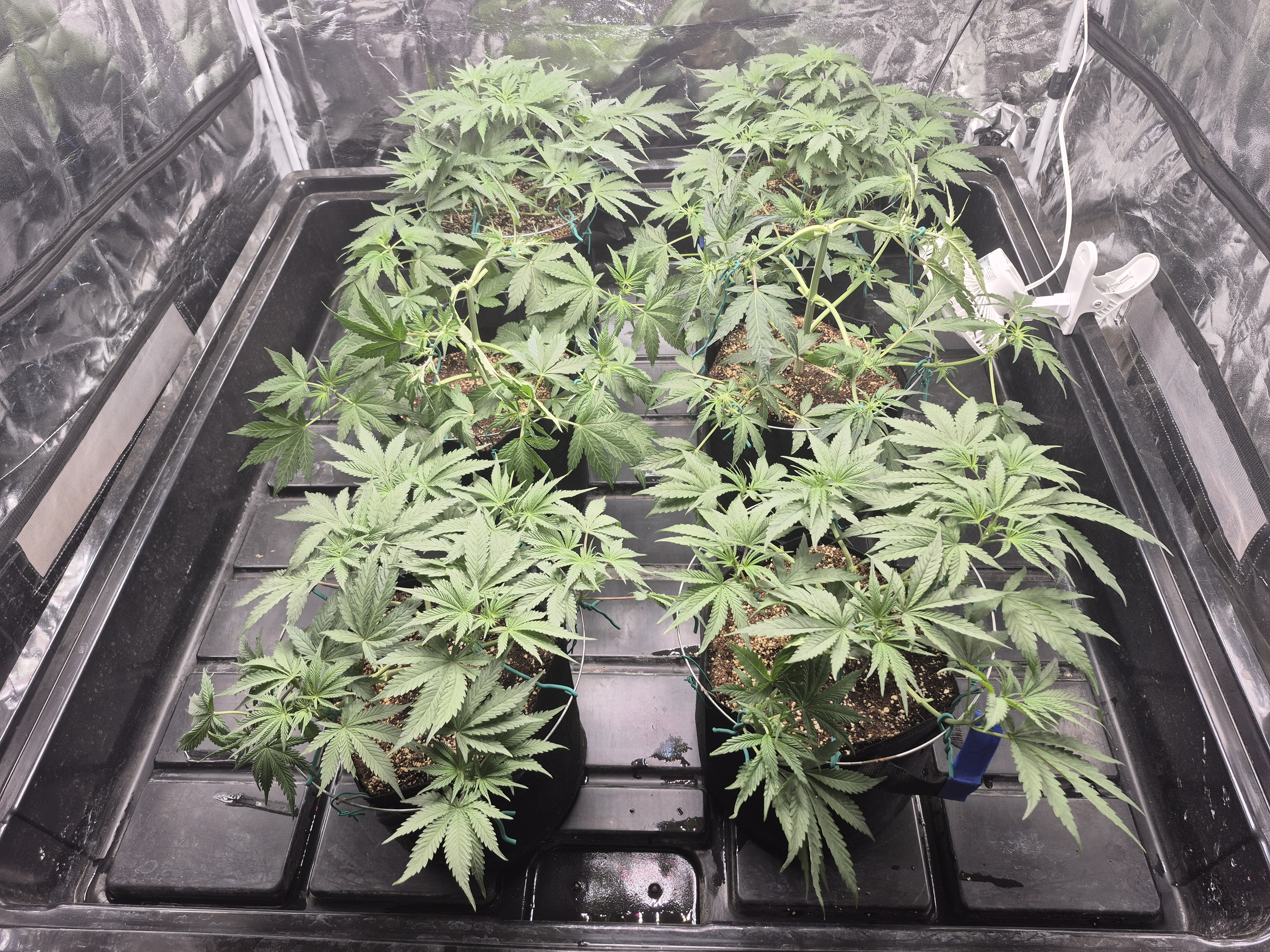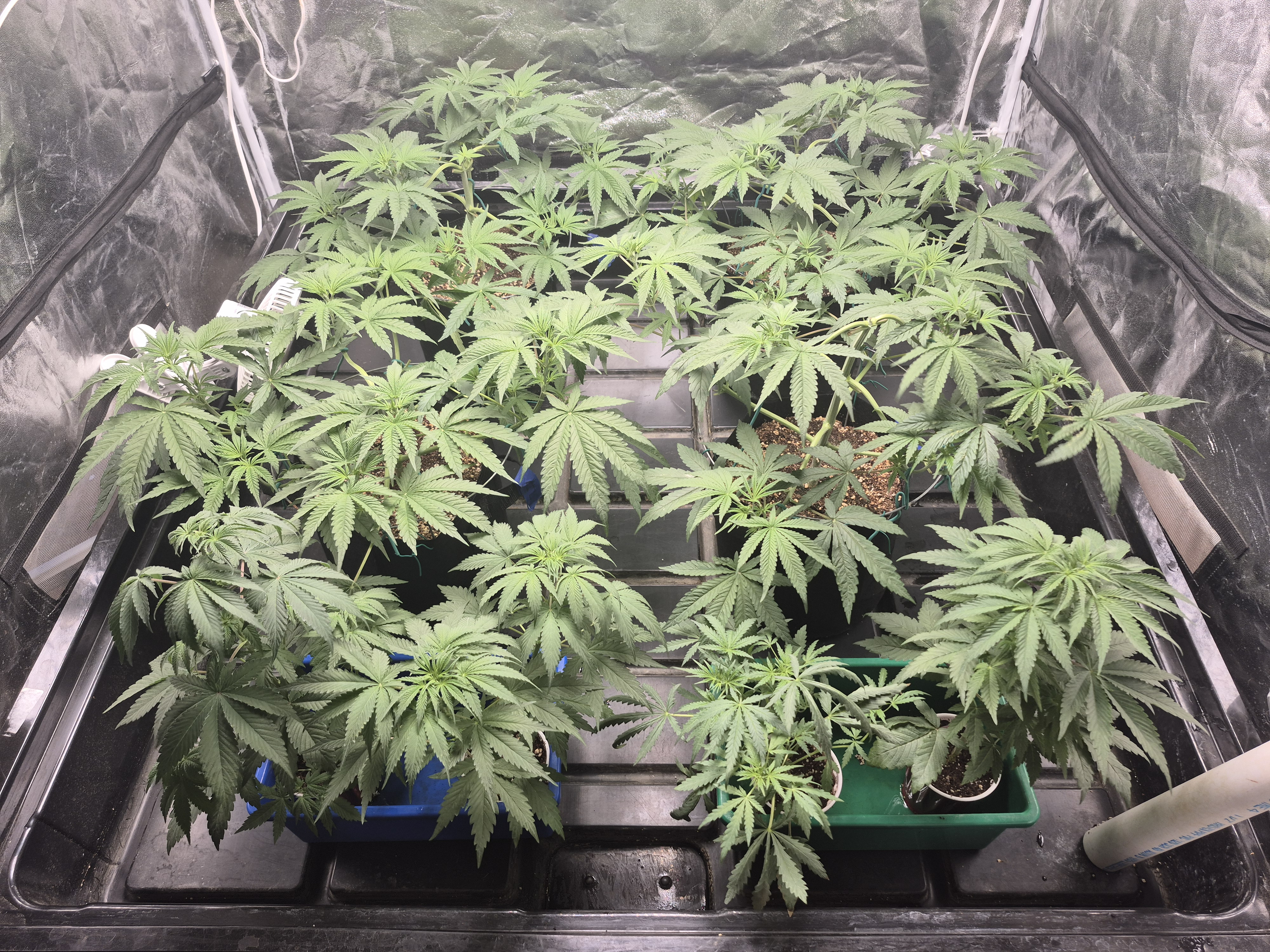 The training is complete, a defol was done yesterday, hard to tell. Just about ready for flip. Sluricaine needs a few more days, and slurilope is prime for flip now. It is easier to keep them on the same schedule so in a day or two I will flip them. The solos have been doing really well also. I bet they will be tall after the stretch. This is the fastest I have gotten to flip ever. The only thing different is that I waited until later in the year to start to hopefully avoid intense humidity during the end of flower. The temps were warmer when they were seedlings, maybe that is the reason.