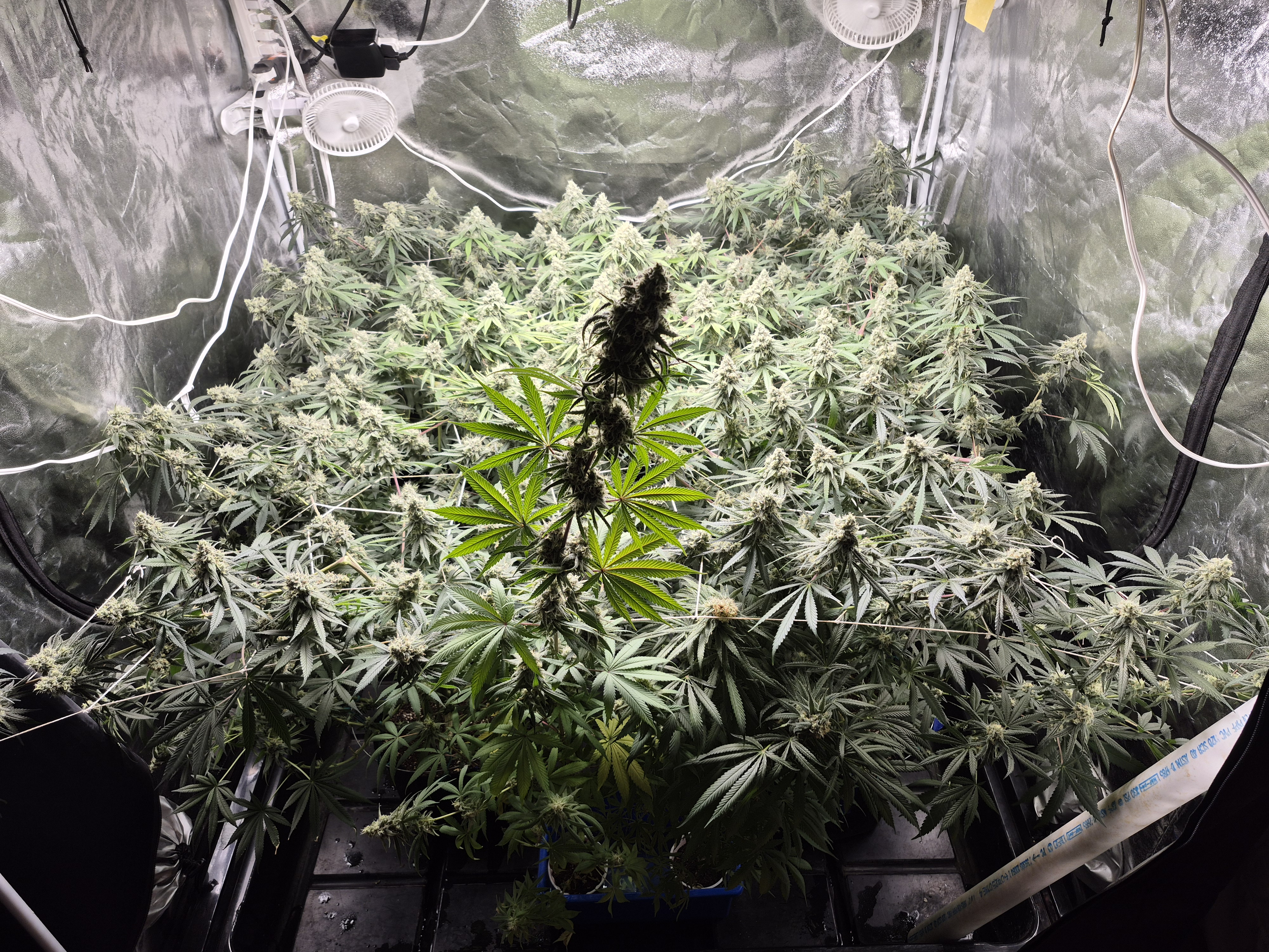 Everyone is still in a steady march to the finish. There are buds everywhere and they are getting fat, the trichs are about 50% cloudy. The air is filled with the sweet aroma of DANK. What a wonderful day, sun shining, 80*, 31% RH, a gentle 5mph breeze spreading that wonderful DANK smell everywhere. I can smell it in the house 50 ft away when the breeze wafts through. I wish I could preserve the smell of fresh DANK as a room air freshener. The smell from dried flower is nice but not as good as fresh on the vine DANK. Wish I could post it for everyone to smell, and enjoy. Today's pix.