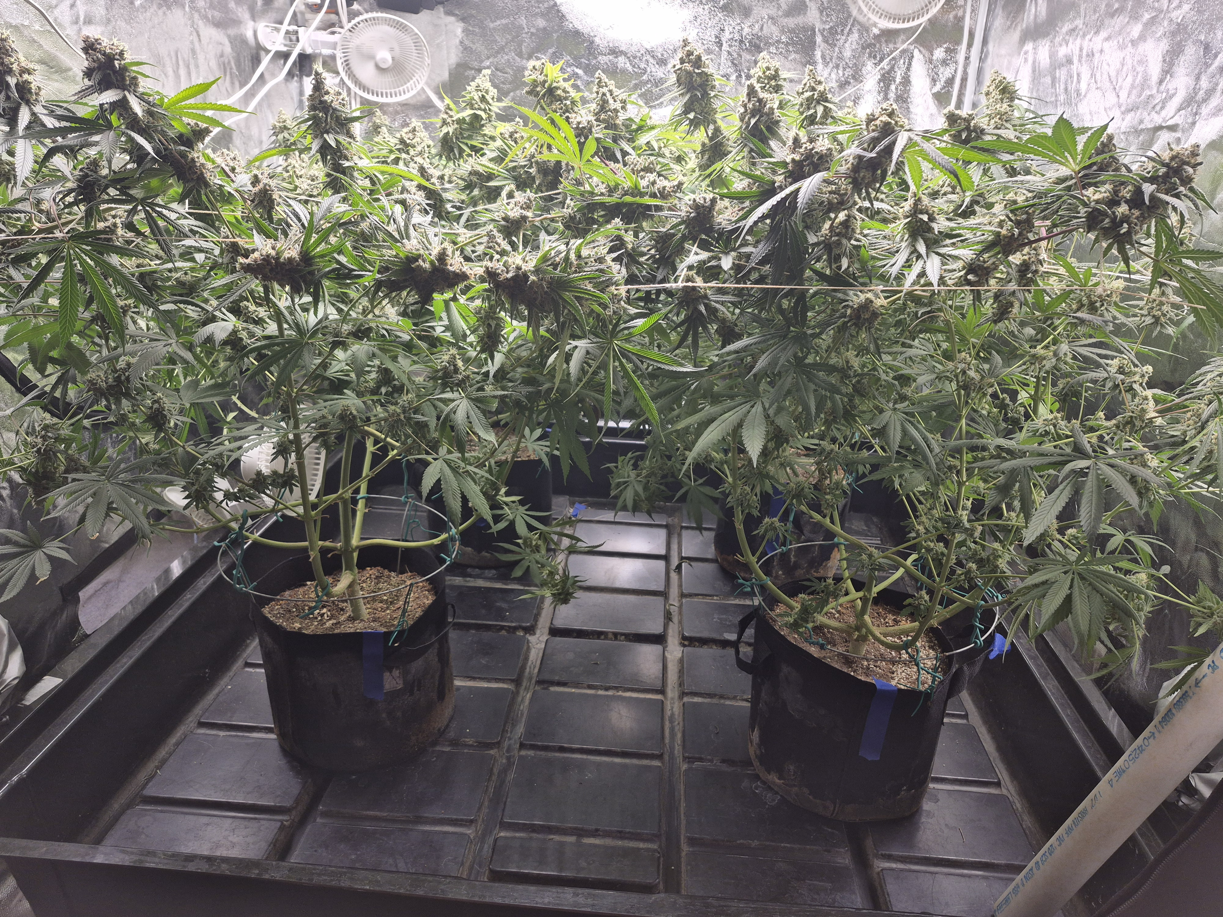 Yes, it was a good run on this strain, it is my cross breed experiment from last year. Harvest time happy time, nothin left to do but smile smile smile. Those are 3 gallon pots. The tray is a 4x4 flood tray from HTG. The inside dimensions are 4x4 so add about 8 inches for the borders. It is set up on a slight incline so all run off comes to the front. Works great and the entire floor is waterproof. It was about $100 but there was a catch. It is to big to ship by UPS or similar shipper. It needs to go truck freight. The quotes for that was $275- 350. There was a HTG store about 15 miles away so I was lucky just bought the trays from the store no shipping. I did have to tie them to the roof of the car to get them home.Don't worry, be happy, grow sticky buds.