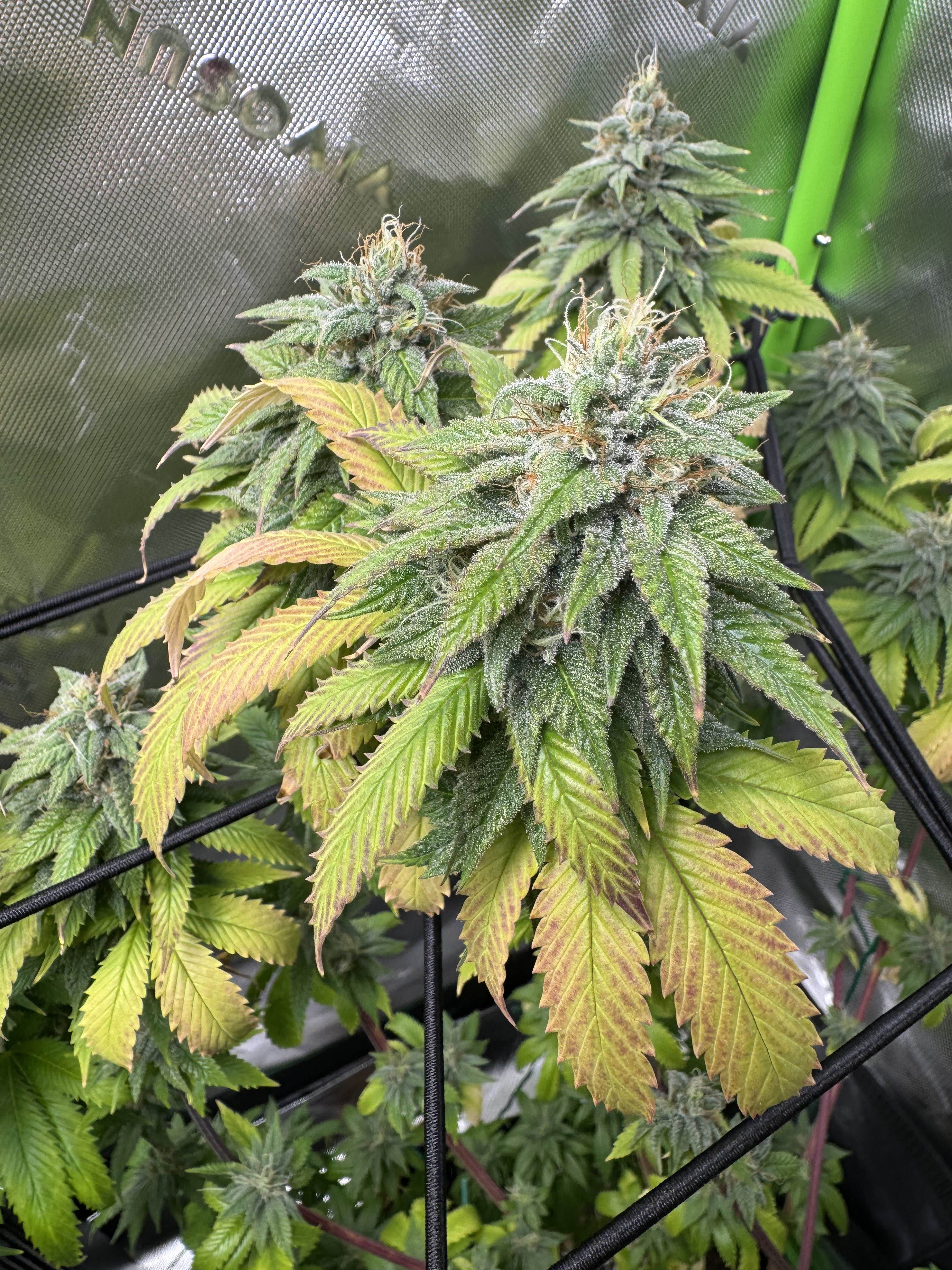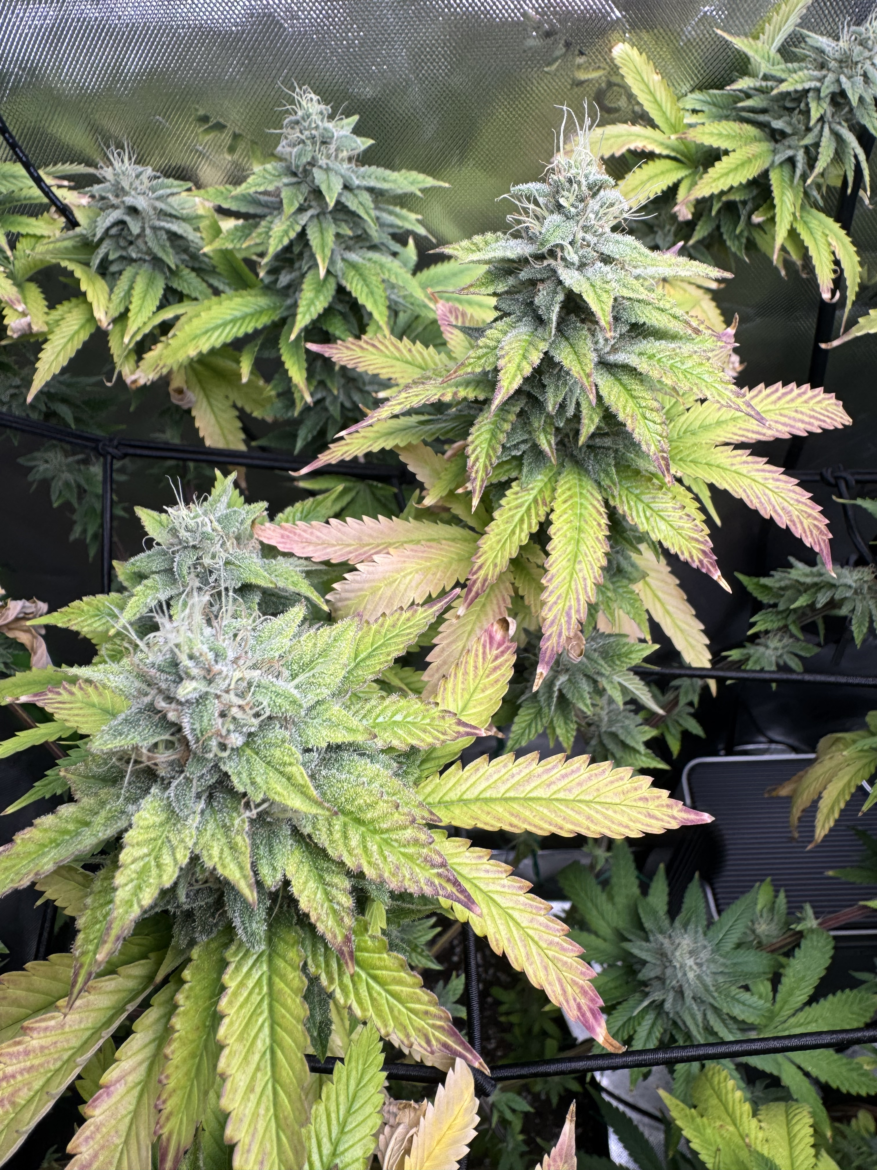 just in the last day or two these leaves have started getting reddish/brown on tips and around edges. I've inspected the buds and they all look healthy - no brown growth and nothing that looks like mold spores. They've continued to get nutes every other watering - FoxFarms Trio at half strength (Big Bloom 1.5tsp/gal, Grow Big 1tsp/gal, Tiger Bloom 0.5tsp/gal). They were also flushed for the first time a week ago - Fox Farm Sledge Hammer 2tsp/gal. I've been dealing with heat and humidity challenges - according to my GrowHub, over the last month temp has averaged 80 degrees F and humidity has averaged 60%. They're planted in soil (5gal fabric pots) in a 2x4 tent with 200W LED light at 75% intensity.