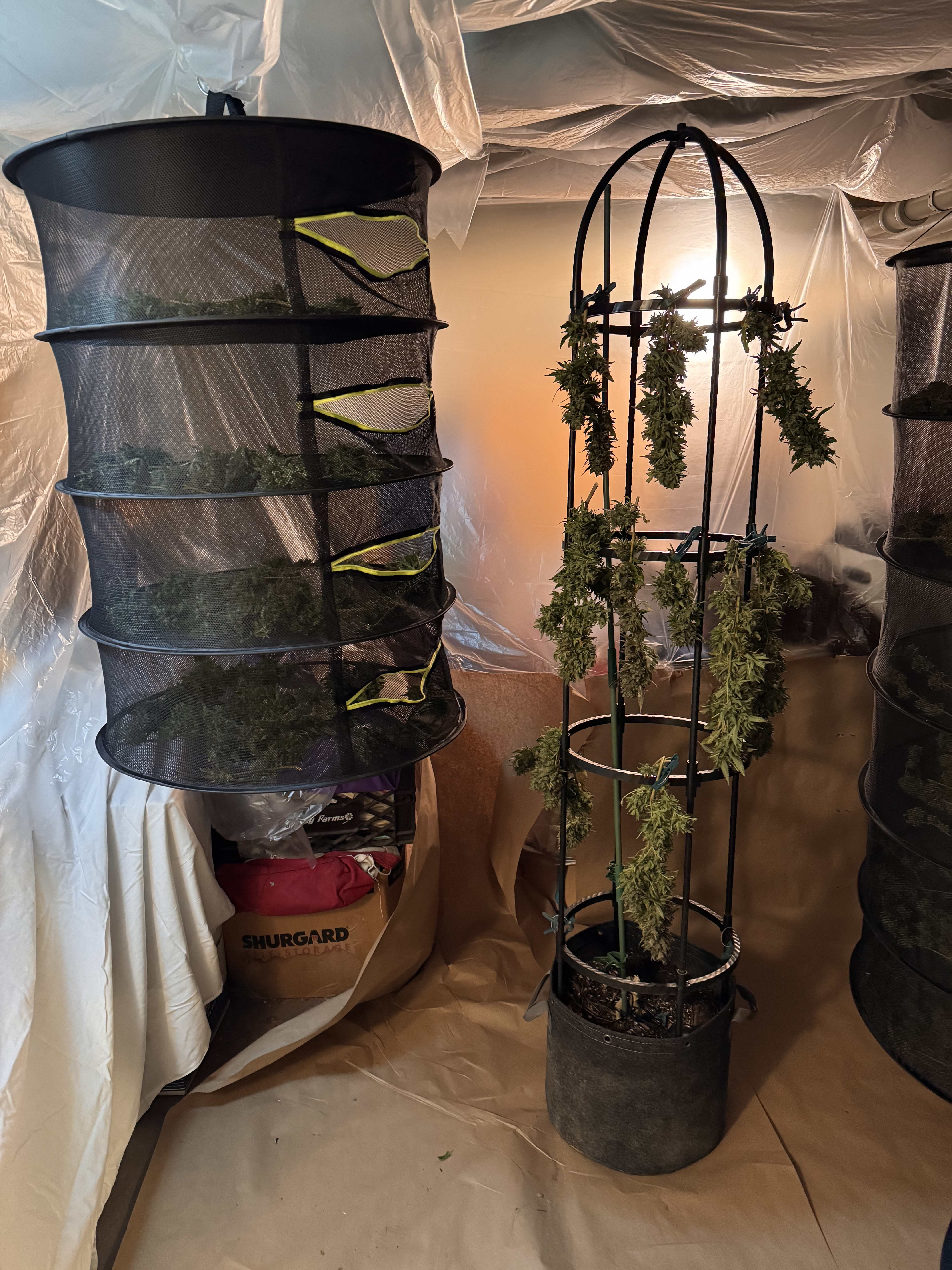 The girls have moved! I found someone on my community listserv who “adopted” the plants. She grew last year with the help of a friend, who sadly is no longer with us. They grew, dried, cured, the whole shebang at her place. A big sunny, private yard too! And she lives less than .5 miles from me (as the crow flies) so not too inconvenient for me to visit every day if I need too.