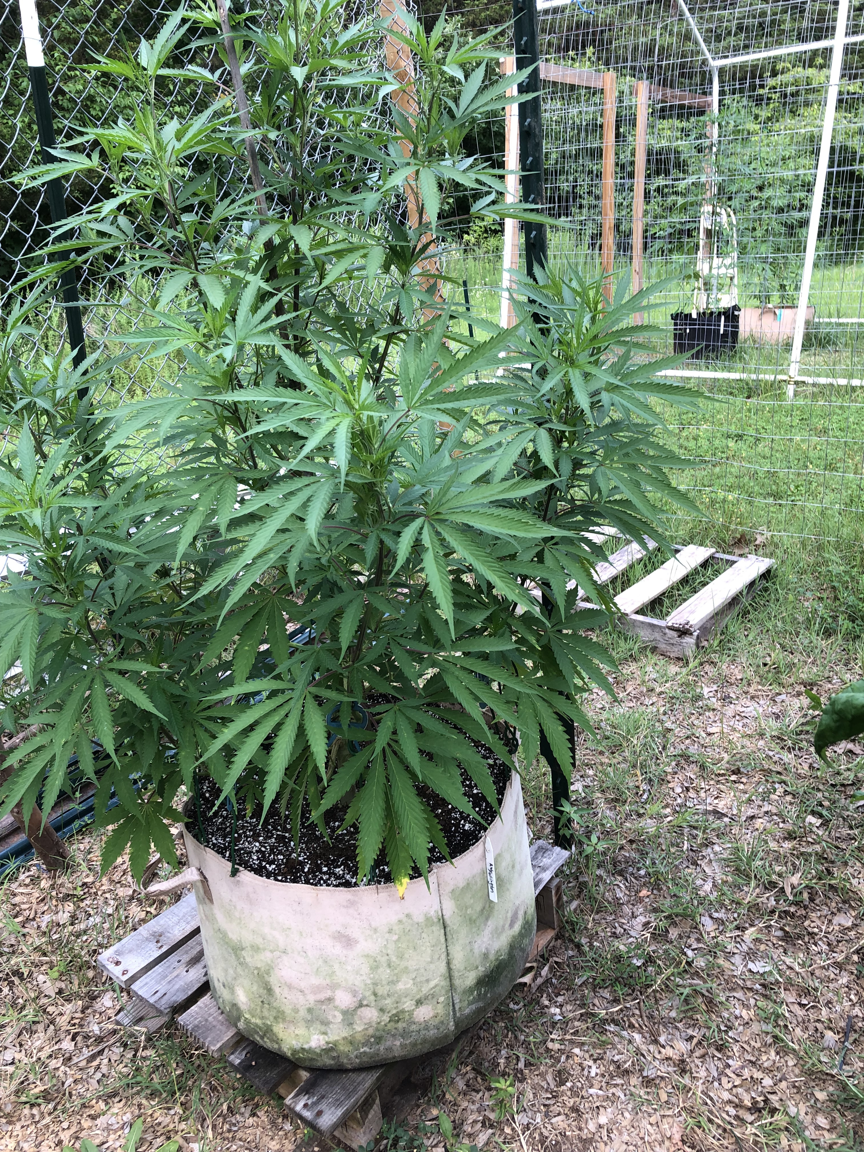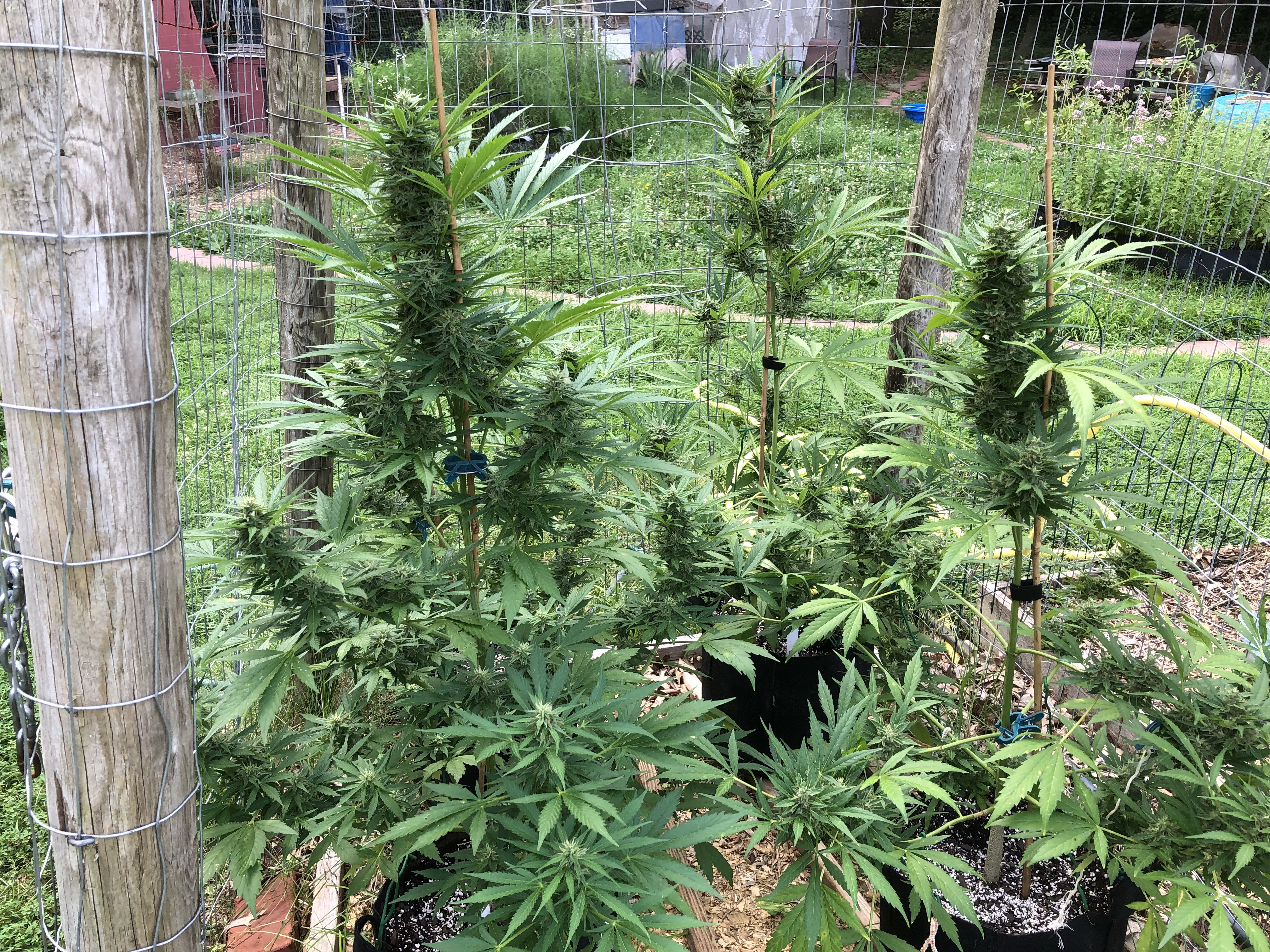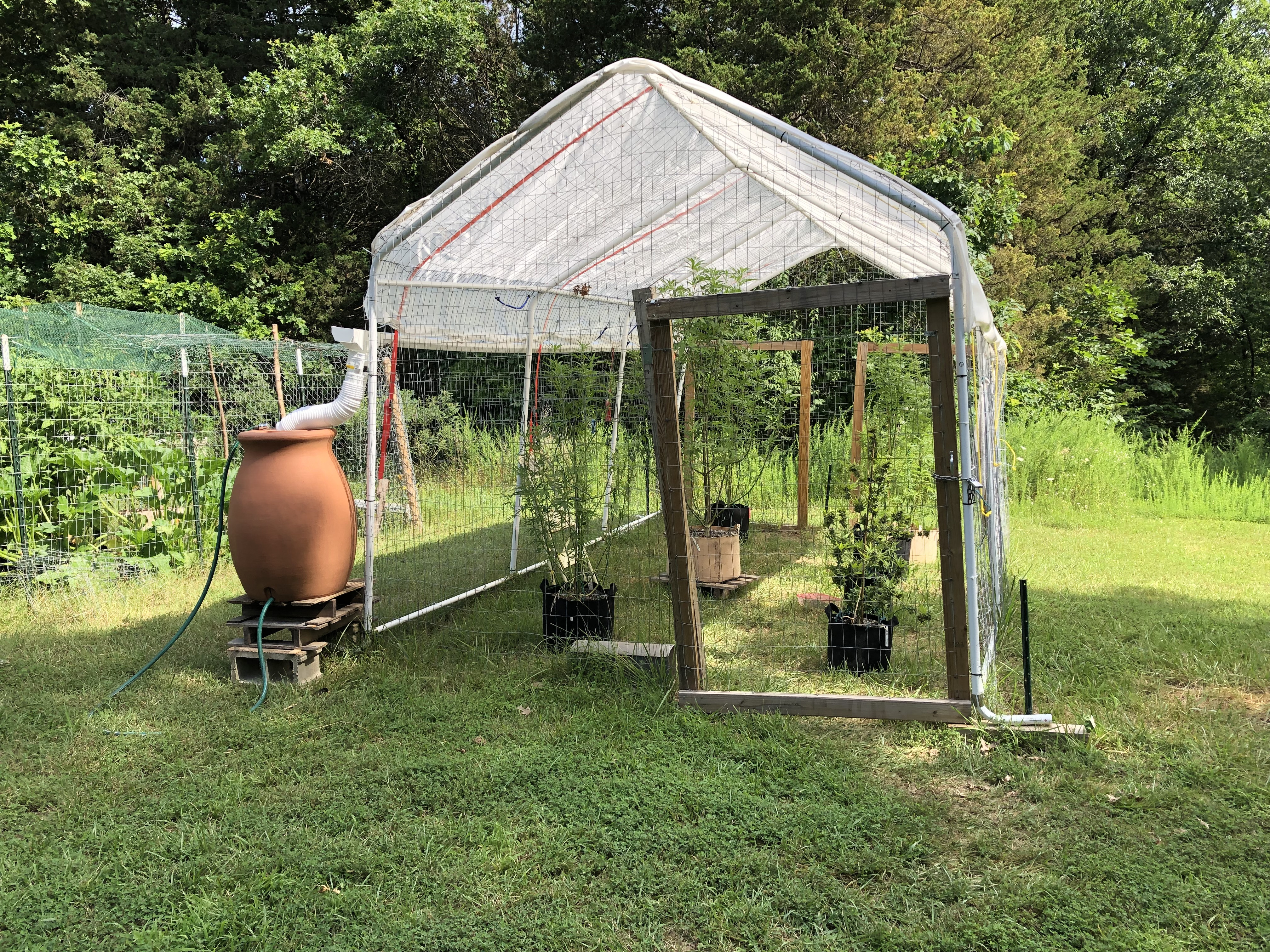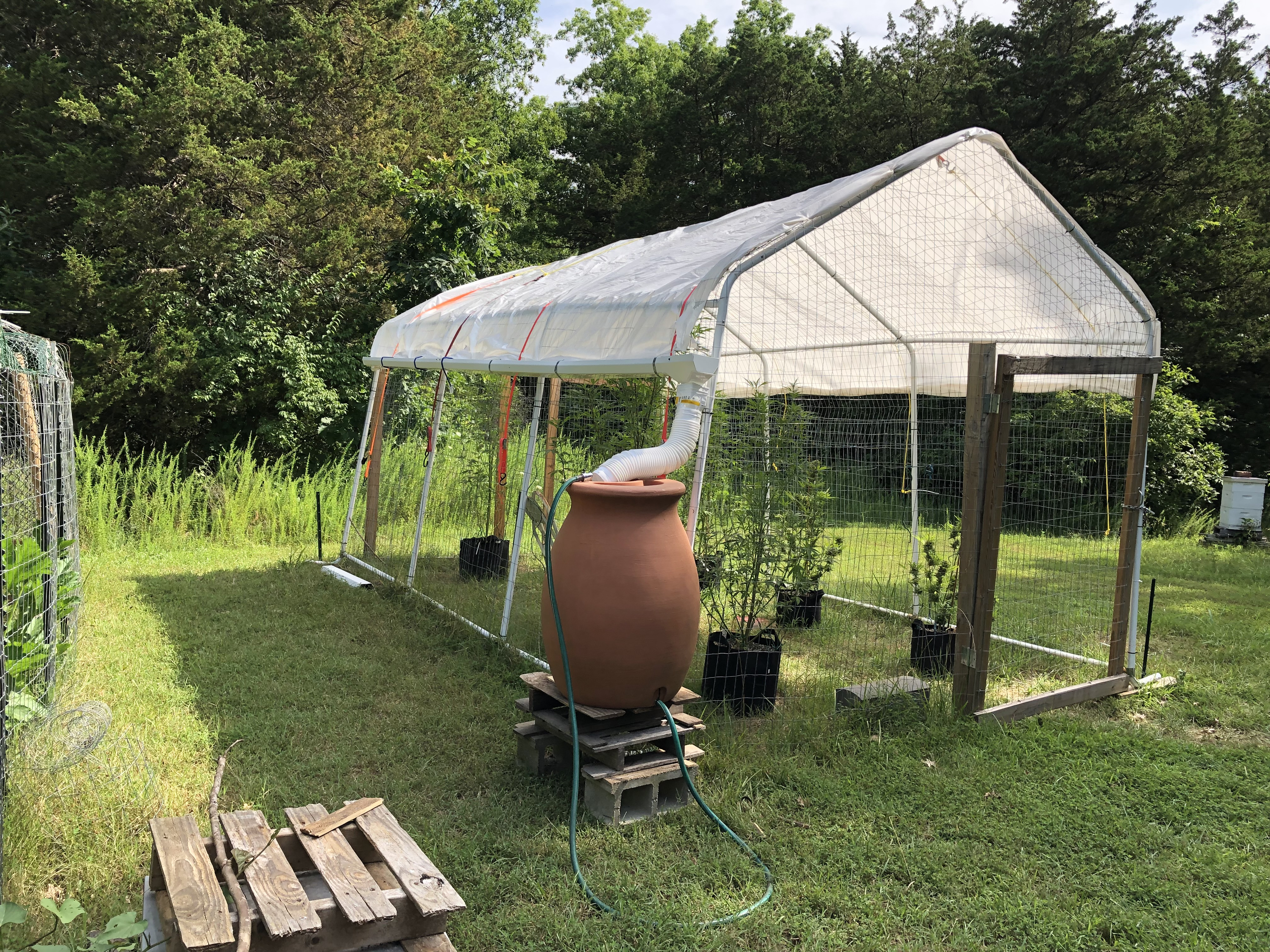 Finally got my grow pen done added the plastic roof,gutter and rain barrel.. hope to add another gutter and barrel to the other side .